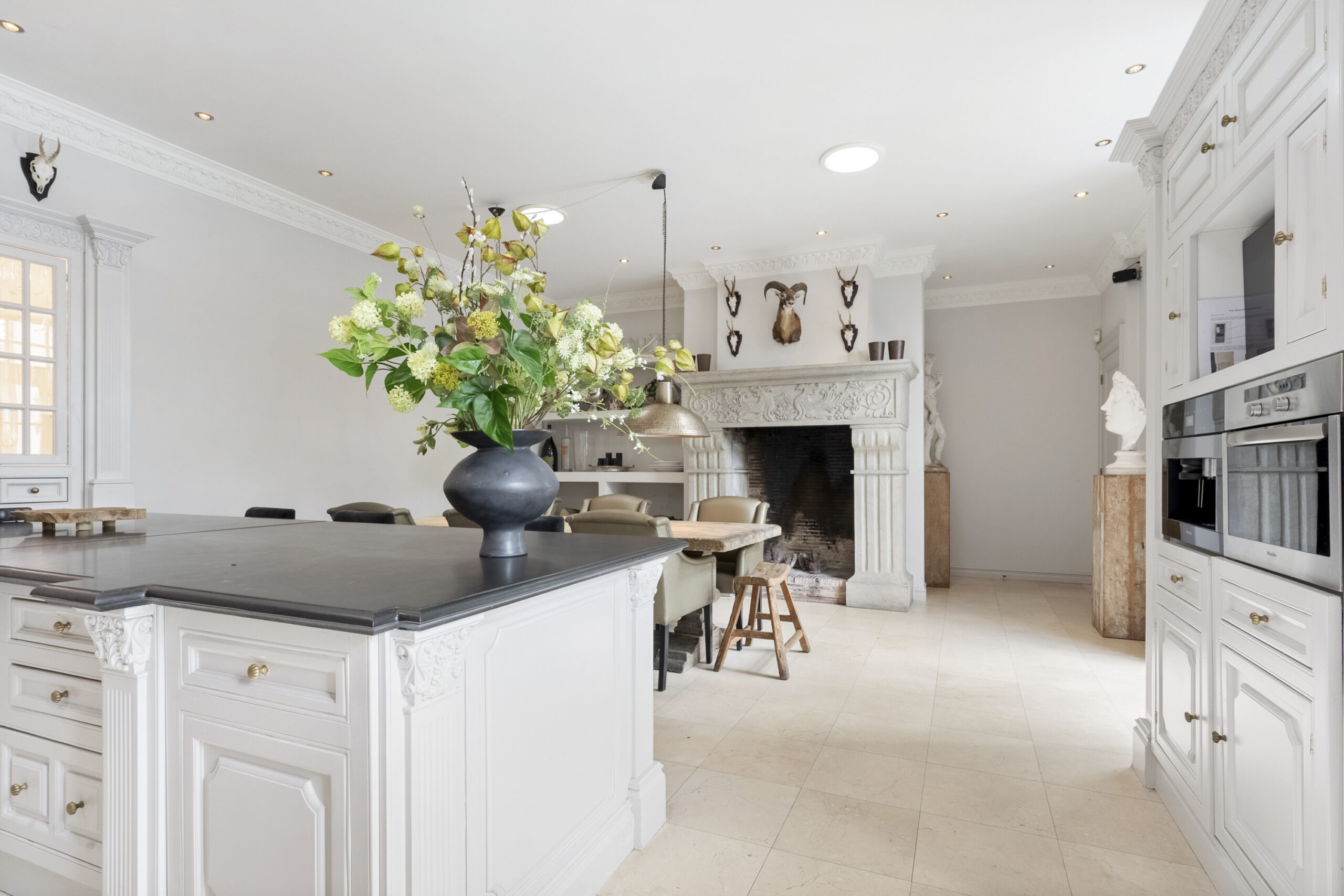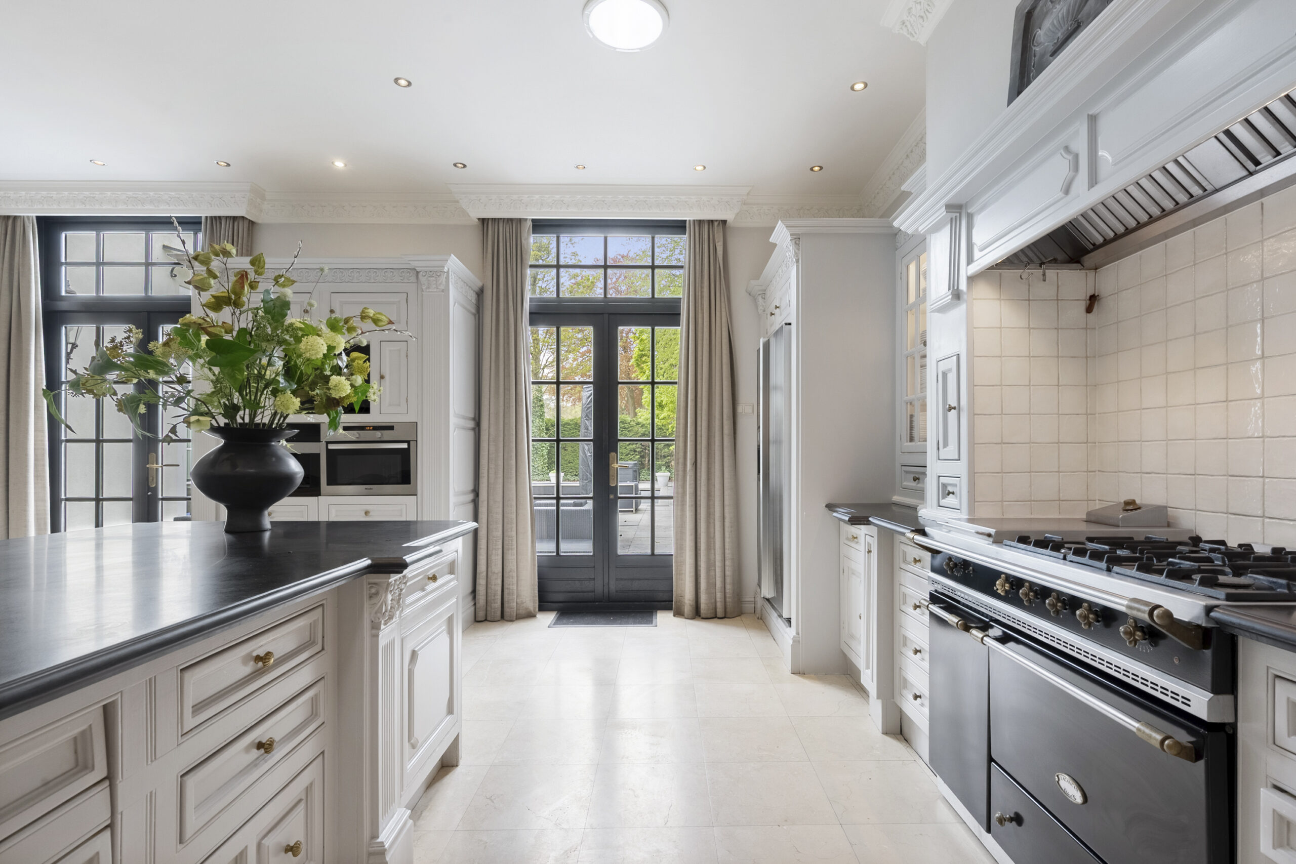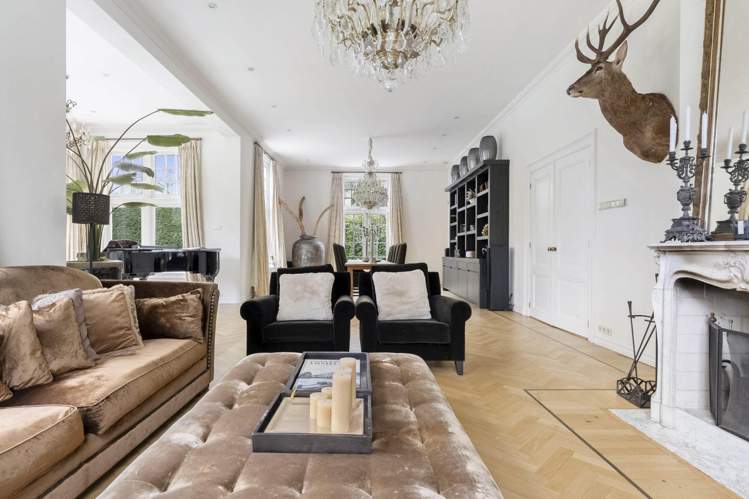 Parterre: entree, vestibule voorzien van zitbank en zeer royaal modern zwevend toilet voorzien van meubel met fontein, hal met toegang naar kelder en deur naar tuin, zeer ruime en lichte woonkamer voorzien van visgraat parket vloer met bies, marmeren schouw met open haard, 2x openslaande deuren naar tuin en openslaande deuren naar hal, landelijke woonkeuken voorzien van diverse inbouwapparatuur, Amerikaanse koelkast, Lacanche gasfornuis met 2 ovens en extra frituur, zeer hoge natuurstenen schouw met open haard, 4 lichtkoepels en 2x openslaande deuren naar tuin, werkkamer met vaste kastenwanden, extra zijraam en visgraat parket vloer met bies, thuisbioscoop voorzien van visgraat parket vloer met bies, 2e hal met diverse garderobes, 2e toilet met fontein en toegang naar zeer riante berging met openslaande deuren naar oprit en deur naar tuin, via hal bordestrap naar….
