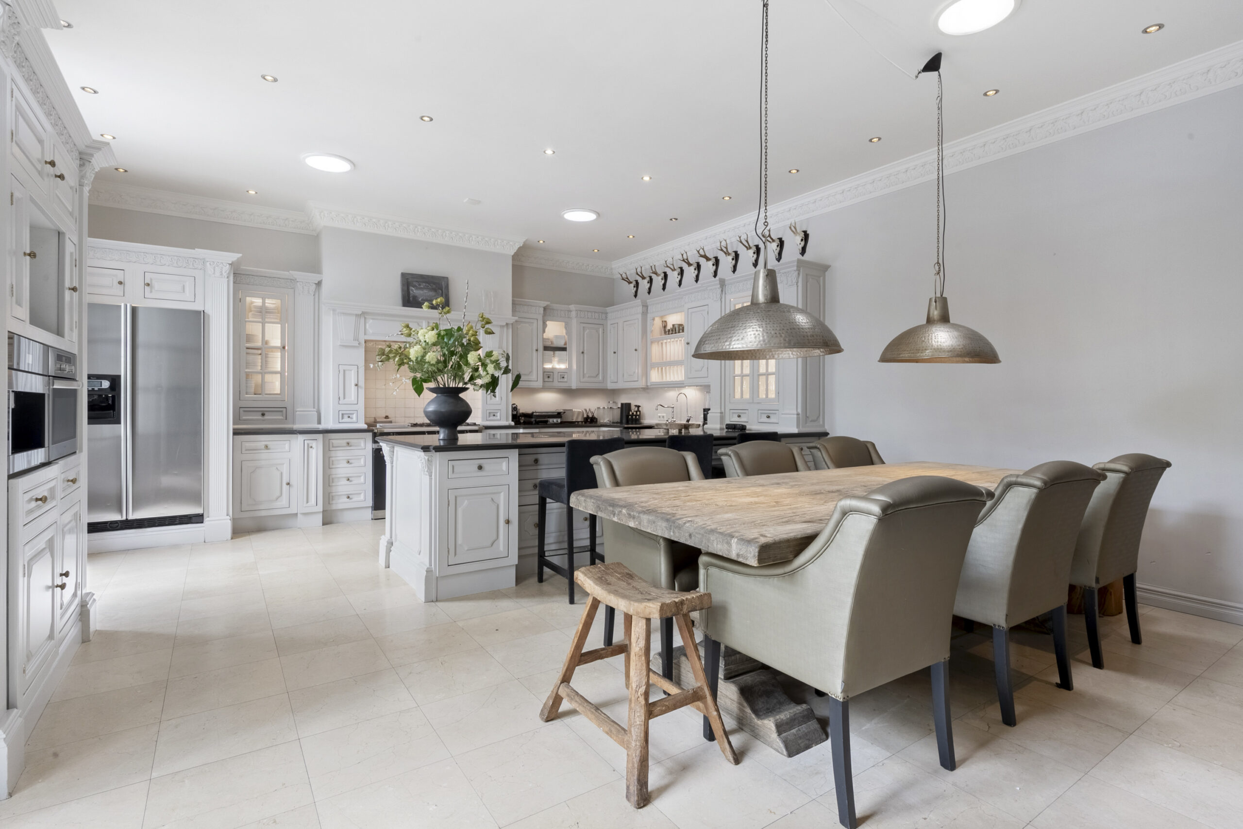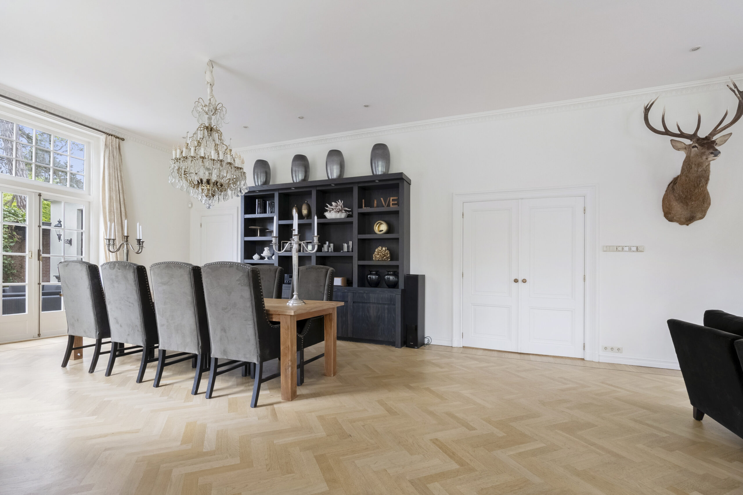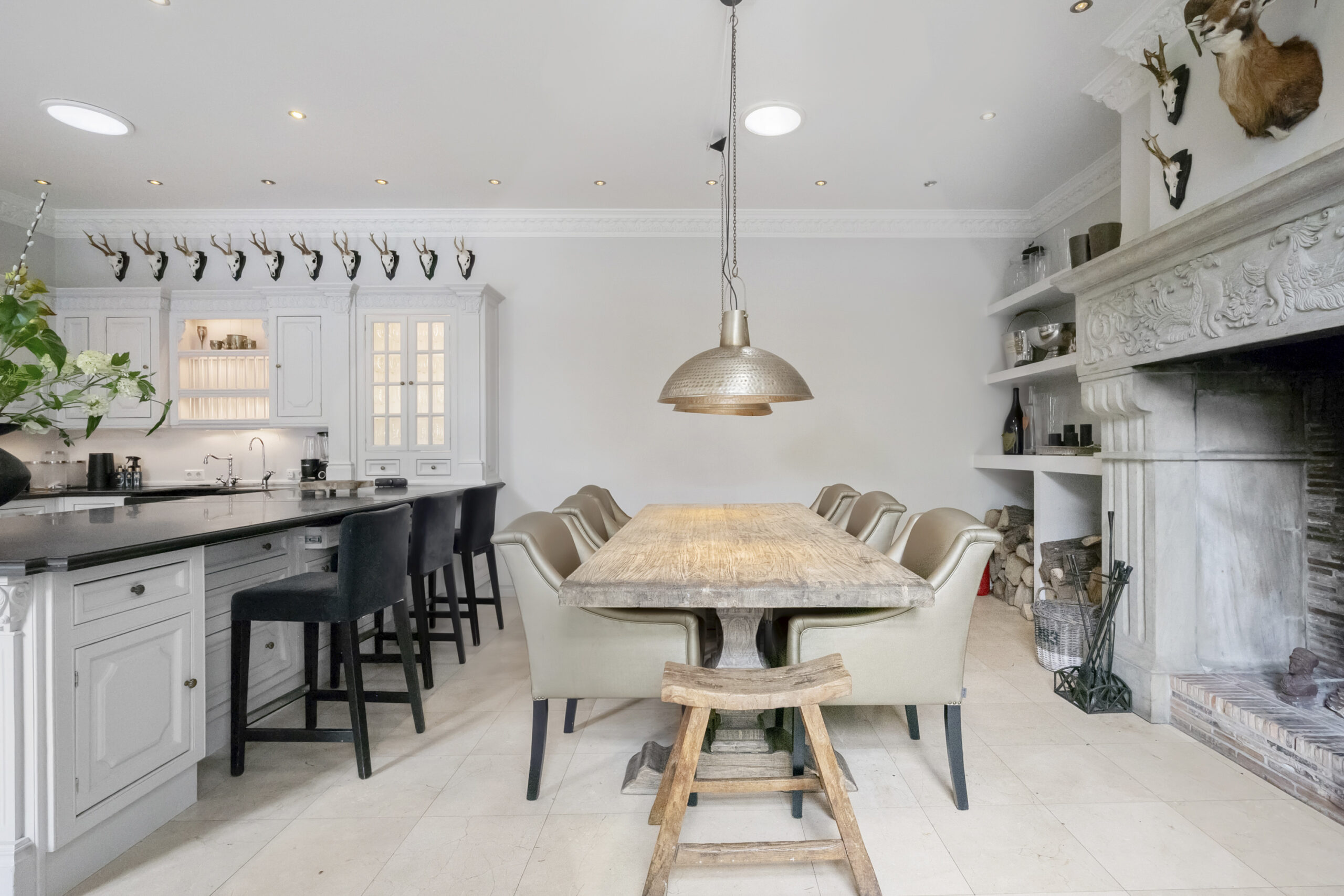 Parterre: entree, vestibule voorzien van zitbank en zeer royaal modern zwevend toilet voorzien van meubel met fontein, hal met toegang naar kelder en deur naar tuin, zeer ruime en lichte woonkamer voorzien van visgraat parket vloer met bies, marmeren schouw met open haard, 2x openslaande deuren naar tuin en openslaande deuren naar hal, landelijke woonkeuken voorzien van diverse inbouwapparatuur, Amerikaanse koelkast, Lacanche gasfornuis met 2 ovens en extra frituur, zeer hoge natuurstenen schouw met open haard, 4 lichtkoepels en 2x openslaande deuren naar tuin, werkkamer met vaste kastenwanden, extra zijraam en visgraat parket vloer met bies, thuisbioscoop voorzien van visgraat parket vloer met bies, 2e hal met diverse garderobes, 2e toilet met fontein en toegang naar zeer riante berging met openslaande deuren naar oprit en deur naar tuin, via hal bordestrap naar….
