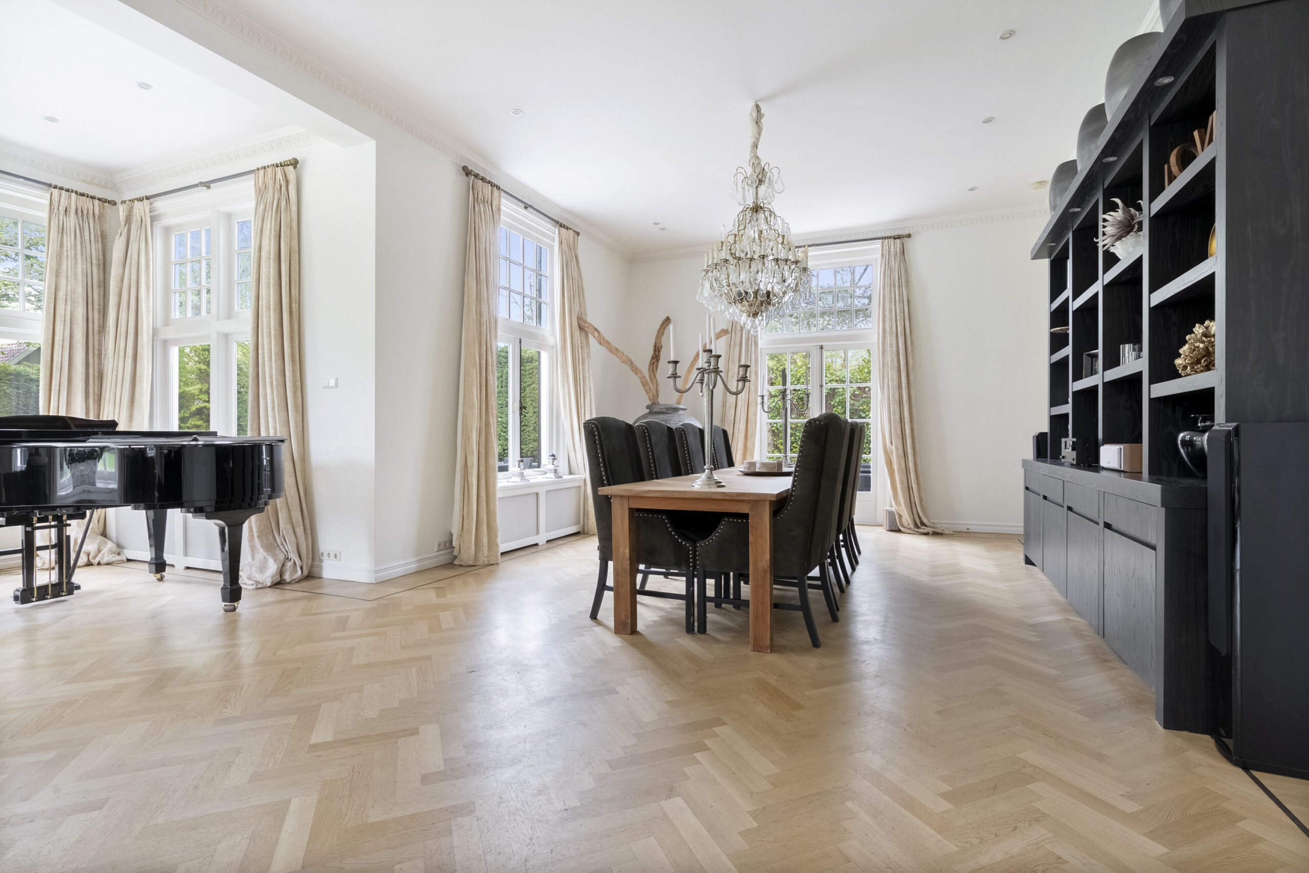 Zo heb je op de parterre een zeer riante woonkamer, een werk-/studeerkamer, een thuisbioscoop en een landelijke woonkeuken. De 1e verdieping bestaat uit 4 slaapkamers en een royale badkamer. Op de 2e verdieping zijn nog eens 4 slaapkamers, een waskamer en een 2e badkamer te vinden. Zowel in de aangebouwde berging, op de zolder en in de kelder heb je volop bergruimte. Kortom ruimte genoeg voor iedereen.