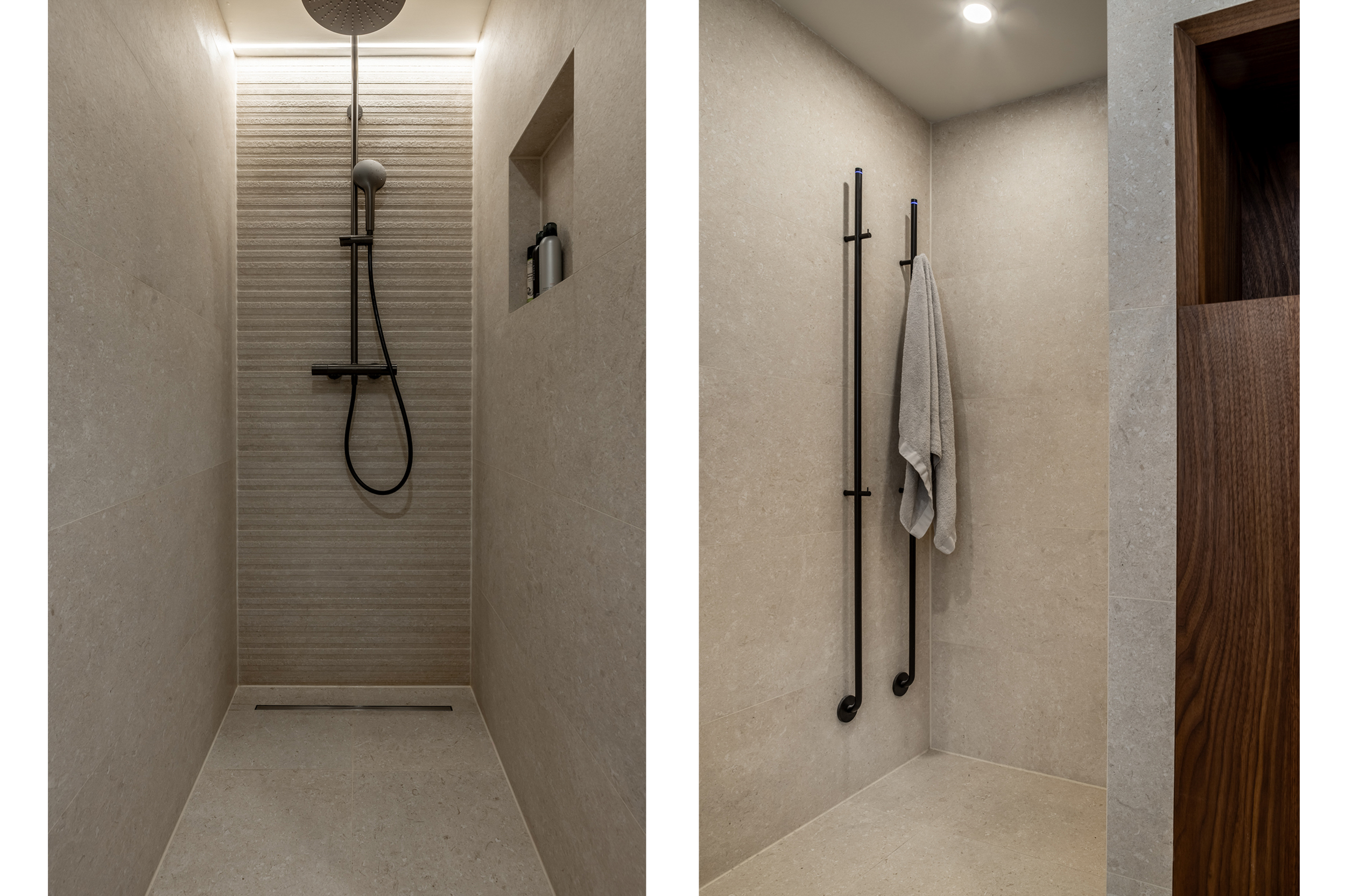 Via de woonkamer is een tweede hal te bereiken waar zich de badkamer en twee slaapkamers bevinden. De hoogwaardig afgewerkte badkamer is voorzien van een inloopdouche, dubbel wastafelmeubel, opstelling voor was-/drogercombinatie en twee elektrische handdoekenradiatoren.