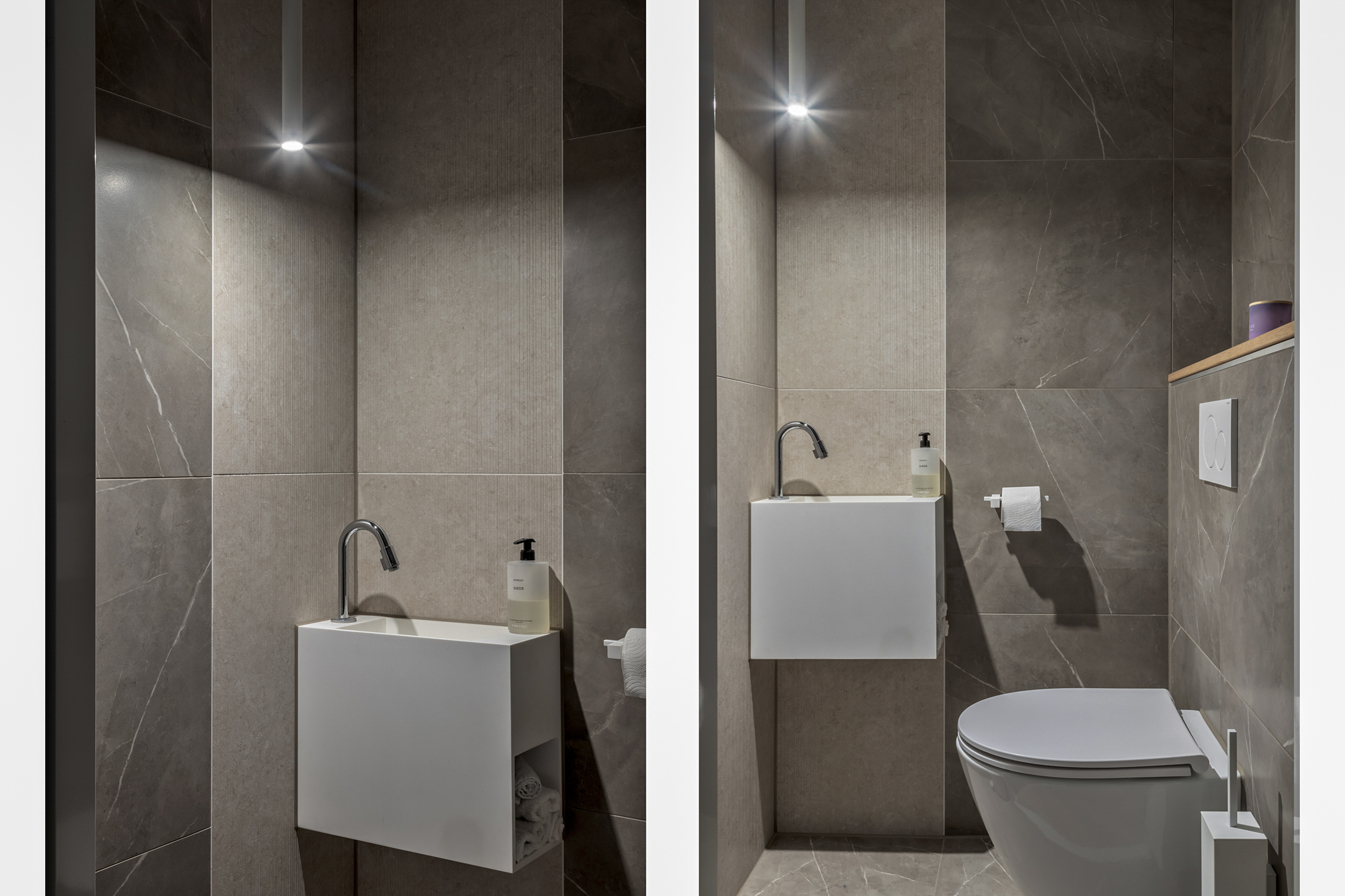 Entree in ruime hal. In de hal bevinden zich het toilet met fontein, een nis waar plaats is voor jassen, een inbouwkast en de meterkast. Via de hal zijn de keuken en woonkamer te bereiken.