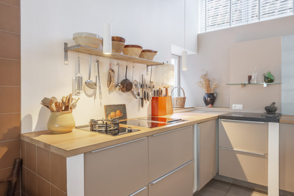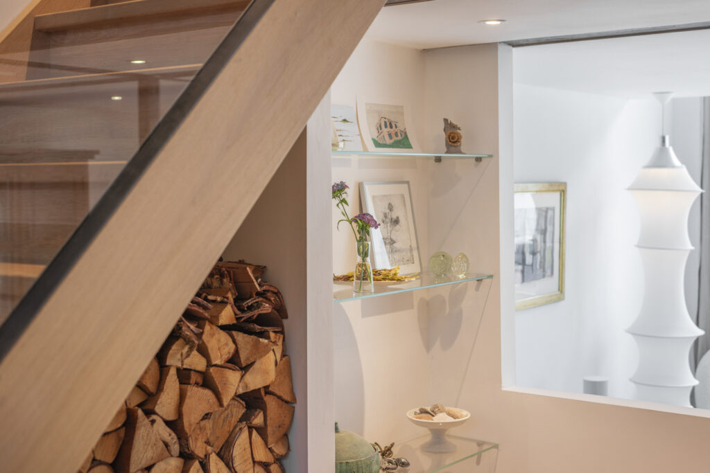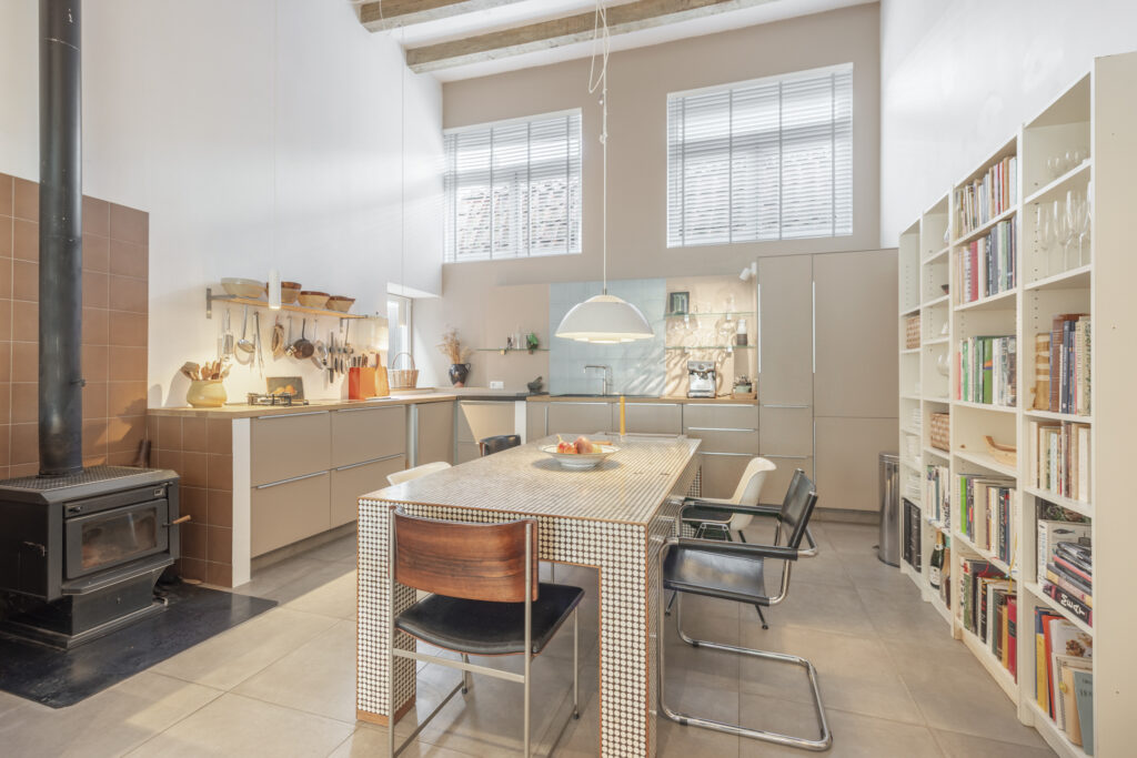 Op de begane grond bevindt zich een royale zitkamer met openslaande deuren naar de straatzijde, waardoor het daglicht rijkelijk binnenvalt. Aan de achterzijde ligt de ruime woonkeuken — het warme hart van het huis — met een sfeervolle houtkachel en een zijraam dat zorgt voor extra licht en contact.