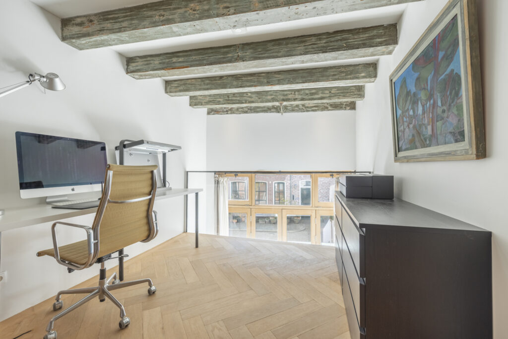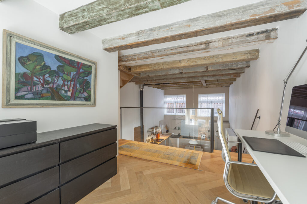 De entresol is ingericht als prettige werkruimte. Op deze verdieping vindt u tevens een badkamer met ligbad, toilet en wastafel.
