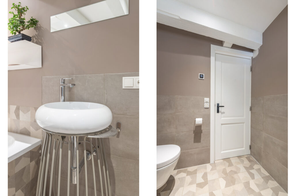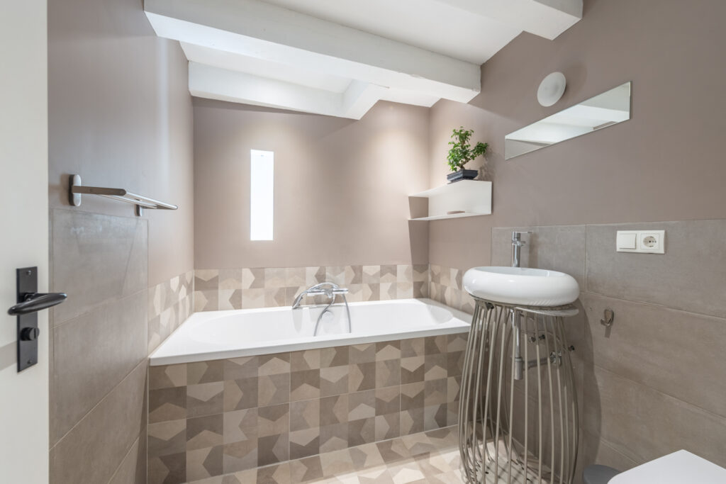 De eerste verdieping herbergt een riante slaapkamer met aangrenzende tweede badkamer voorzien van inloopdouche, toilet en wastafel. De aansluitingen voor wasmachine en droger zijn fraai weggewerkt in een vaste kastenwand.