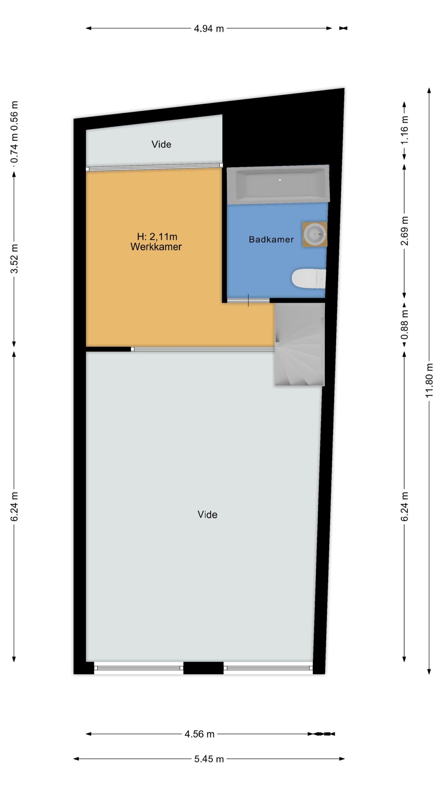 Above the kitchen, a mezzanine has been created, open to the space below; ideal as a home office or an additional seating area. The mezzanine level also includes a bathroom with bathtub, toilet and washbasin.