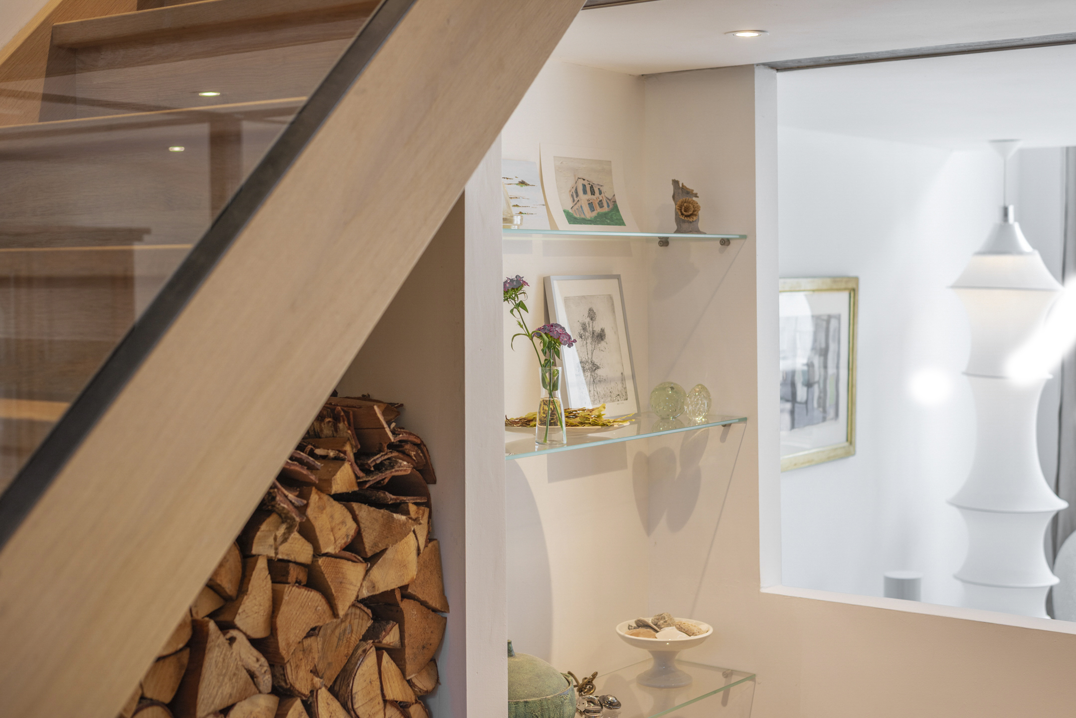 • Exposed beams, steel-framed doors, glass balustrades and oak staircase