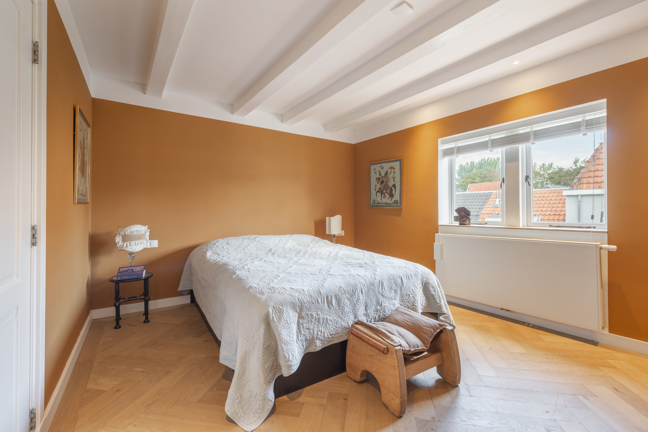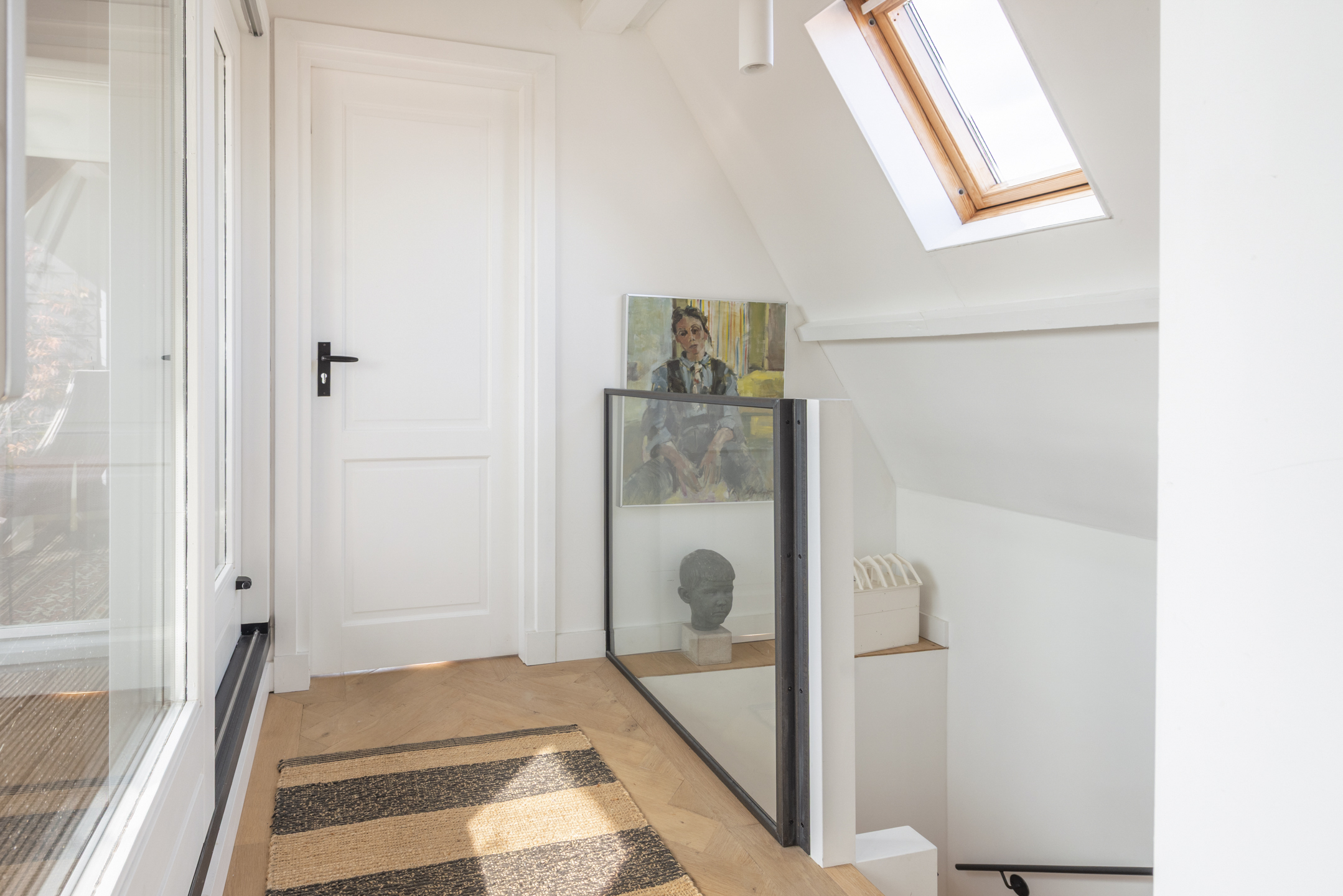 De bovenste verdieping beschikt over nog twee ruime sfeervolle (slaap/werk) kamers met de kenmerkende originele dakspanten, een separaat toilet en een loggia op het zuidoosten — een heerlijke plek om van de middagzon te genieten.