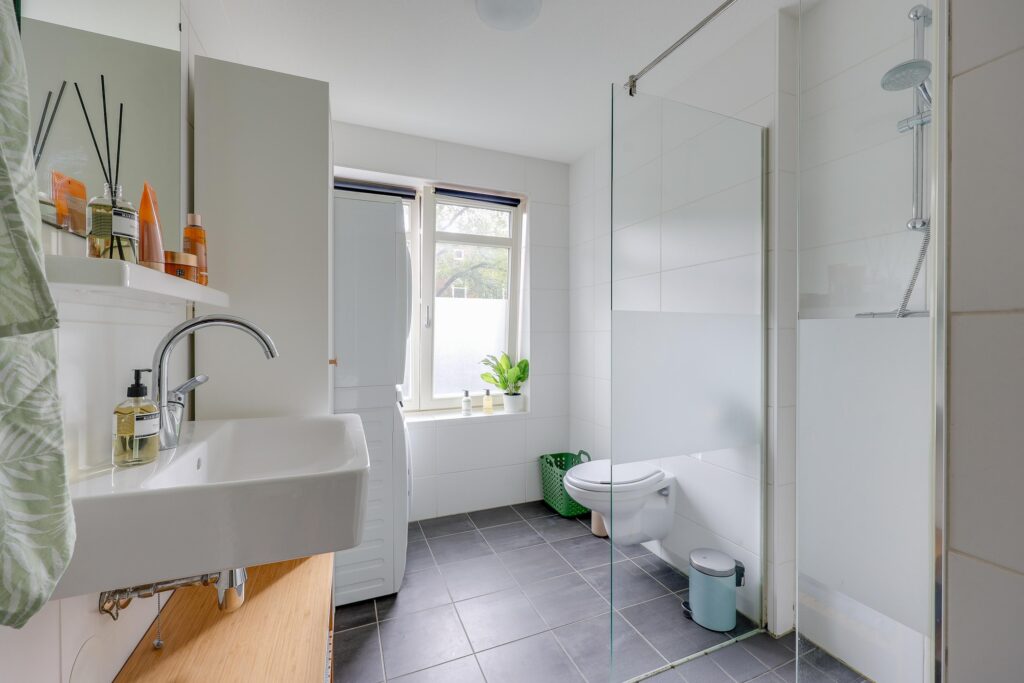 Aan de achterzijde van het appartement, grenzend aan de rustige binnentuinen, is de ruime slaapkamer gesitueerd met kledingkast. De badkamer bevindt zich aan de straatzijde en is voorzien van een inloopdouche, wastafel met meubel, toilet, handdoekradiator, met de aansluiting voor de wasmachine en droger.