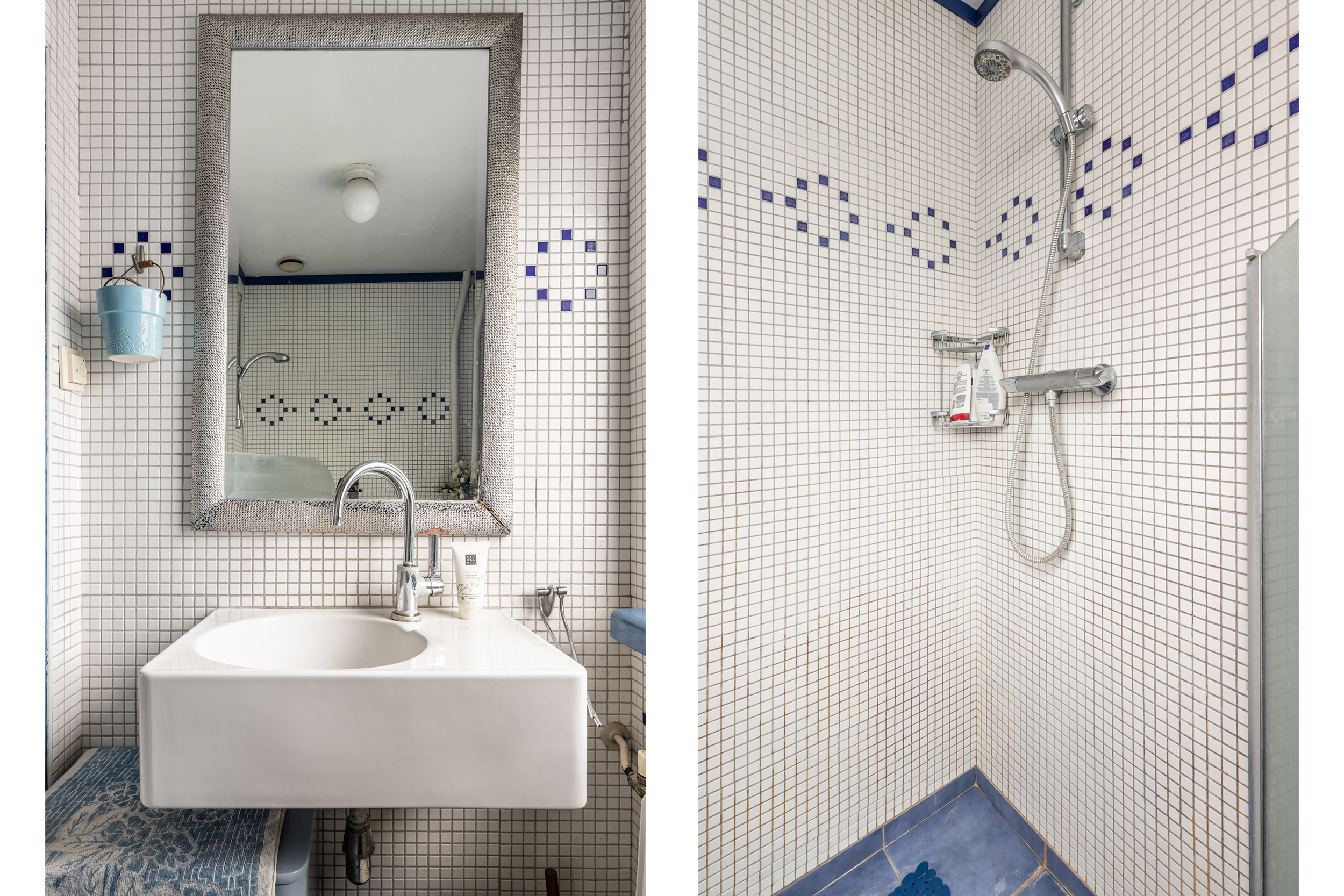 Eerste verdieping: Overloop met bergkast, grote slaapkamer aan de achterzijde met inbouwkasten, kleine slaapkamer achterzijde. Slaapkamer voorzijde met inbouwkasten. Badkamer met douche en fontein.