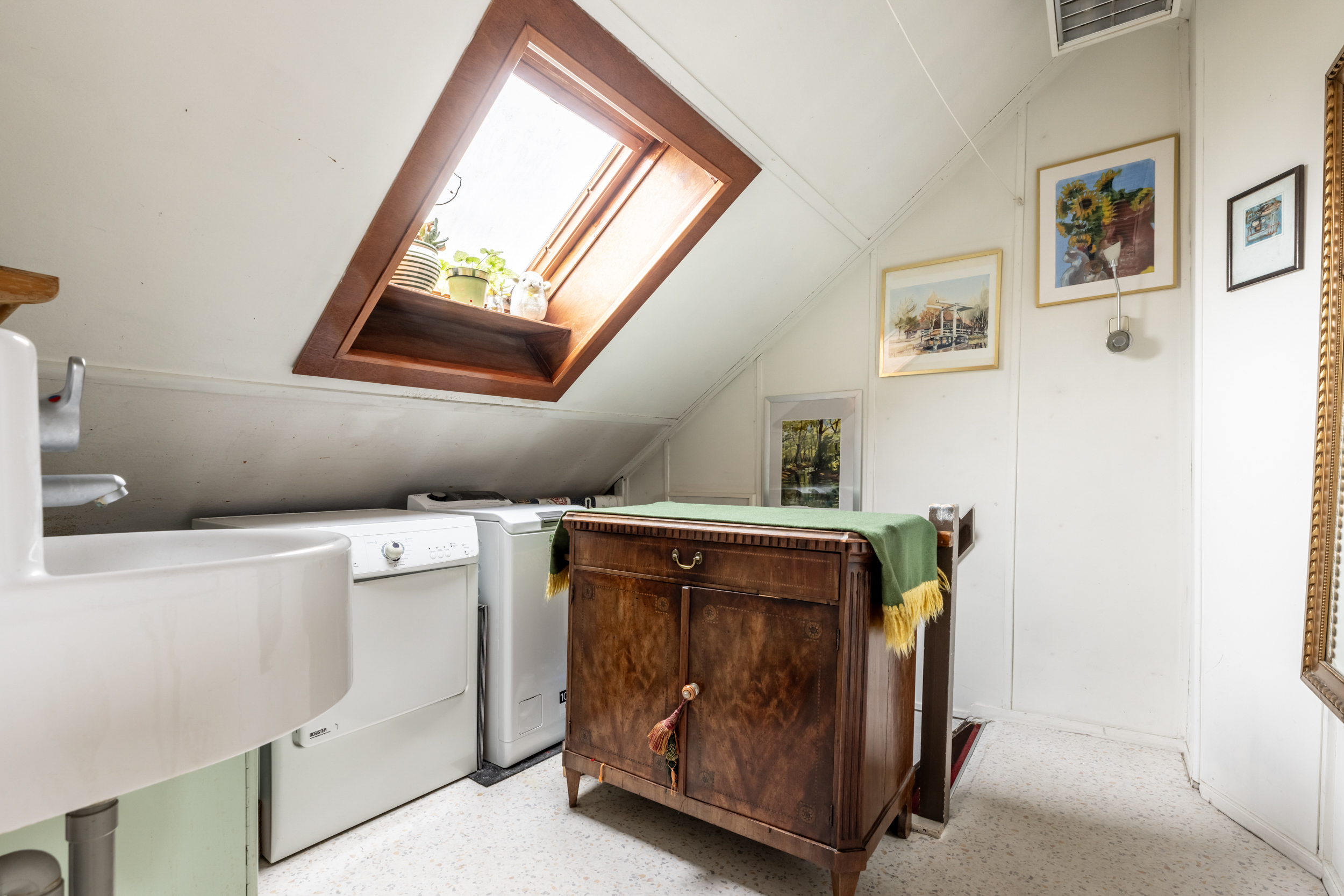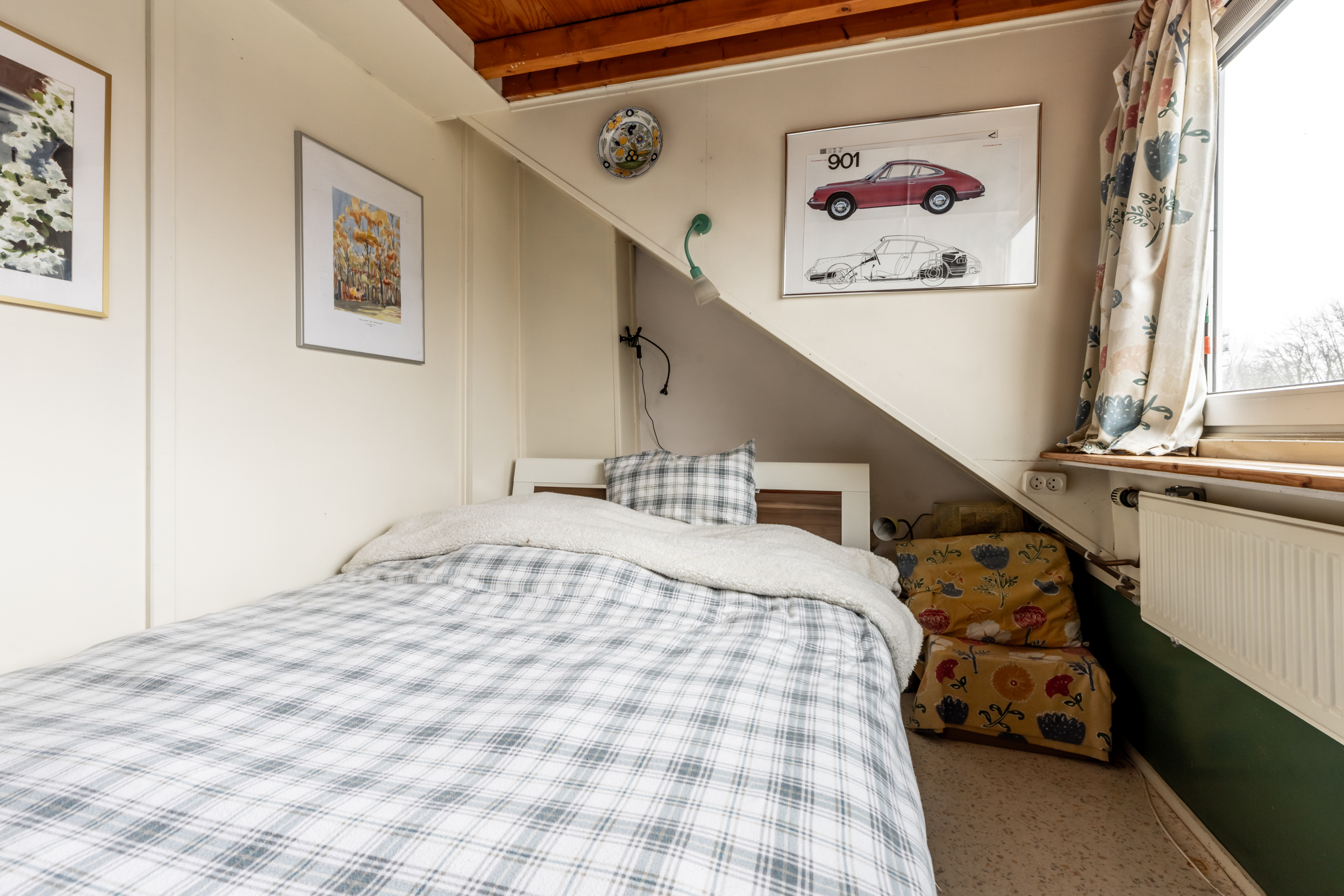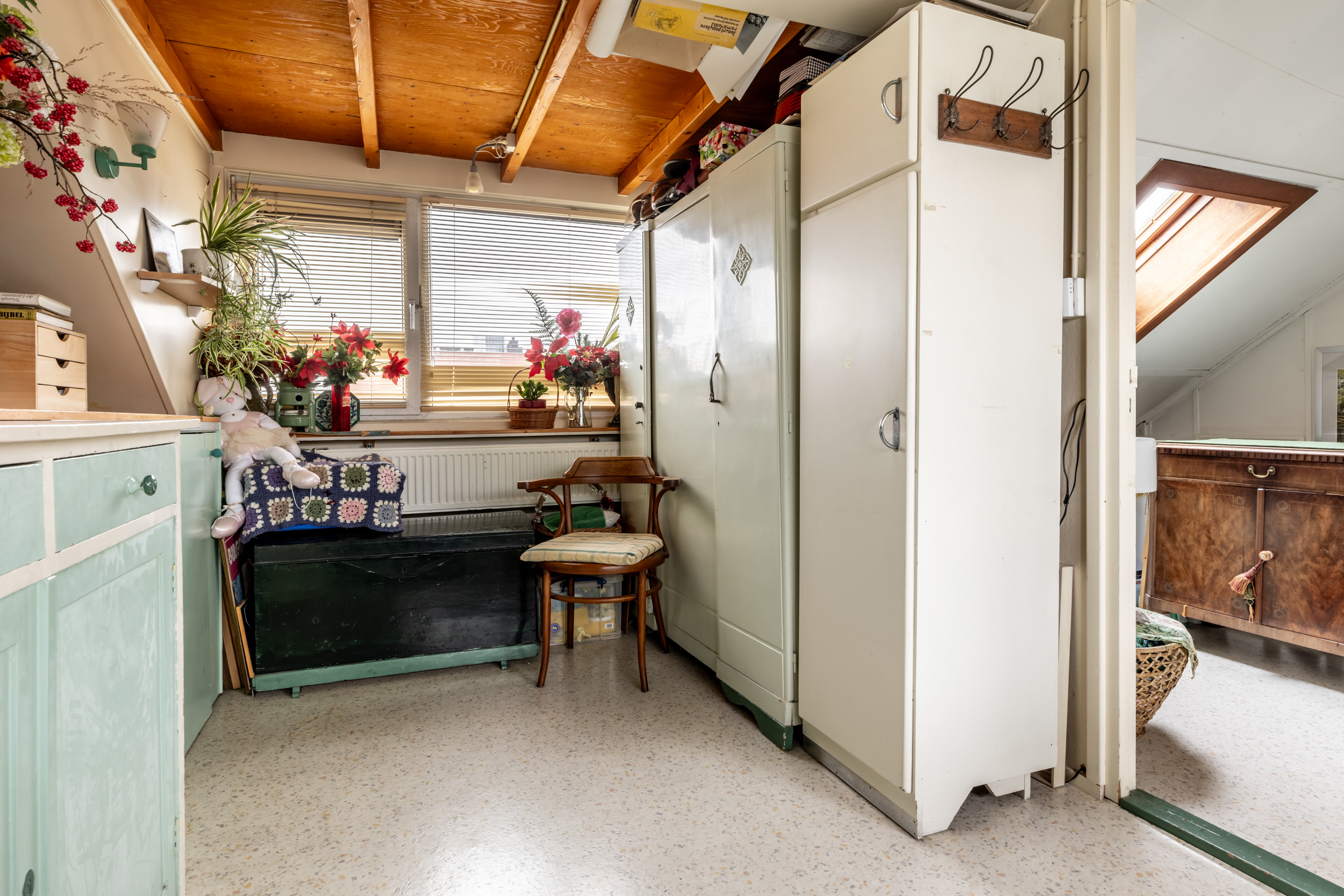 Tweede verdieping: Overloop met wasmachine/droger aansluiting en fonteintje. Ruime L-vormige slaapkamer met dakkapel over de gehele breedte aan de achterzijde.