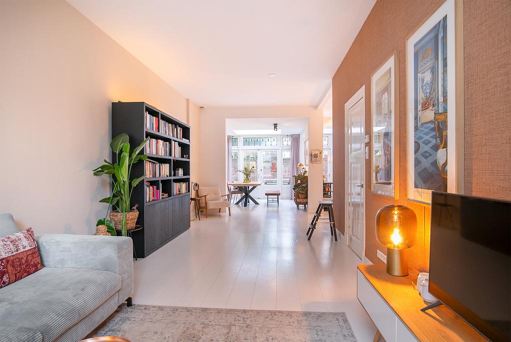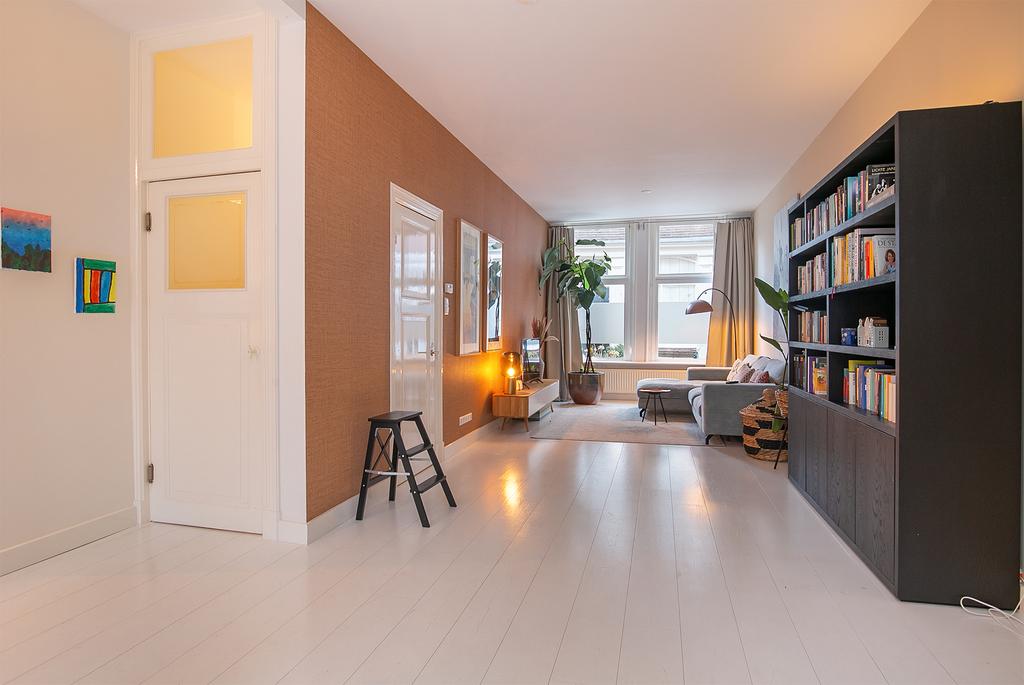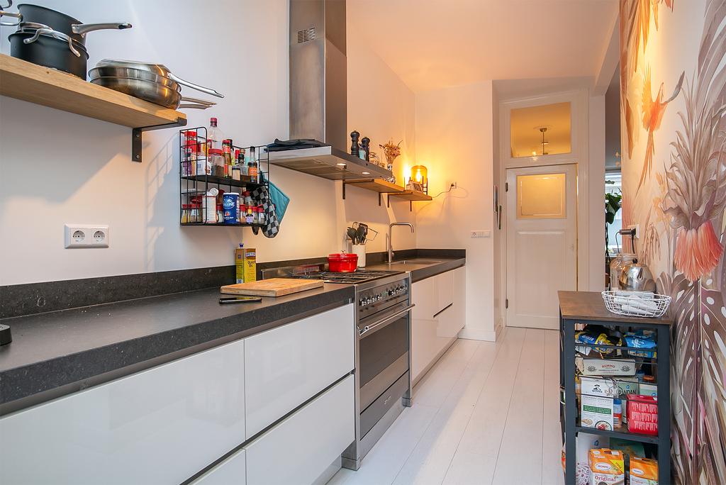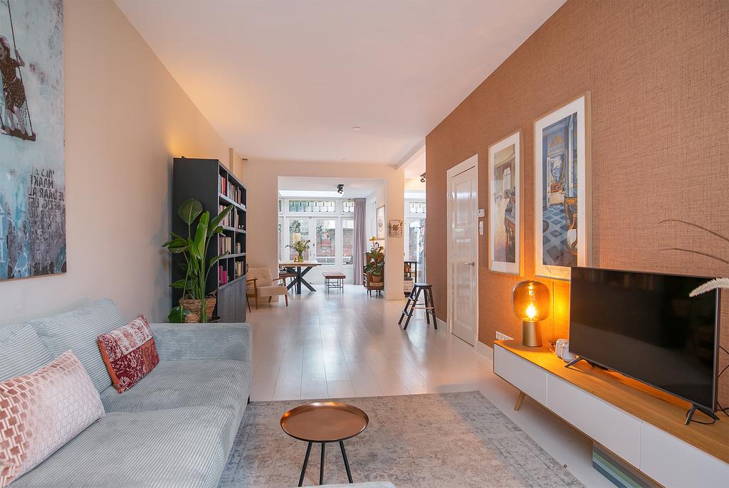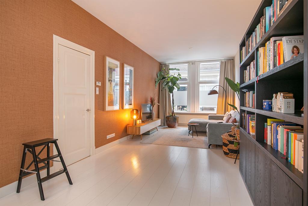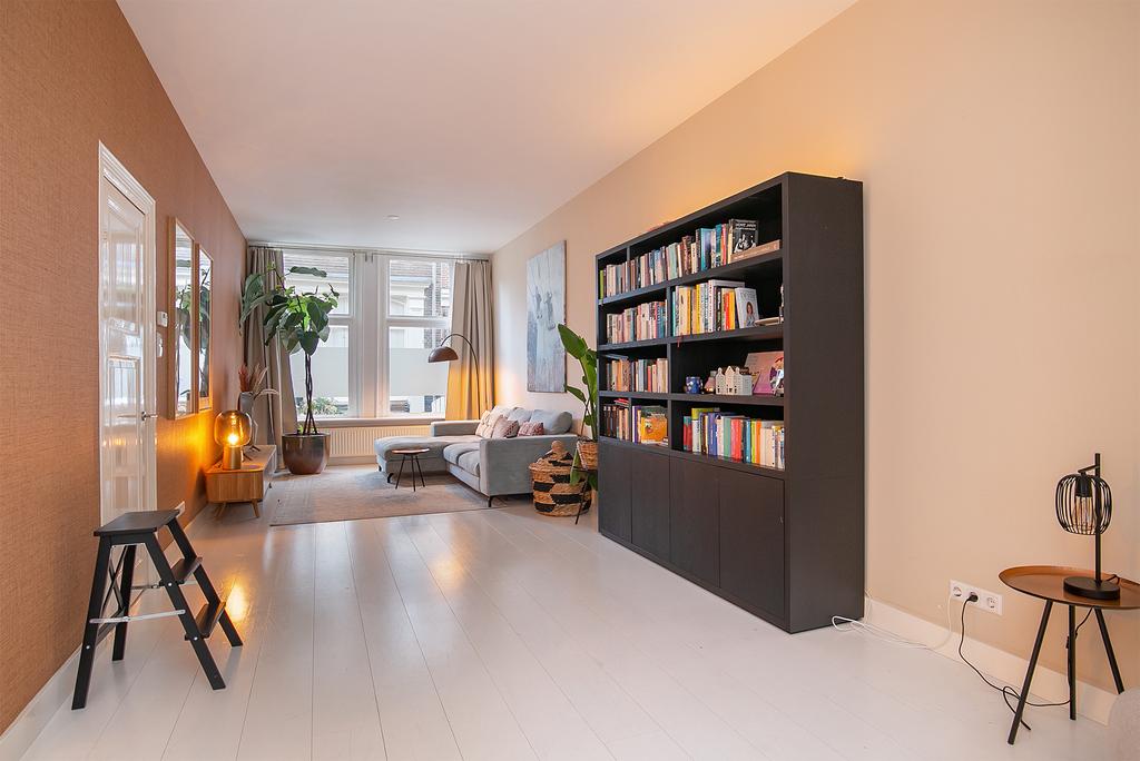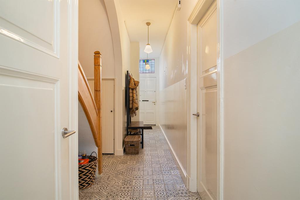 Begane grond: voordeur, hal met meterkast, trapkast, wasmachine aansluiting onder de trap, ruim toilet met fontein en CV-kast. Riante en uitgebouwde woonkamer met hoge plafonds, luxe open keuken met RVS fornuis (90 cm). Aan de achterzijde een grote lichtstraat en openslaande deuren naar de tuin. Stadstuin op het westen.