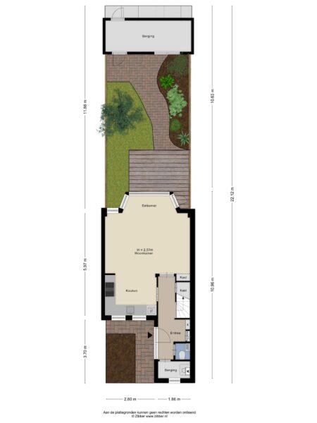 * Zonnige achtertuin met grote berging en achterom