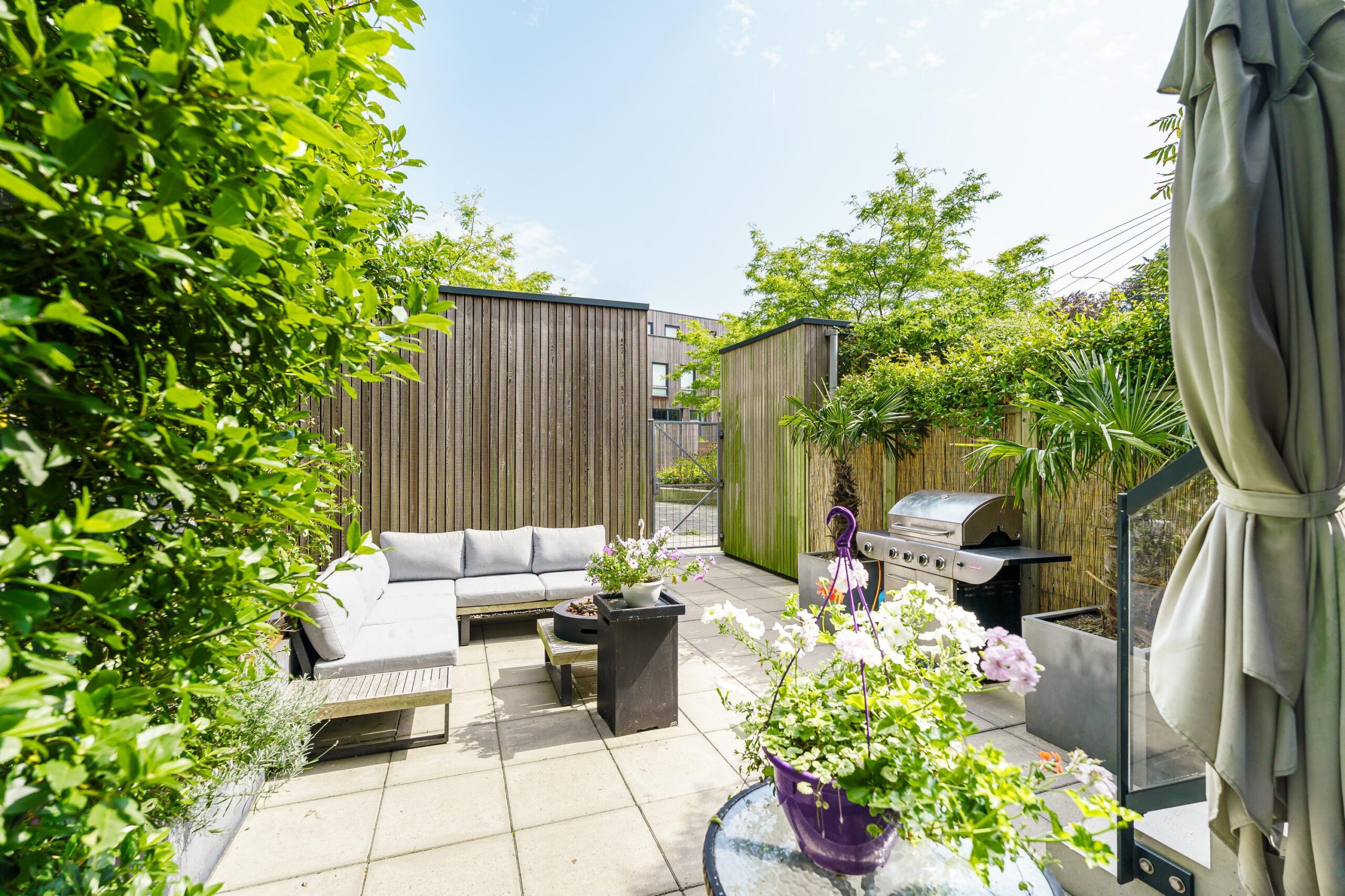 De zonnige tuin met vrijstaande berging en een achterom grenst direct aan een fraai ingericht en afgesloten binnenterrein waar je heerlijk rustig kunt zitten en welke ook zeer kindvriendelijk is en direct toegang geeft naar de ondergelegen parkeerkelder. Voor de deur geniet je tot laat in de avond met een hapje en een drankje van de ondergaande zon. In de afgesloten parkeergarage heb je een eigen parkeerplaats.