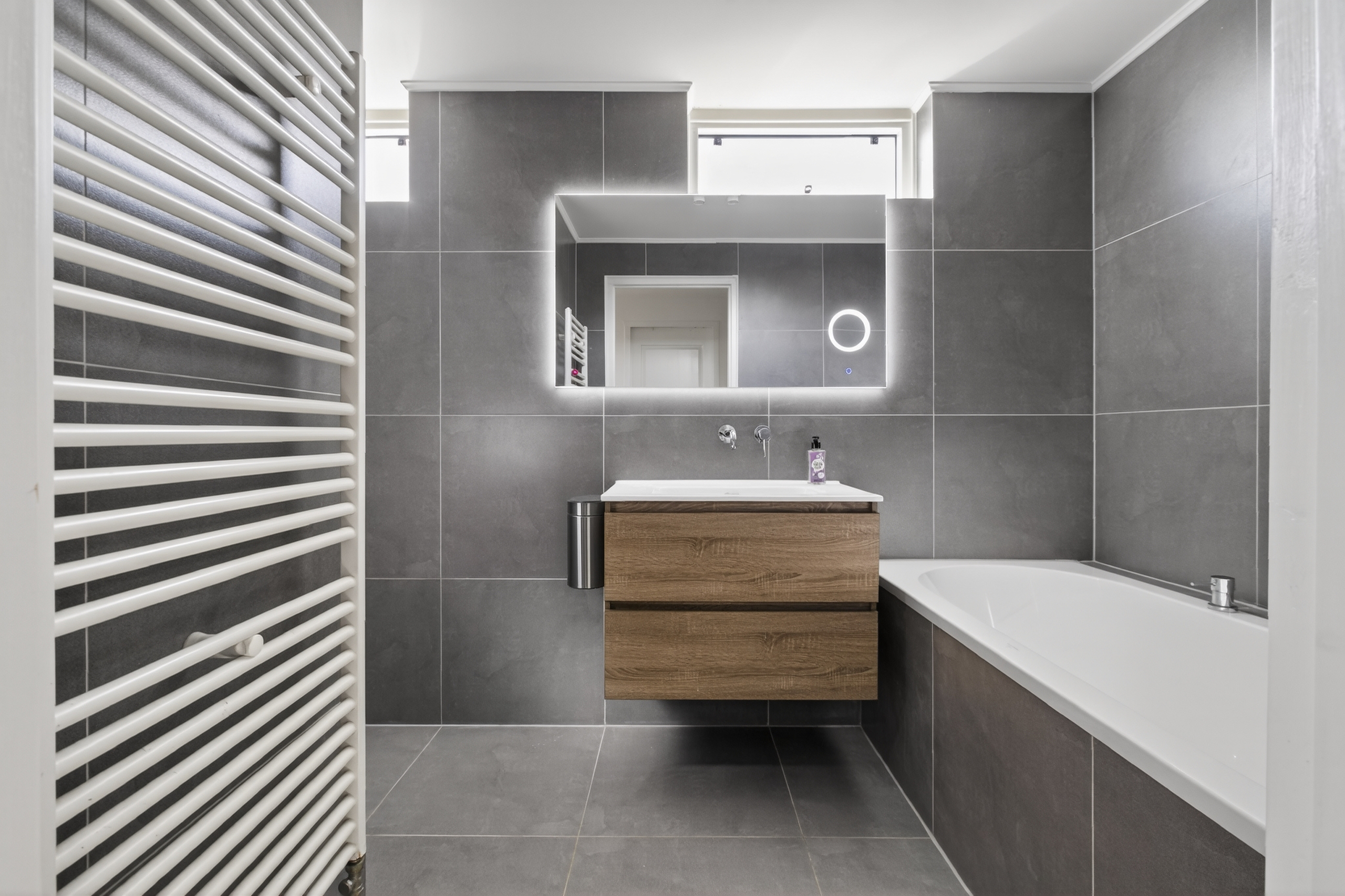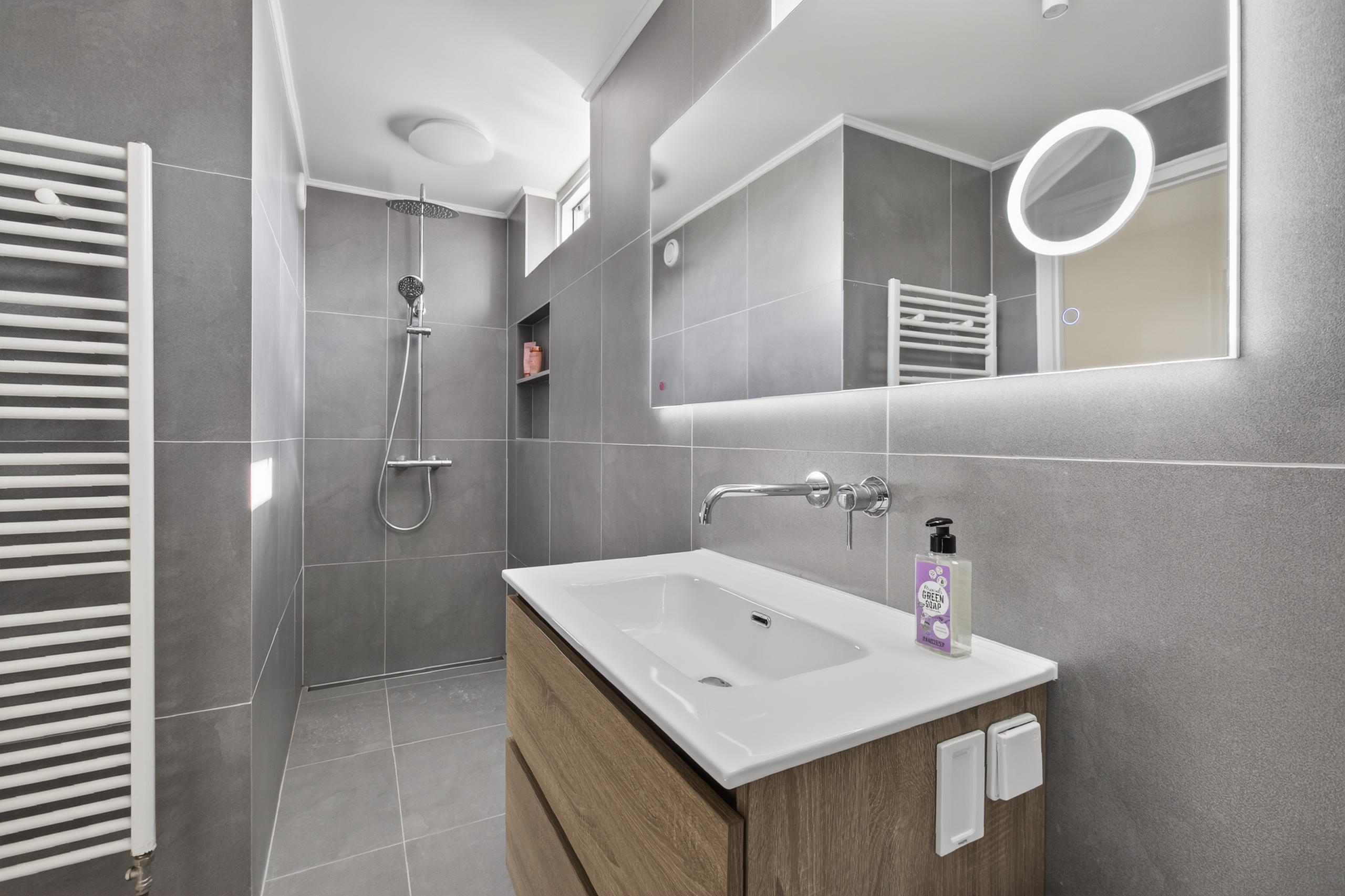 Aan de rechterzijde van de hal bevindt zich een royaal washok met voldoende ruimte voor een wasmachine, droger en extra opslag. Daarnaast ligt de badkamer, die is voorzien van een inloopdouche, een ligbad, een wastafel met wastafelmeubel en een handdoekradiator. Separaat in de hal bevindt zich het toilet.