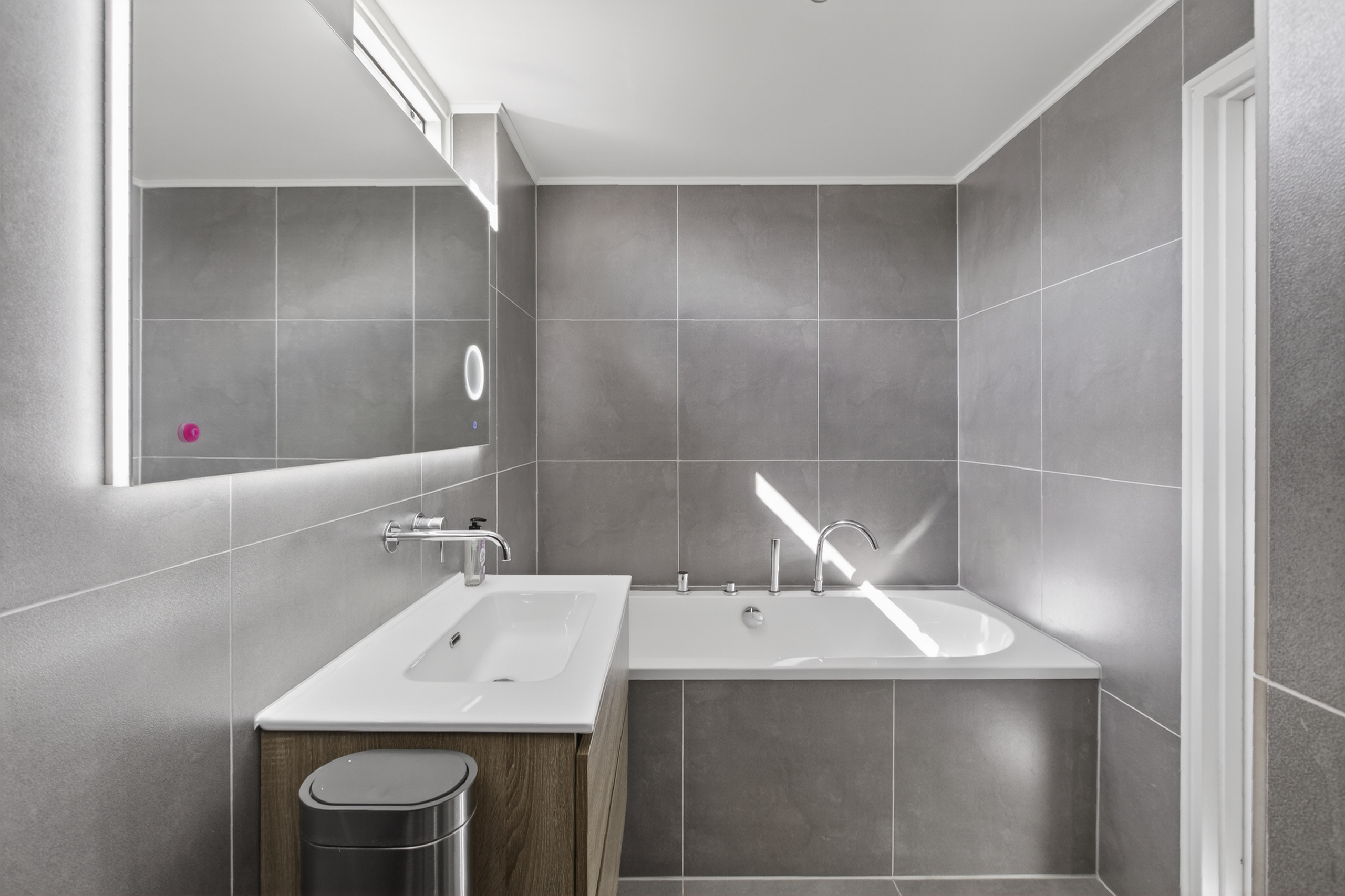 * Badkamer met ligbad, inloopdouche en wastafelmeubel