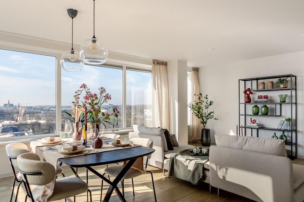 4th floor: entrance hall with meter cupboard, modern toilet with washbasin, living room with luxury open kitchen with Bosch appliances, large windows providing plenty of light and a beautiful view of the old town. The spacious bedroom has a built-in cupboard with central heating system and connection for washing machine, access to bathroom with shower and washbasin.