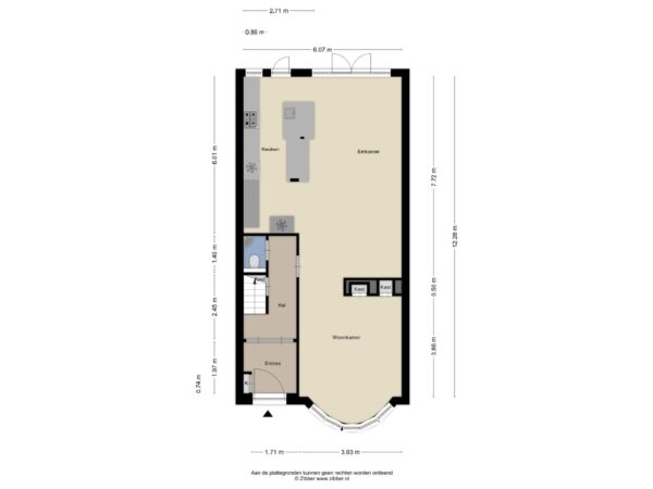 De woonkamer heeft een eiken parketvloer, een ronde erker aan de voorzijde, en een open haard (bio-ethanol).