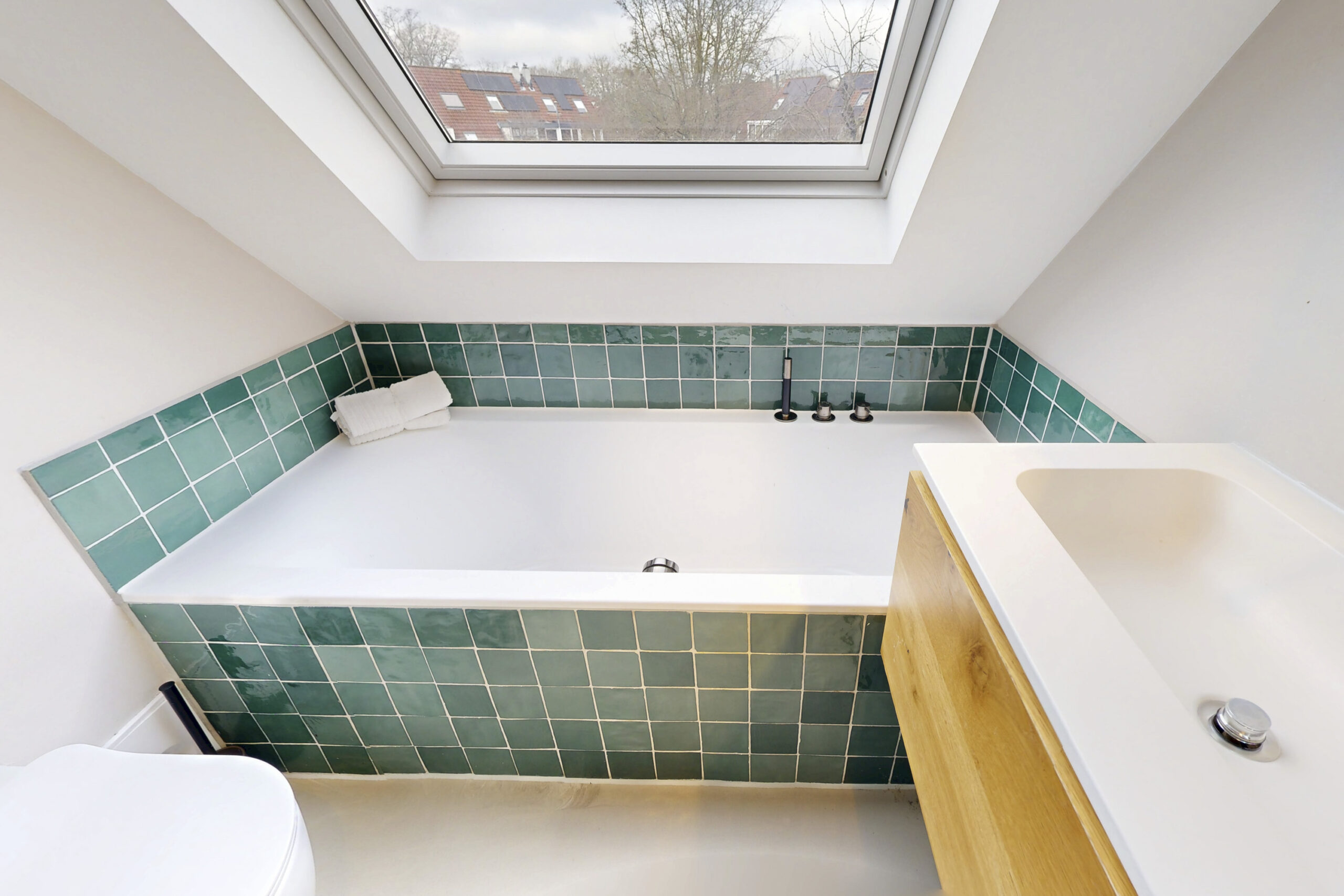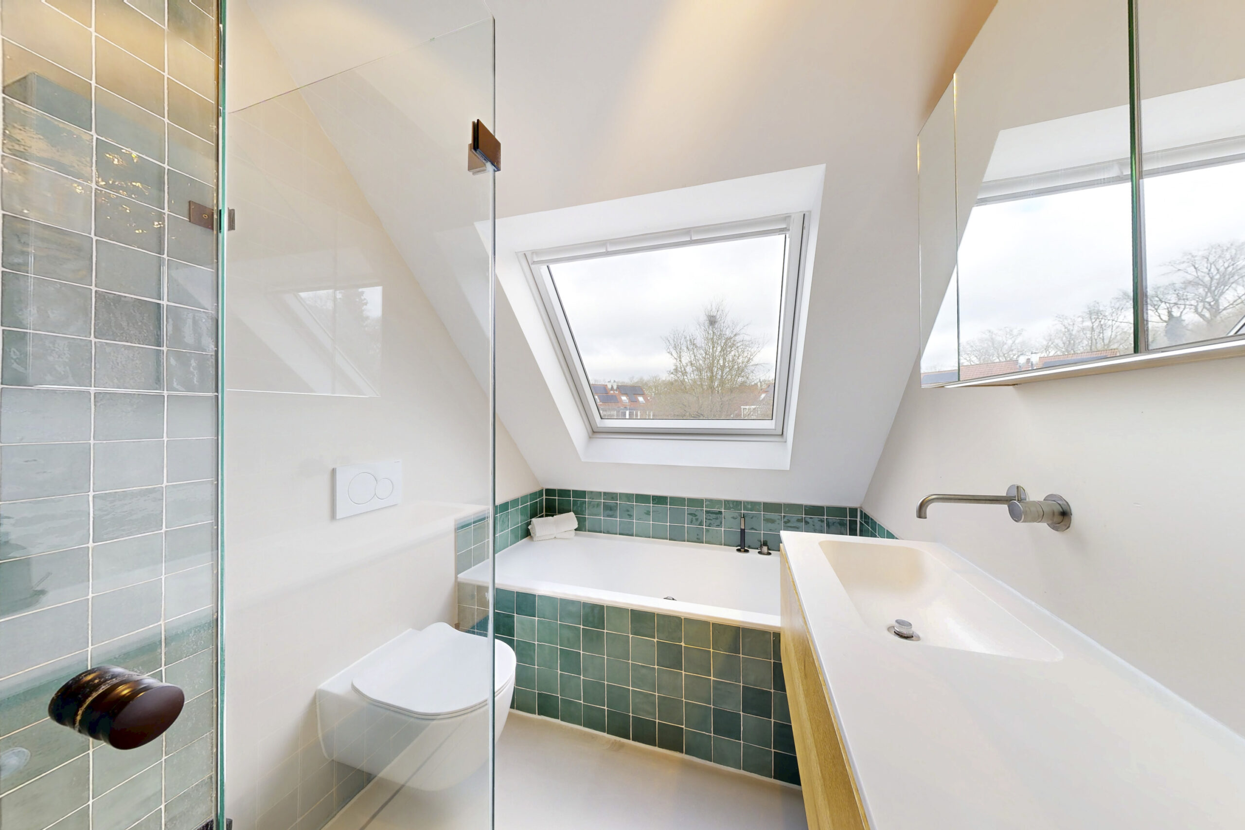 1e Verdieping: overloop met 2 diepe inbouwkasten, 2 slaapkamers aan voorzijde, slaapkamer aan achterzijde met dakraam, moderne badkamer voorzien van ligbad, inloopdouche met handdouche en rainshower, wastafelmeubel, handdoekradiator en dakraam, via overloop trap naar…