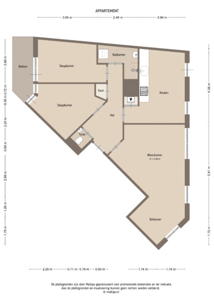 De ruime keuken is uitgerust met modern apparatuur, waaronder een 5-pits gasfornuis, oven, koelkast, vriezer en vaatwasser. Ook is er veel opbergruimte om alle keukenspullen te organiseren. De twee slaapkamers zijn ruim en bieden beide toegang tot het balkon, welke gelegen is op het zuiden. De badkamer is voorzien een inloopdouche, een wastafelmeubel met opbergruimte en er is een aansluiting aanwezig voor een wasmachine en droger. Daarnaast is er in de hal een separaat toilet aanwezig.