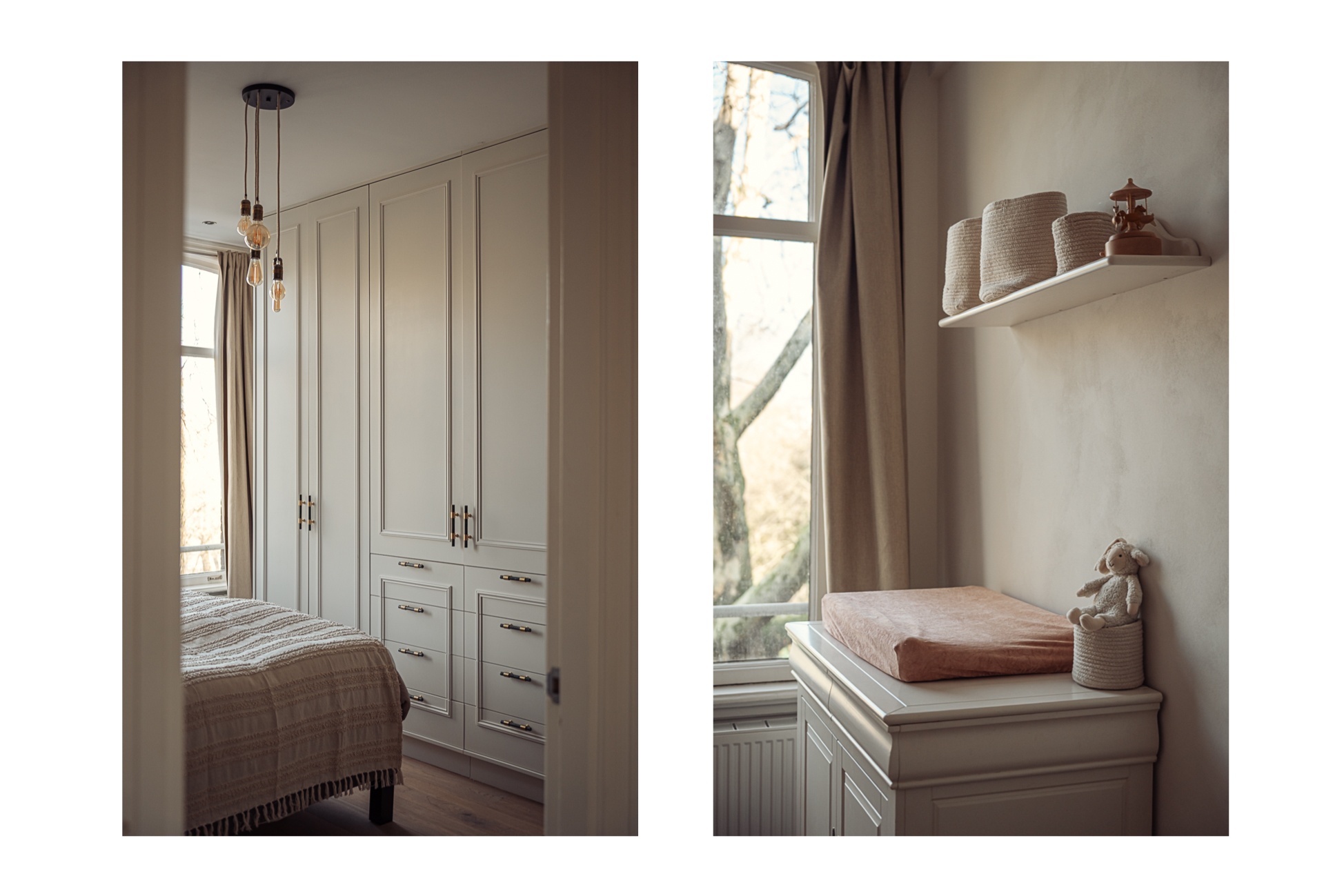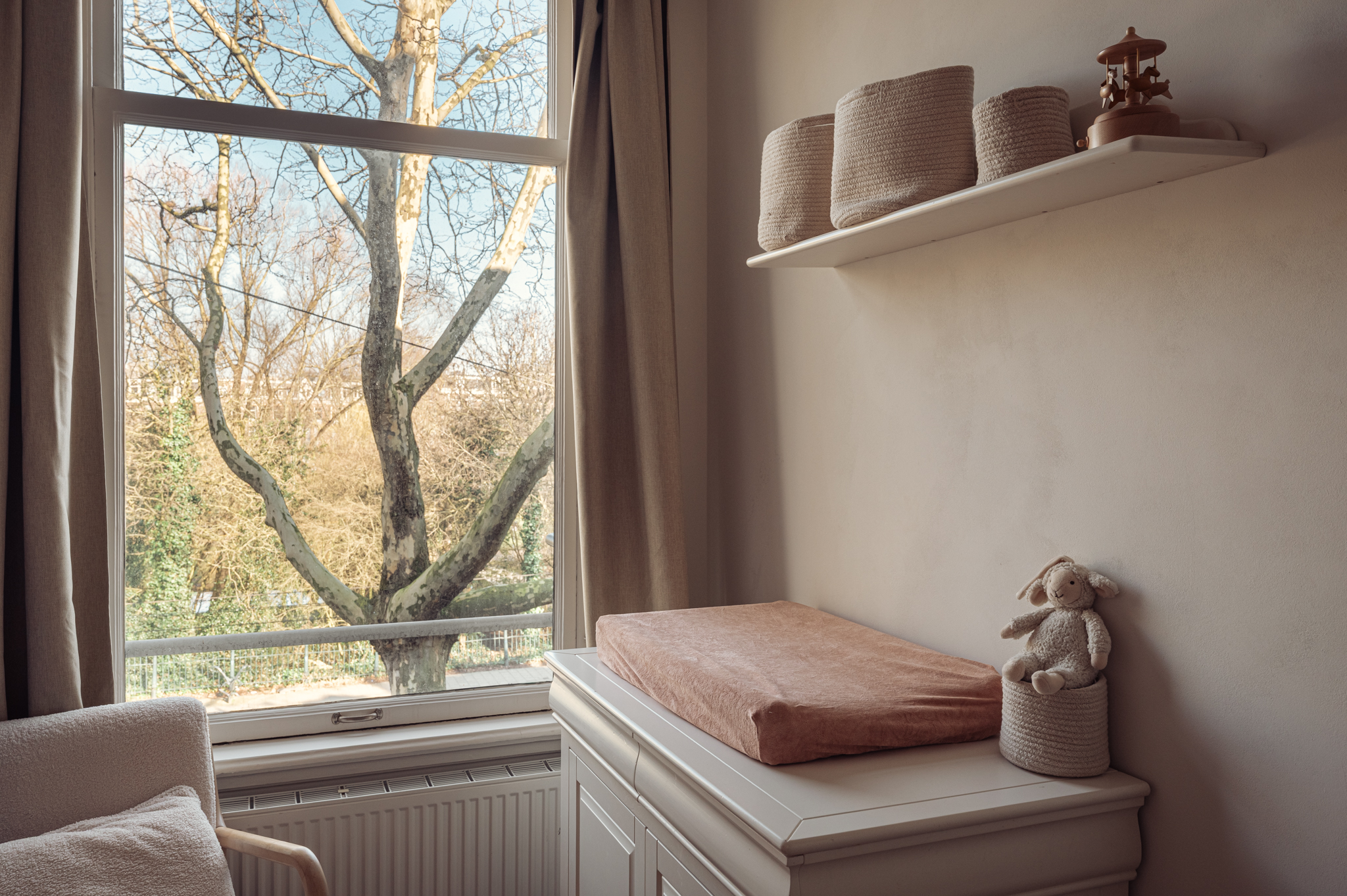 De master bedroom ligt aan de voorzijde en beschikt over een charmant Frans balkon met vrij uitzicht over het Sarphatipark. De op maat gemaakte, ingebouwde kast is volledig geïntegreerd in het interieur en benadrukt het hoogwaardige afwerkingsniveau.