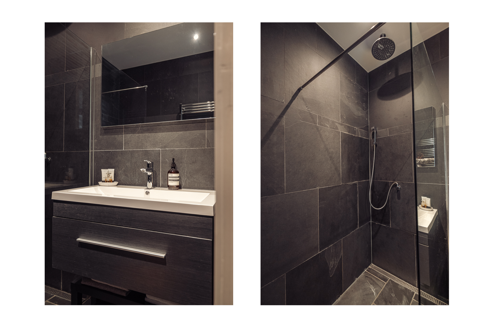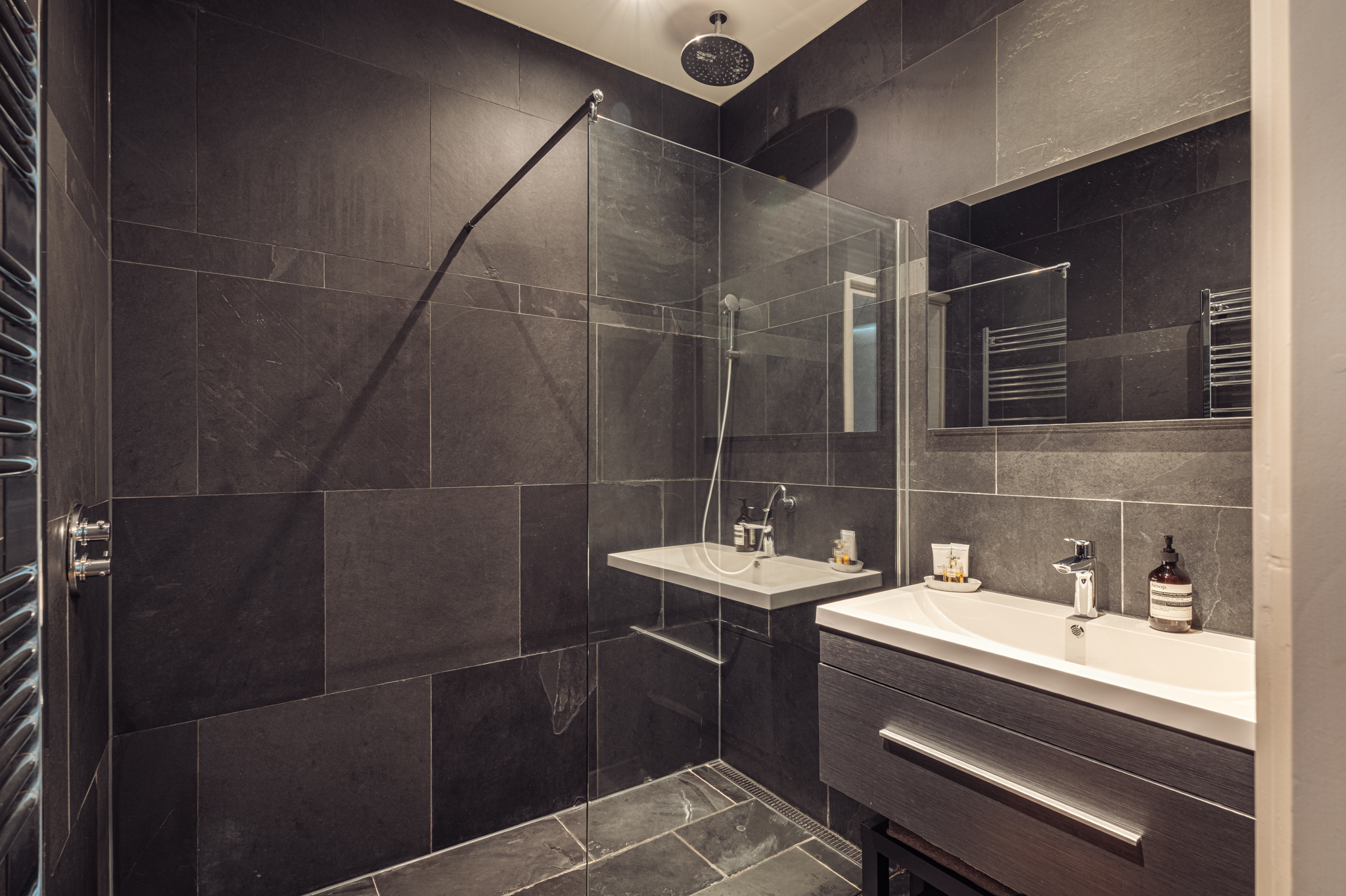 De badkamer heeft een royale inloopdouche met regendouche-kop en separate handdouche. De bediening is stijlvol aan de zijkant geplaatst, waardoor comfort en gebruiksgemak naadloos samenkomen en de afwerking strak en verfijnd blijft.