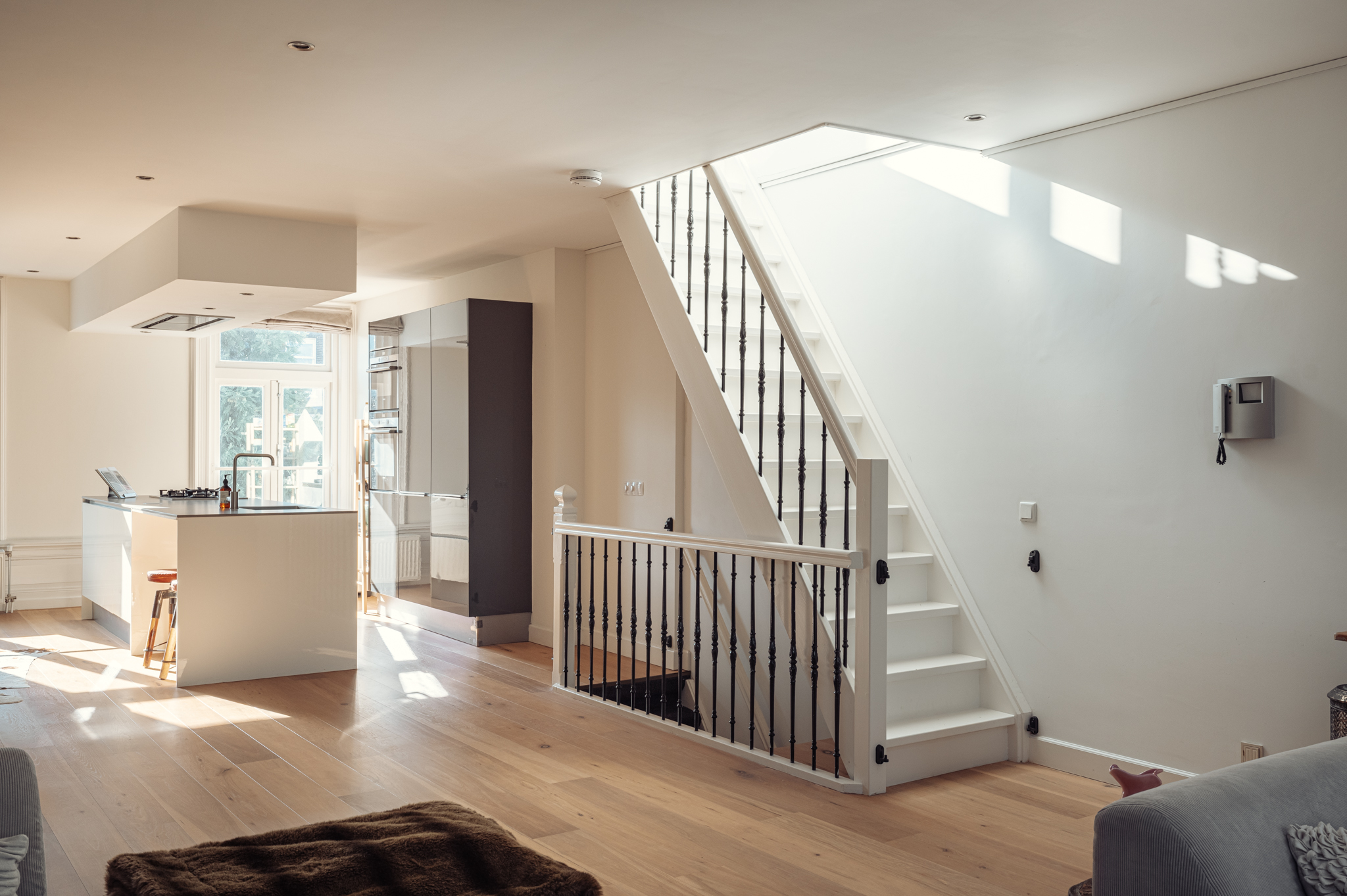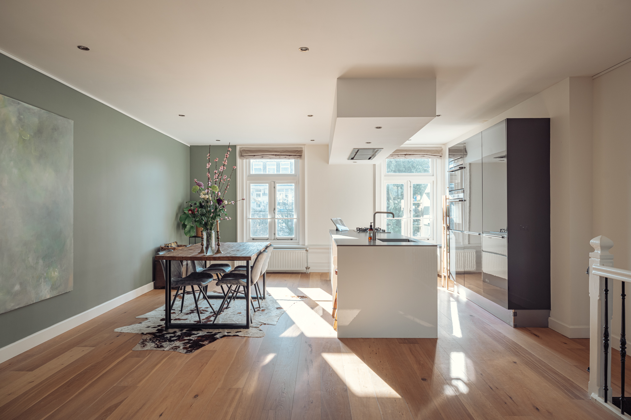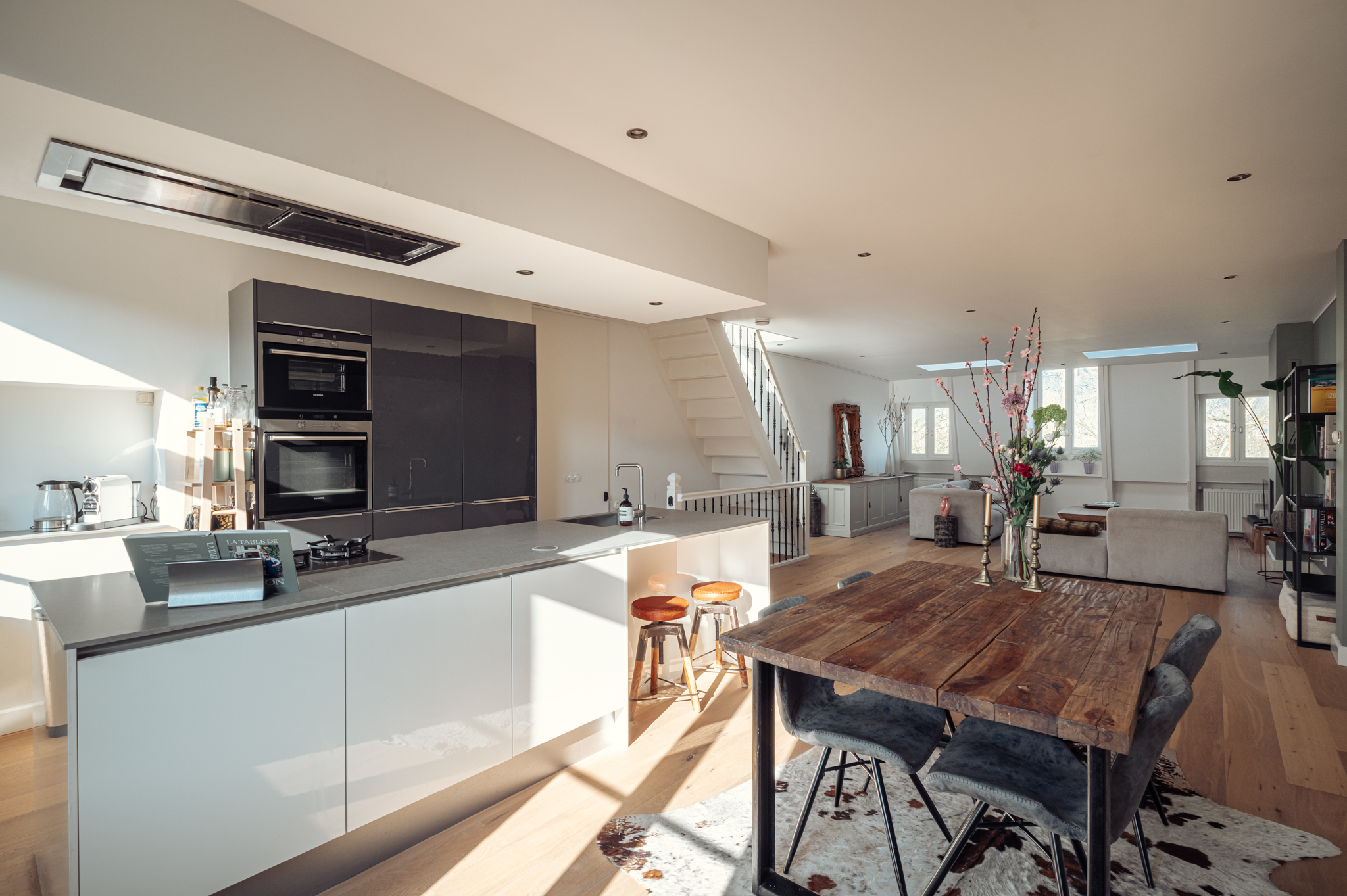 Via de fraaie trap bereik je de derde verdieping waar de woon- en eetkamer zich bevinden.