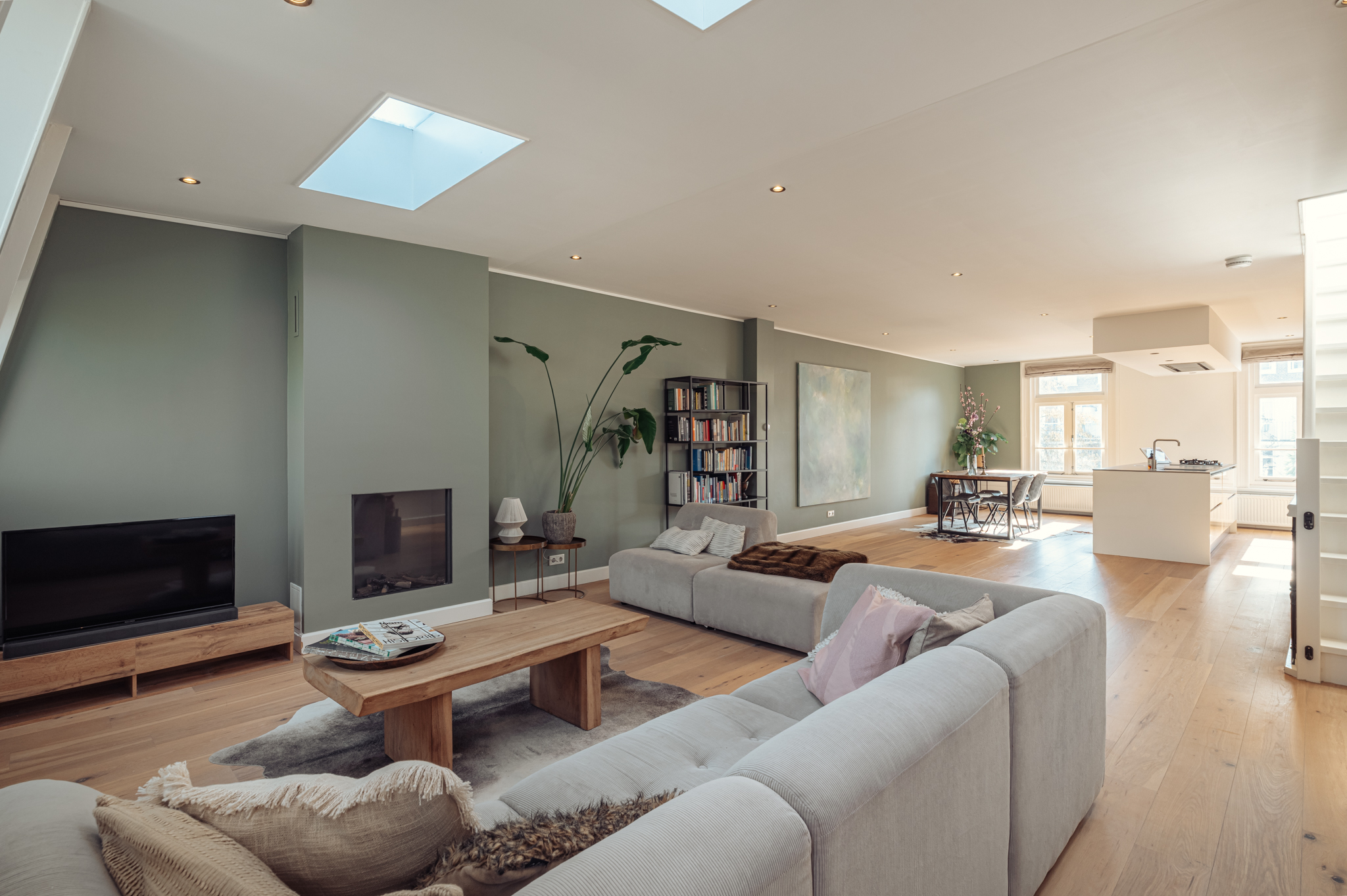Het zitgedeelte is voorzien van een moderne ingebouwde gashaard. Overdag geven de twee lichtkoepels extra licht in deze open ruimte.