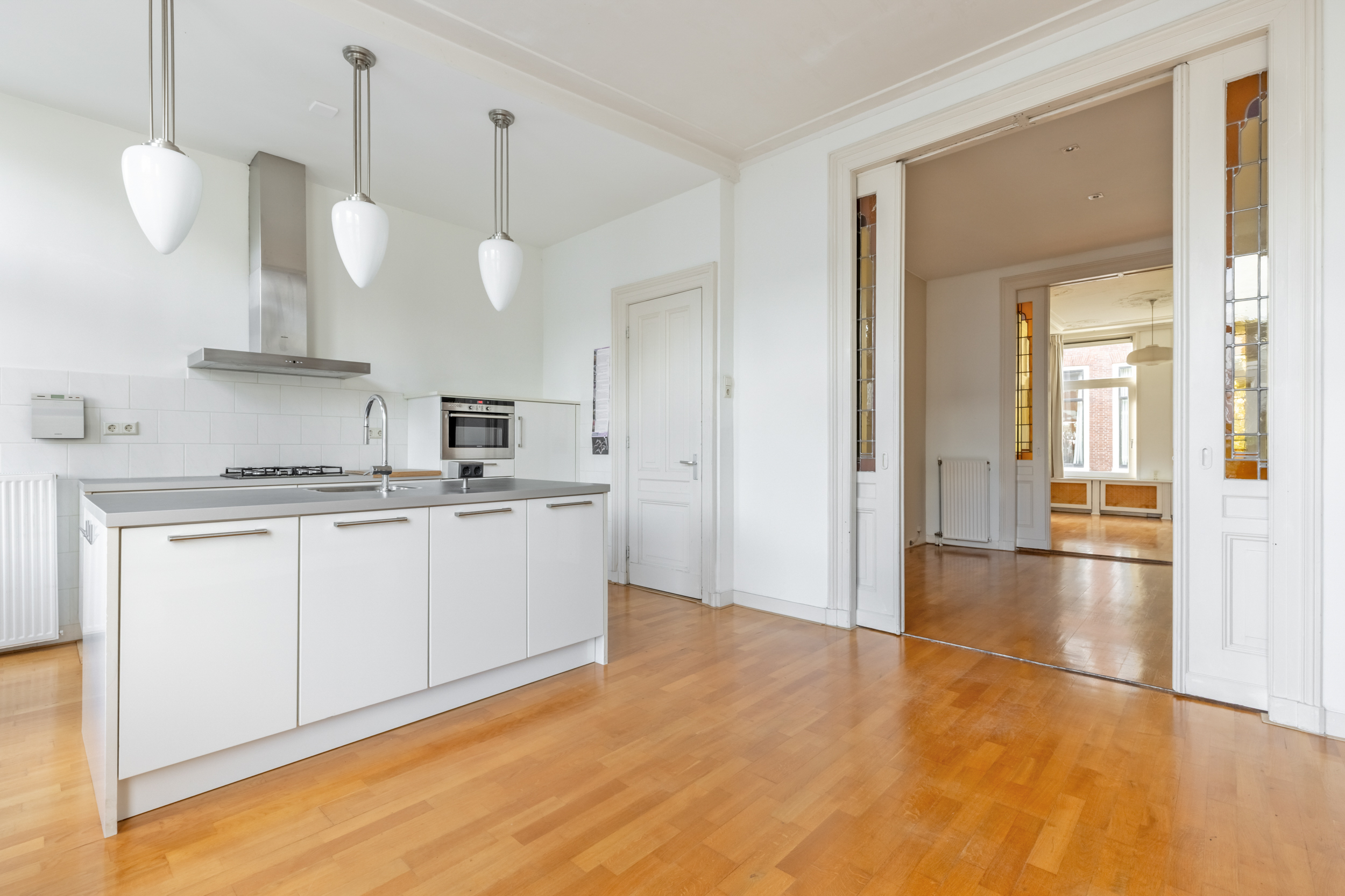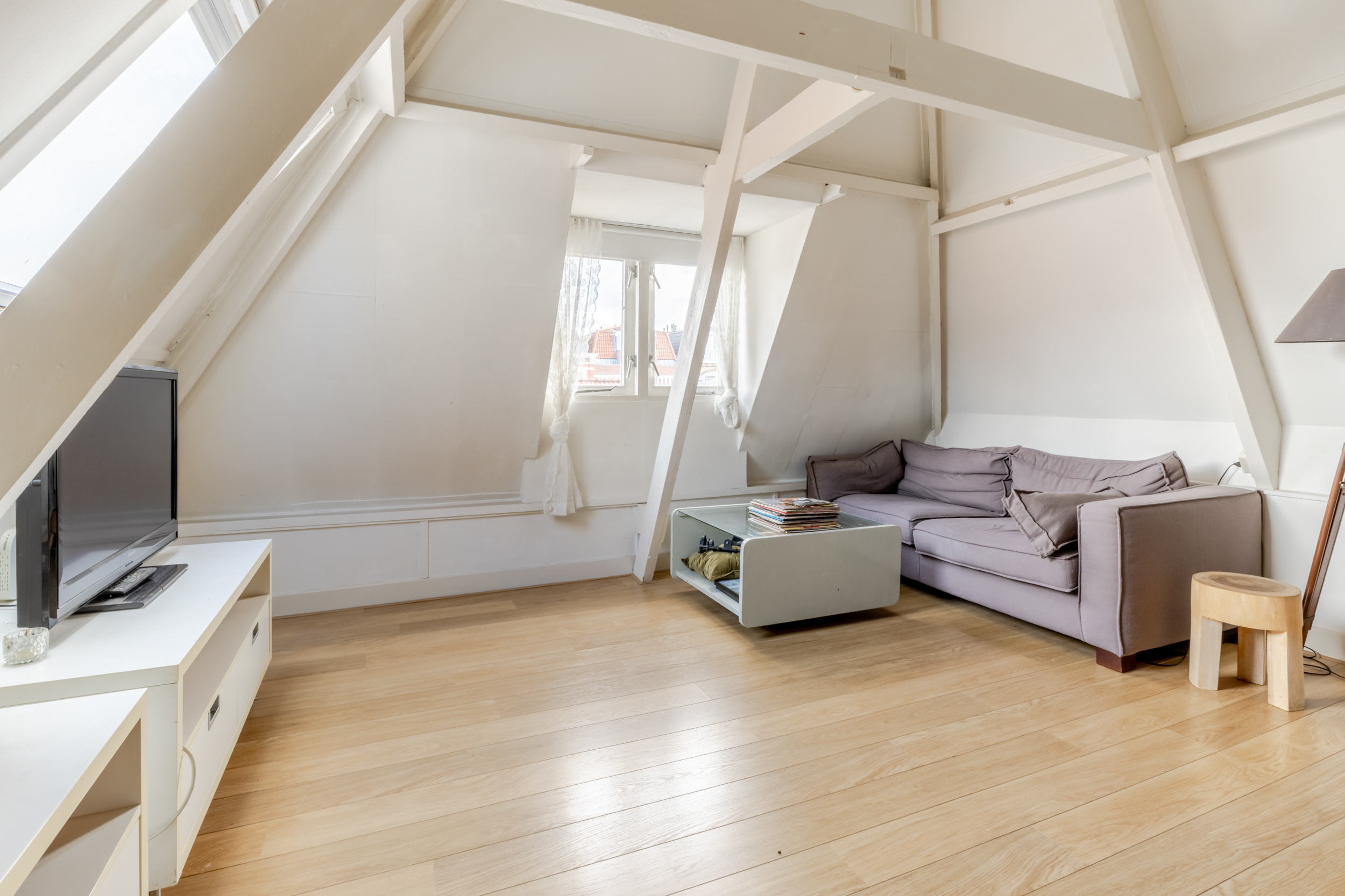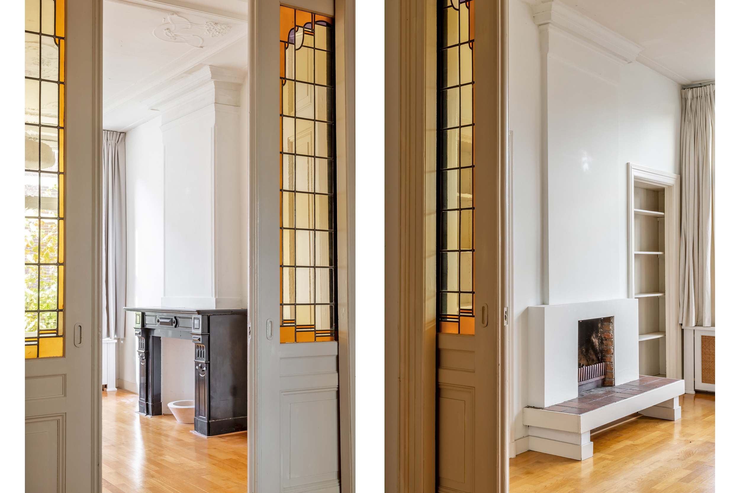 Spread over two floors (approx. 129 m²), you will find a warm and characterful home with beautiful authentic details such as wooden beams, high ceilings and stained glass. The spacious living room with fireplace overlooks the lively street, and thanks to the large windows, it is wonderfully light. The well-maintained kitchen and bathroom provide a great basis for creating your perfect city home with a few personal touches.