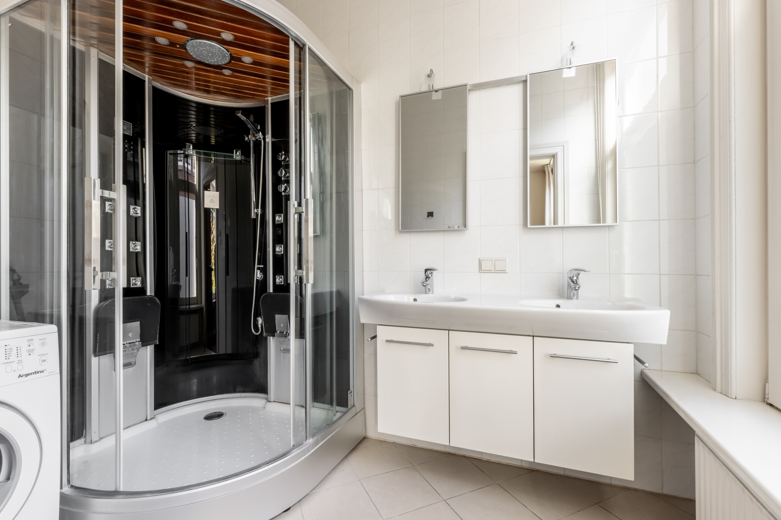 First floor: Entrance hall with storage space, separate toilet, bright living room with fireplace and open kitchen. From here you have access to the spacious and sunny roof terrace, facing east. (over 70m2) Connecting room with sliding doors with stained glass to the front room. At the front is the bathroom with steam shower cabin with aroma/colour therapy and massage shower, double sink, designer radiator and toilet.