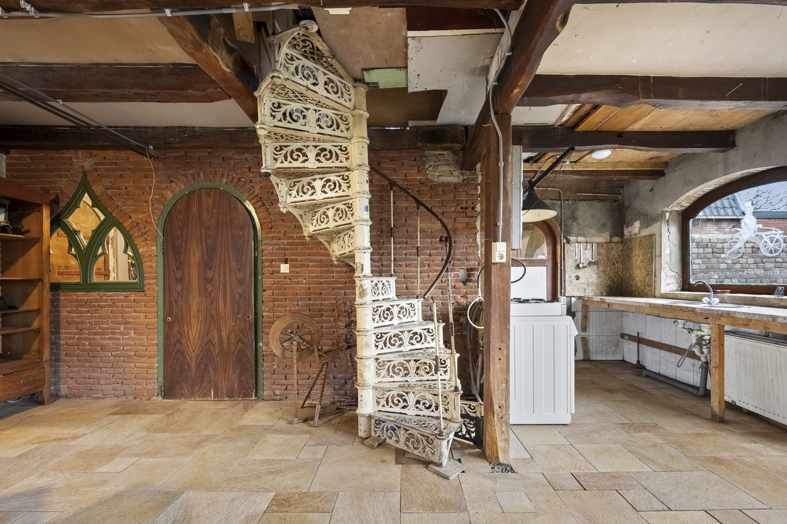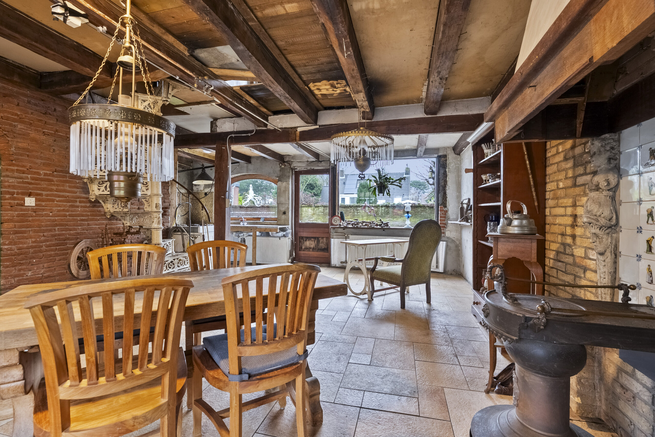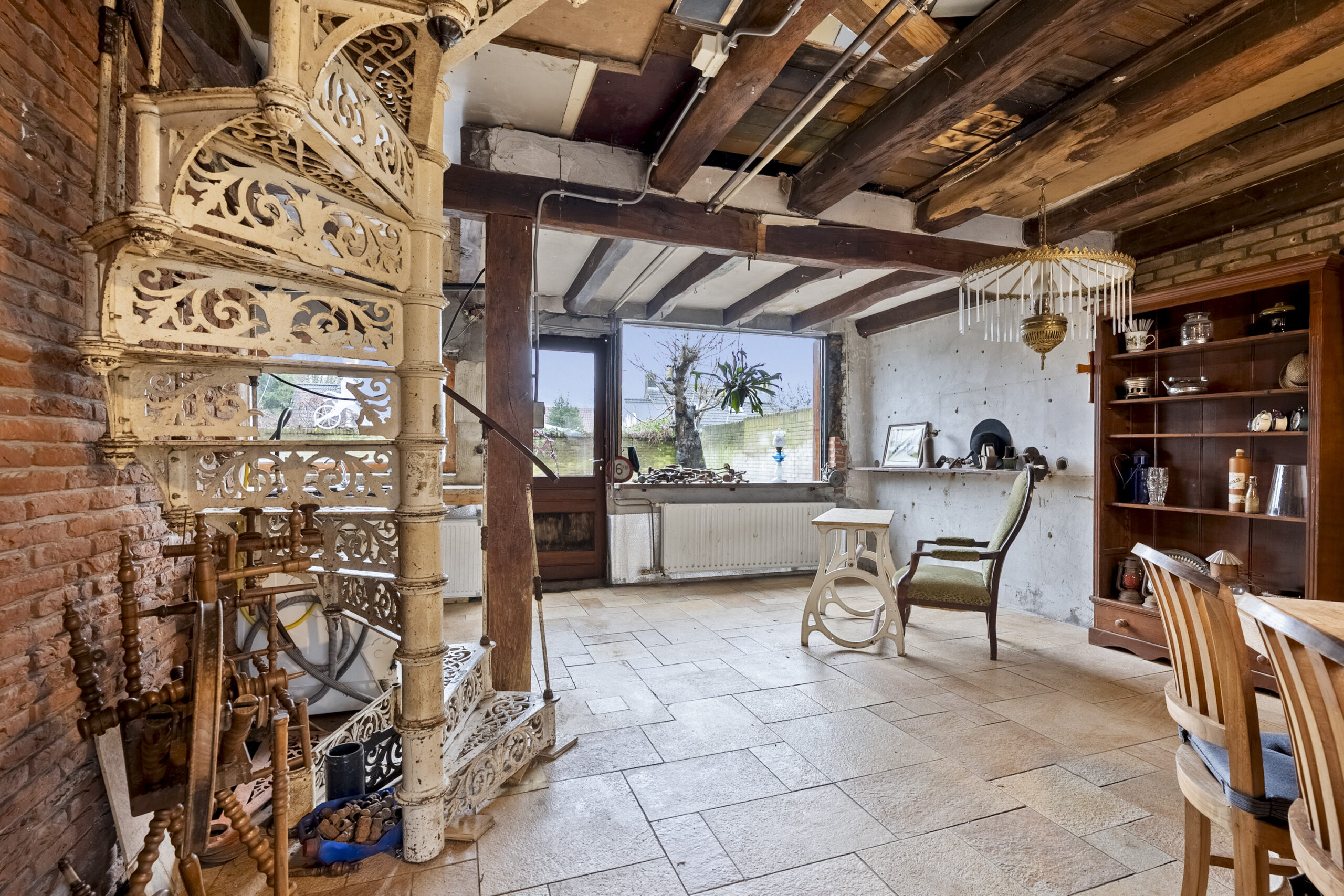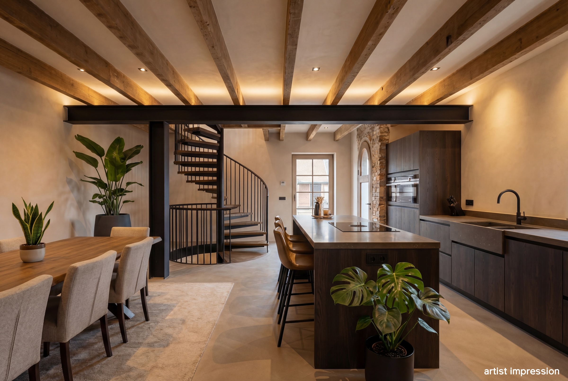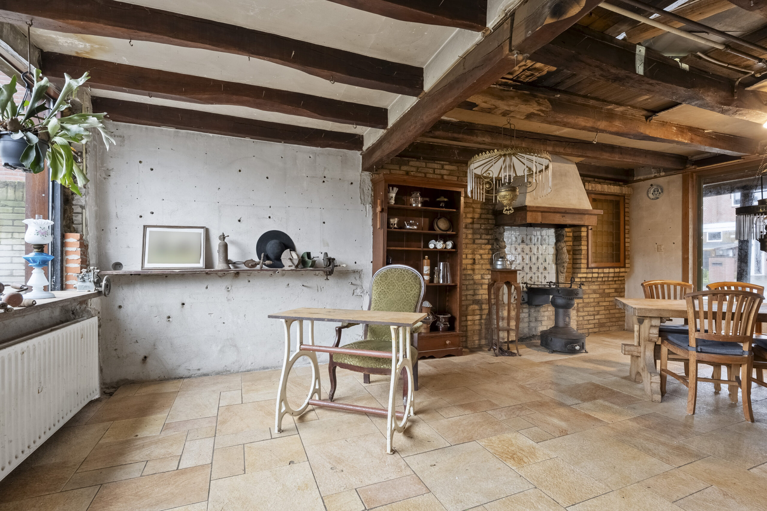 De bouwtechnische mogelijkheden zijn ruim. Met een goothoogte van 4 meter en een bouwhoogte van 7 meter is er serieuze ruimte om uit te breiden of op te bouwen. De huidige indeling nodigt uit tot herontwerp. Tussen de foto’s staan artist impressions die laten zien wat er kan ontstaan. Een open woonkeuken met kookeiland in het voormalige garagedeel, onder de originele balken. De woonkamer waar de schouw en de gietijzeren wenteltrap het karakter bepalen. Een luxe wijnkelder met proefruimte, bereikbaar via de bestaande trap. Een masterbedroom met luxe badkamer op de eerste verdieping waar de kapconstructie zichtbaar onderdeel wordt van het ontwerp.