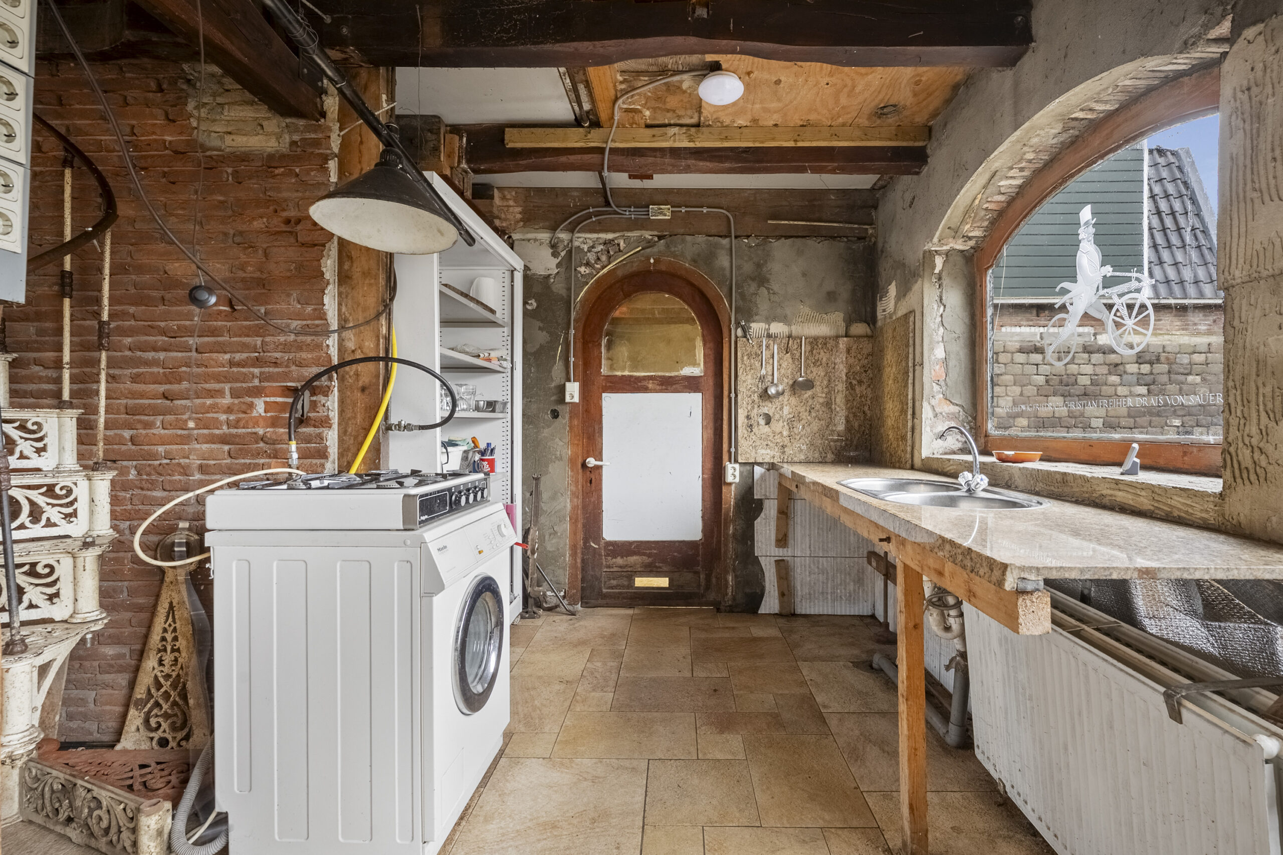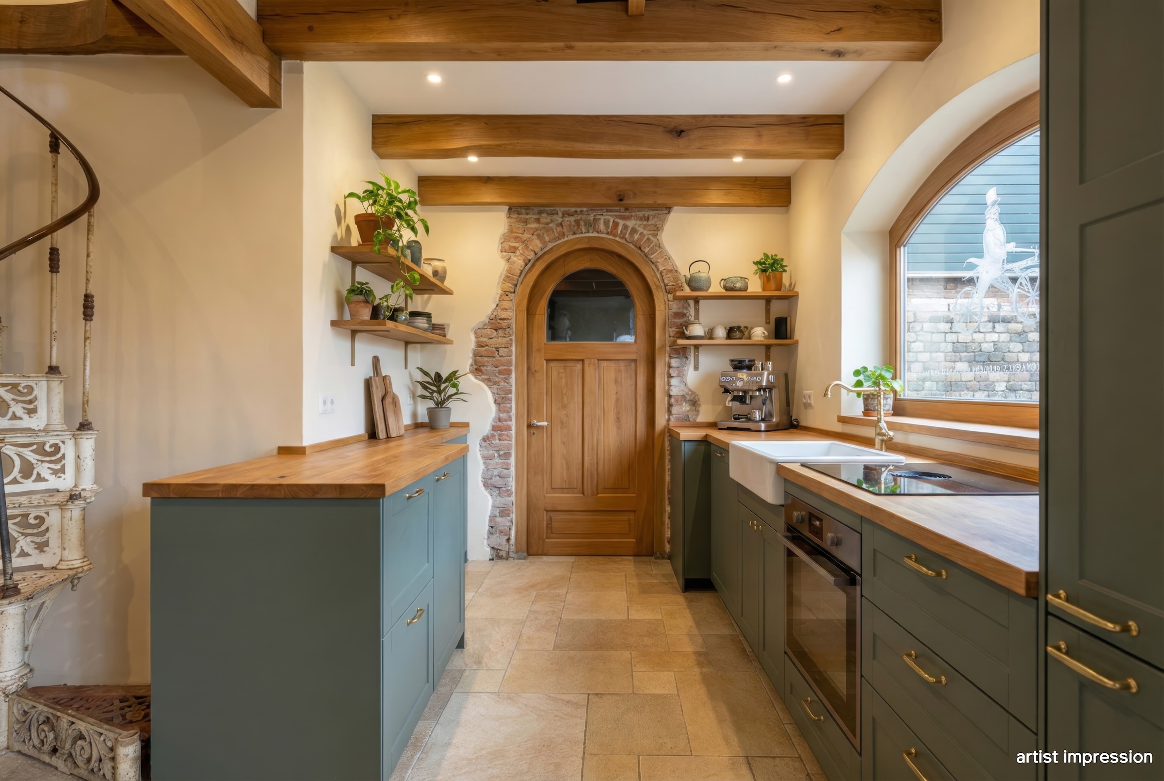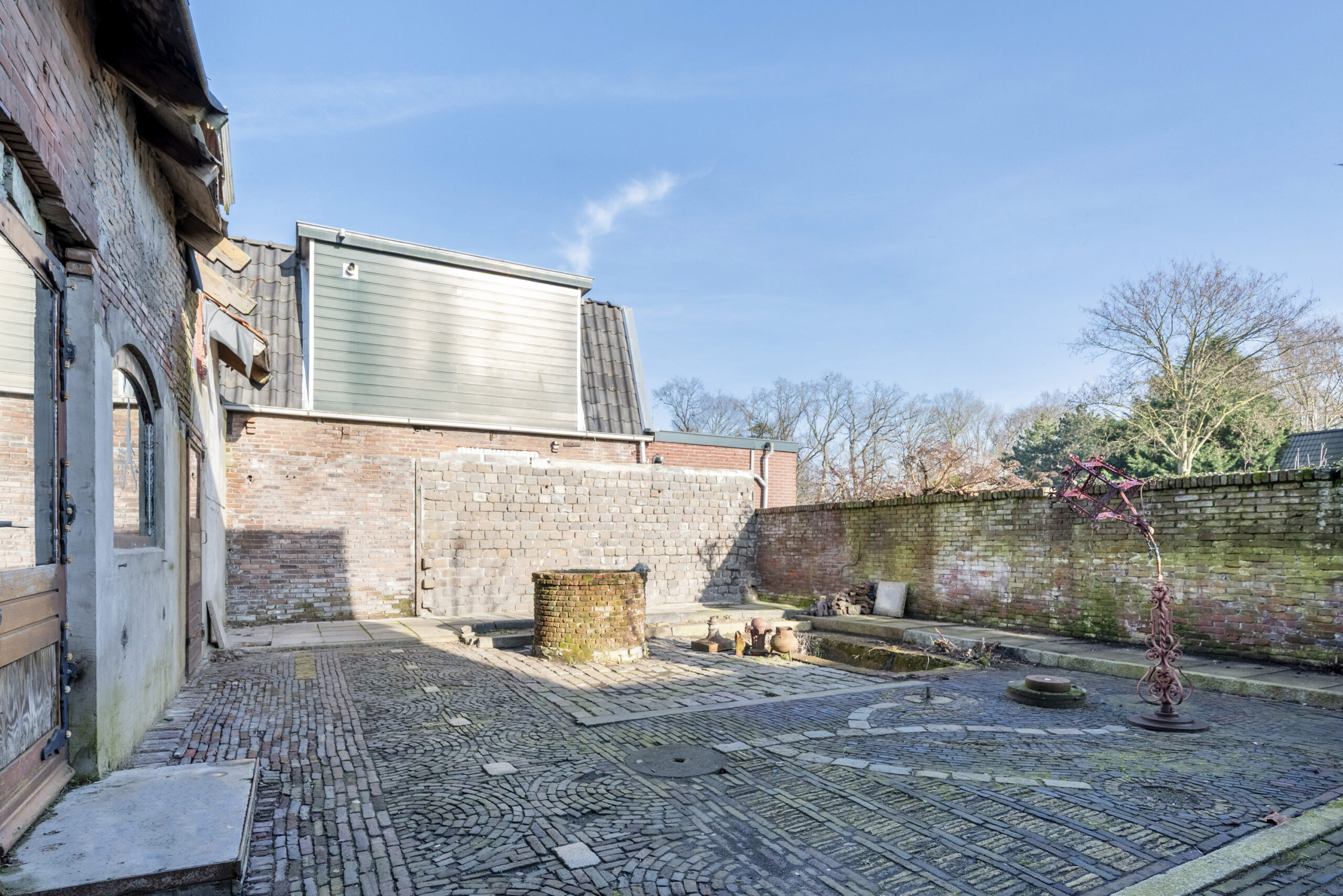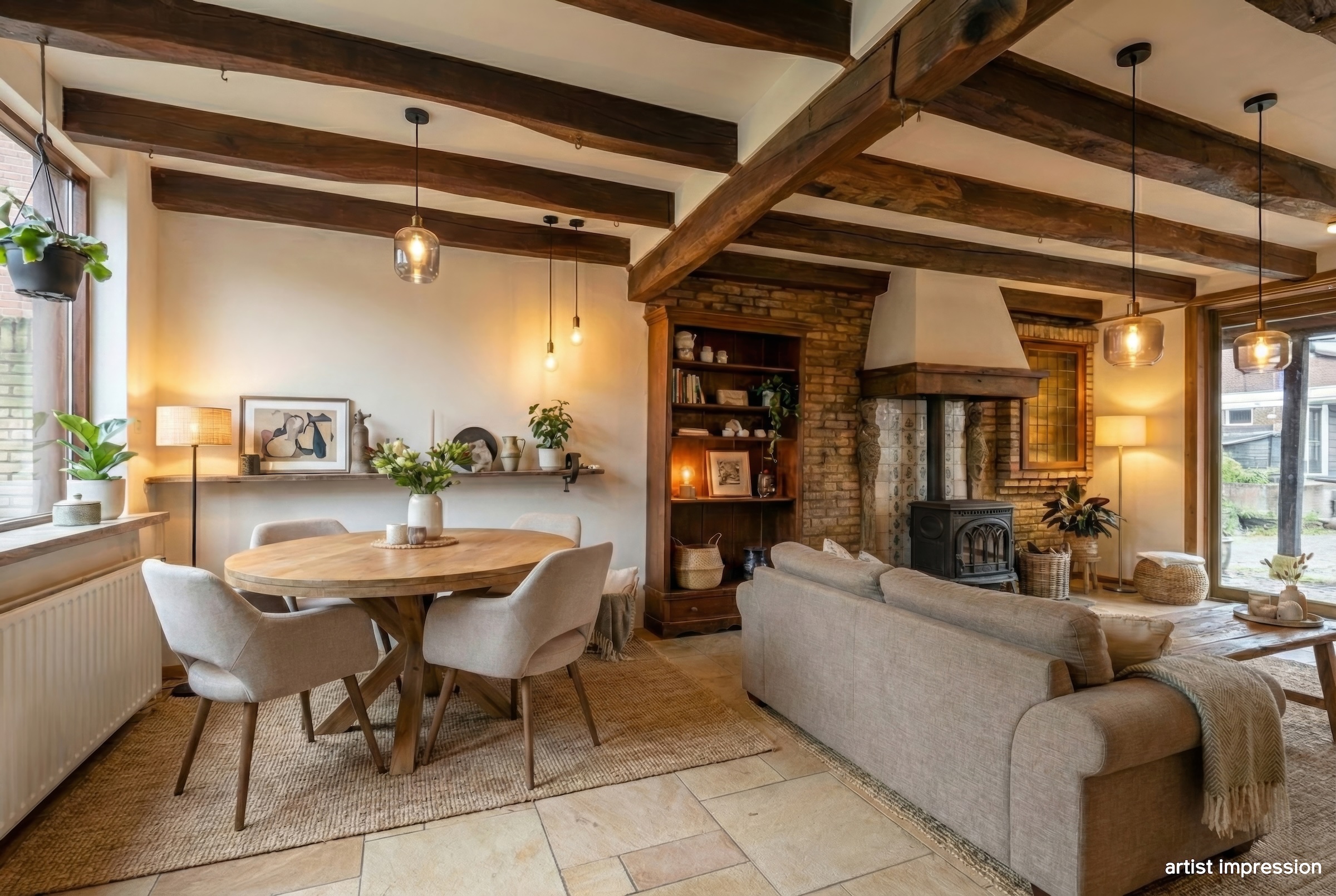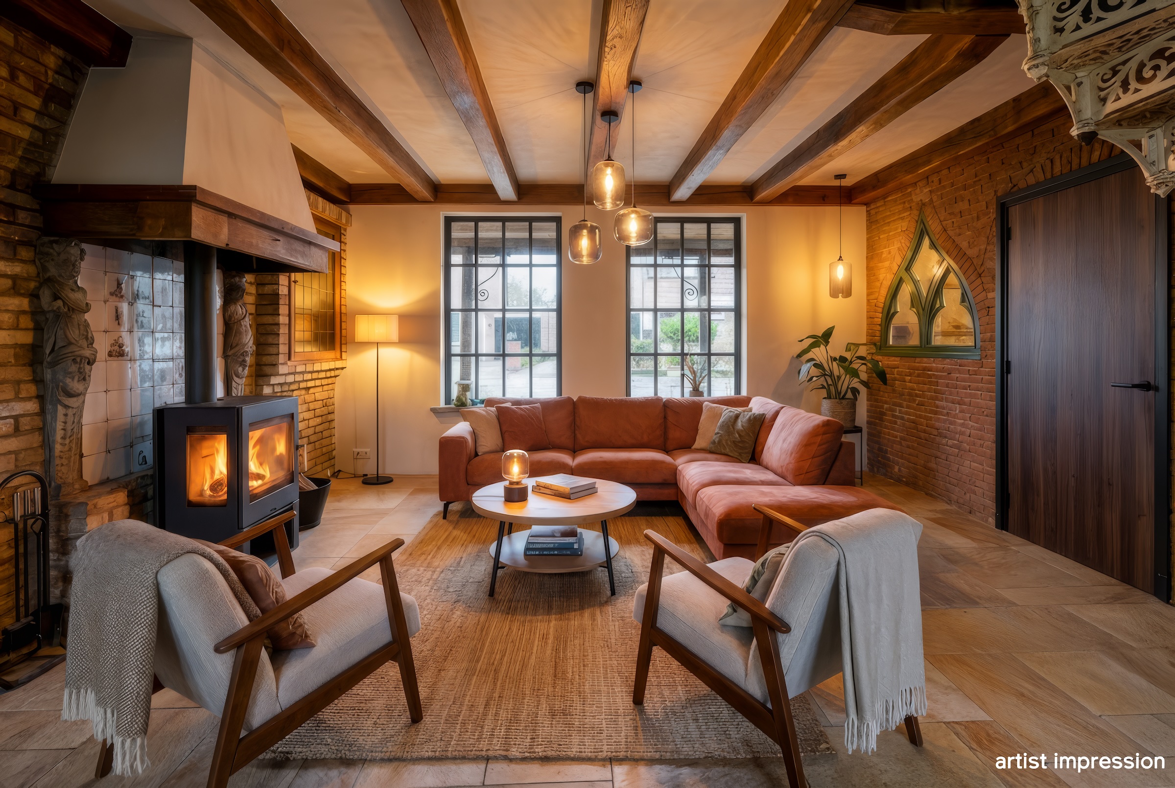 De bouwtechnische mogelijkheden zijn ruim. Met een goothoogte van 4 meter en een bouwhoogte van 7 meter is er serieuze ruimte om uit te breiden of op te bouwen. De huidige indeling nodigt uit tot herontwerp. Tussen de foto’s staan artist impressions die laten zien wat er kan ontstaan. Een open woonkeuken met kookeiland in het voormalige garagedeel, onder de originele balken. De woonkamer waar de schouw en de gietijzeren wenteltrap het karakter bepalen. Een luxe wijnkelder met proefruimte, bereikbaar via de bestaande trap. Een masterbedroom met luxe badkamer op de eerste verdieping waar de kapconstructie zichtbaar onderdeel wordt van het ontwerp.
