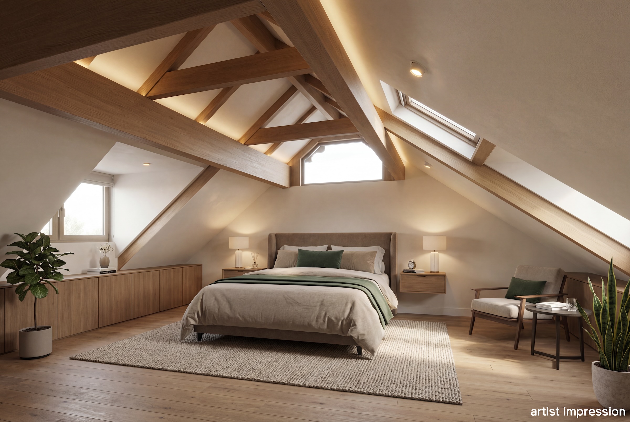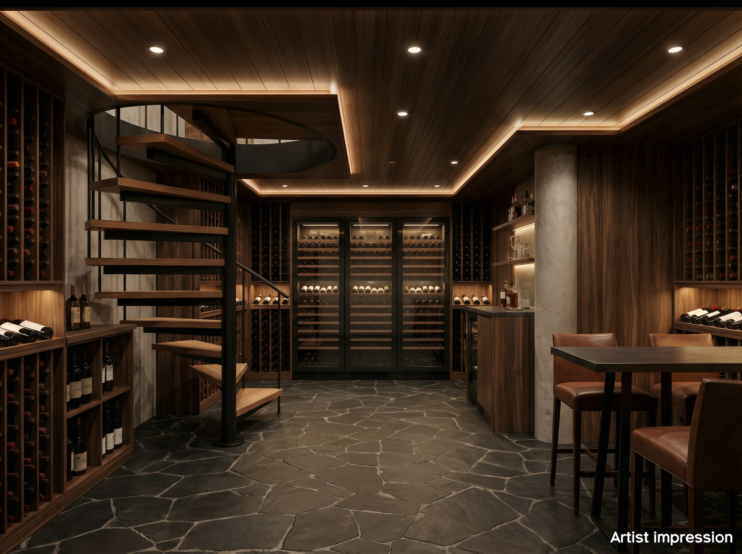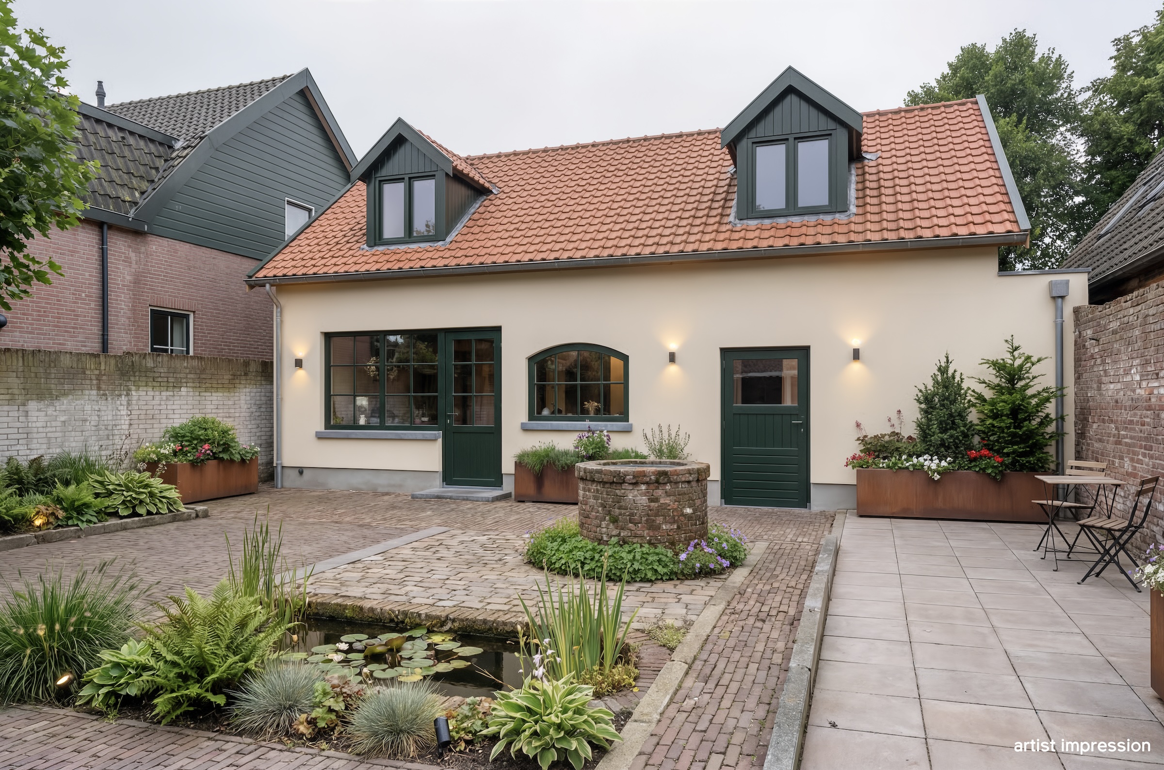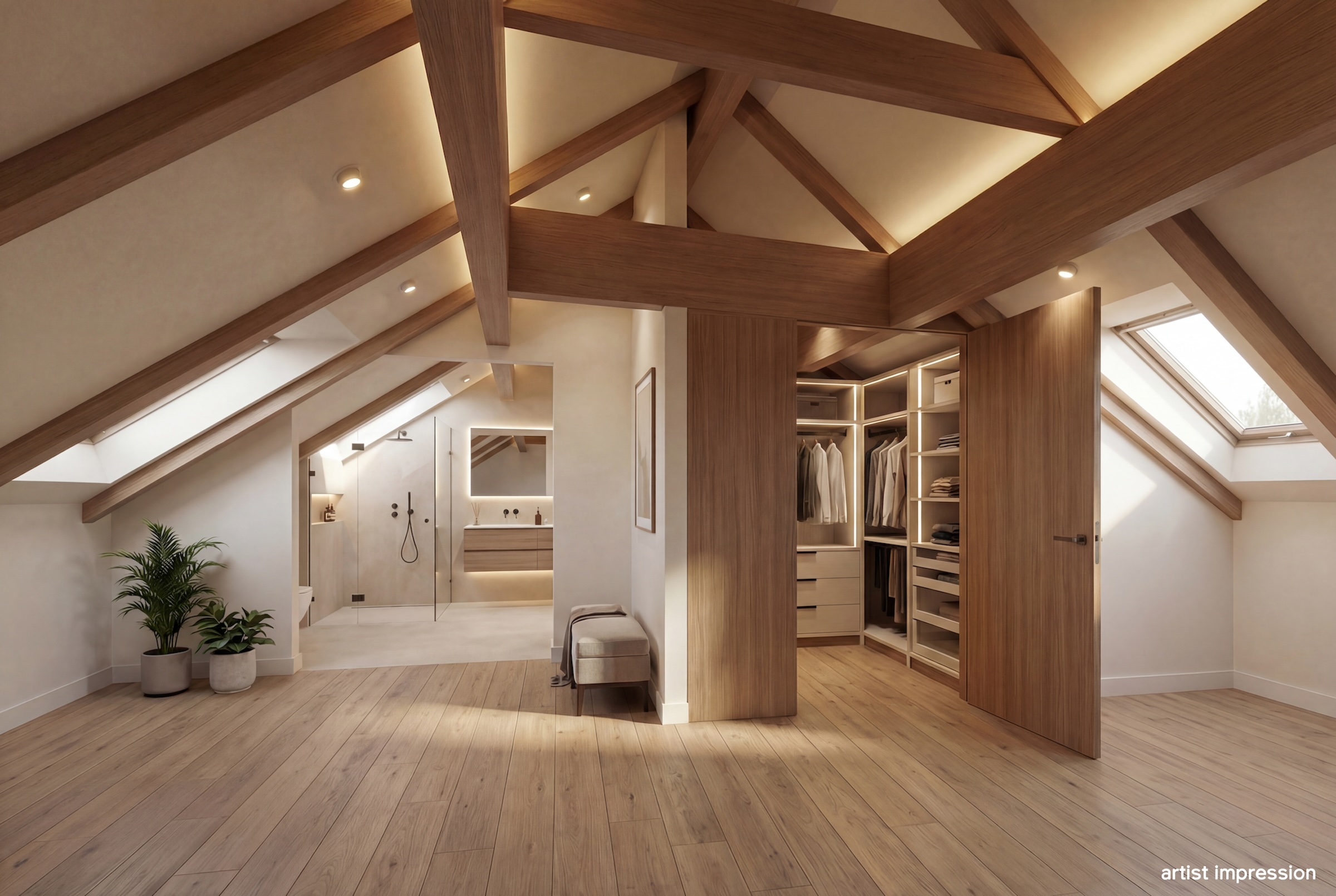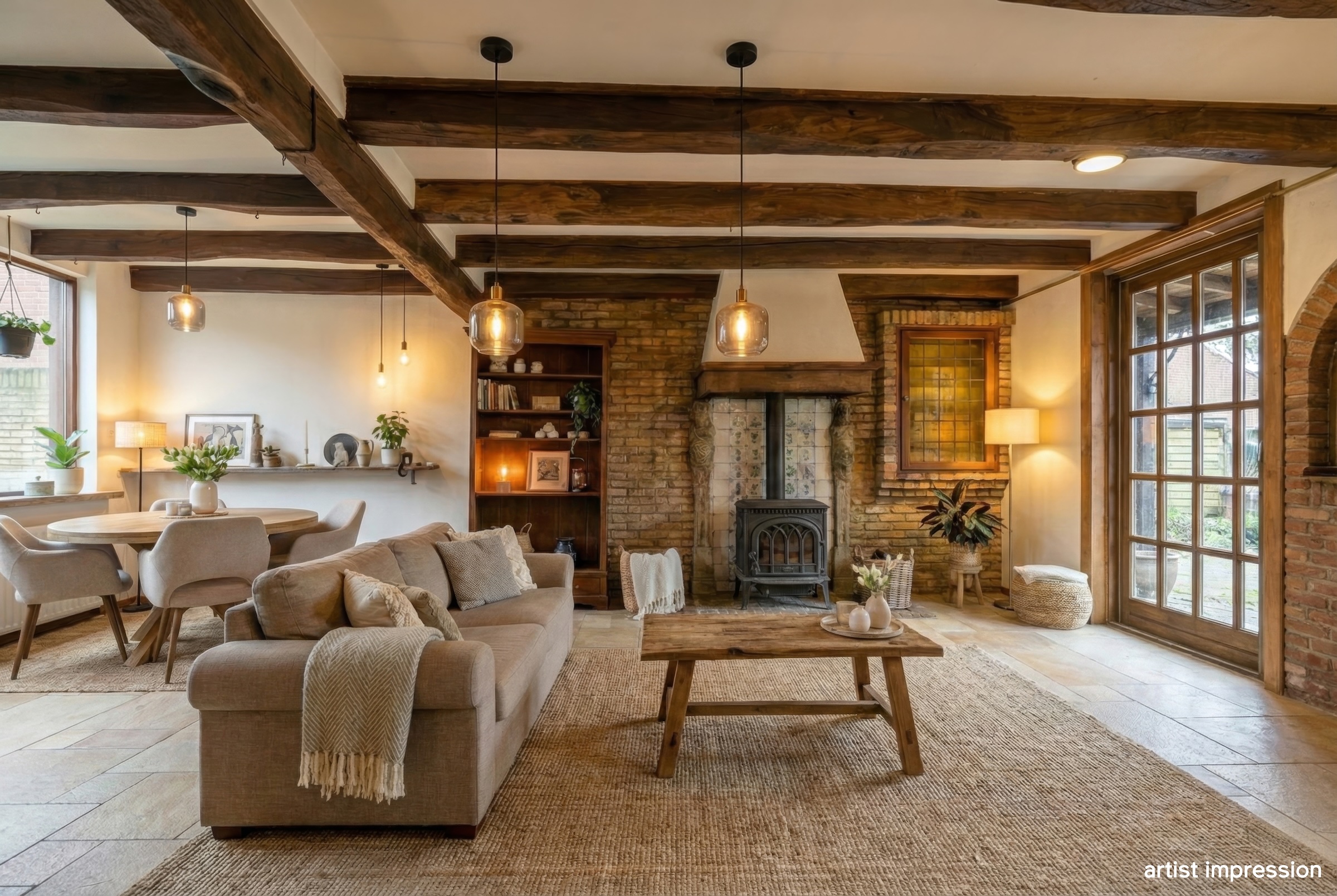 De bouwtechnische mogelijkheden zijn ruim. Met een goothoogte van 4 meter en een bouwhoogte van 7 meter is er serieuze ruimte om uit te breiden of op te bouwen. De huidige indeling nodigt uit tot herontwerp. Tussen de foto’s staan artist impressions die laten zien wat er kan ontstaan. Een open woonkeuken met kookeiland in het voormalige garagedeel, onder de originele balken. De woonkamer waar de schouw en de gietijzeren wenteltrap het karakter bepalen. Een luxe wijnkelder met proefruimte, bereikbaar via de bestaande trap. Een masterbedroom met luxe badkamer op de eerste verdieping waar de kapconstructie zichtbaar onderdeel wordt van het ontwerp.