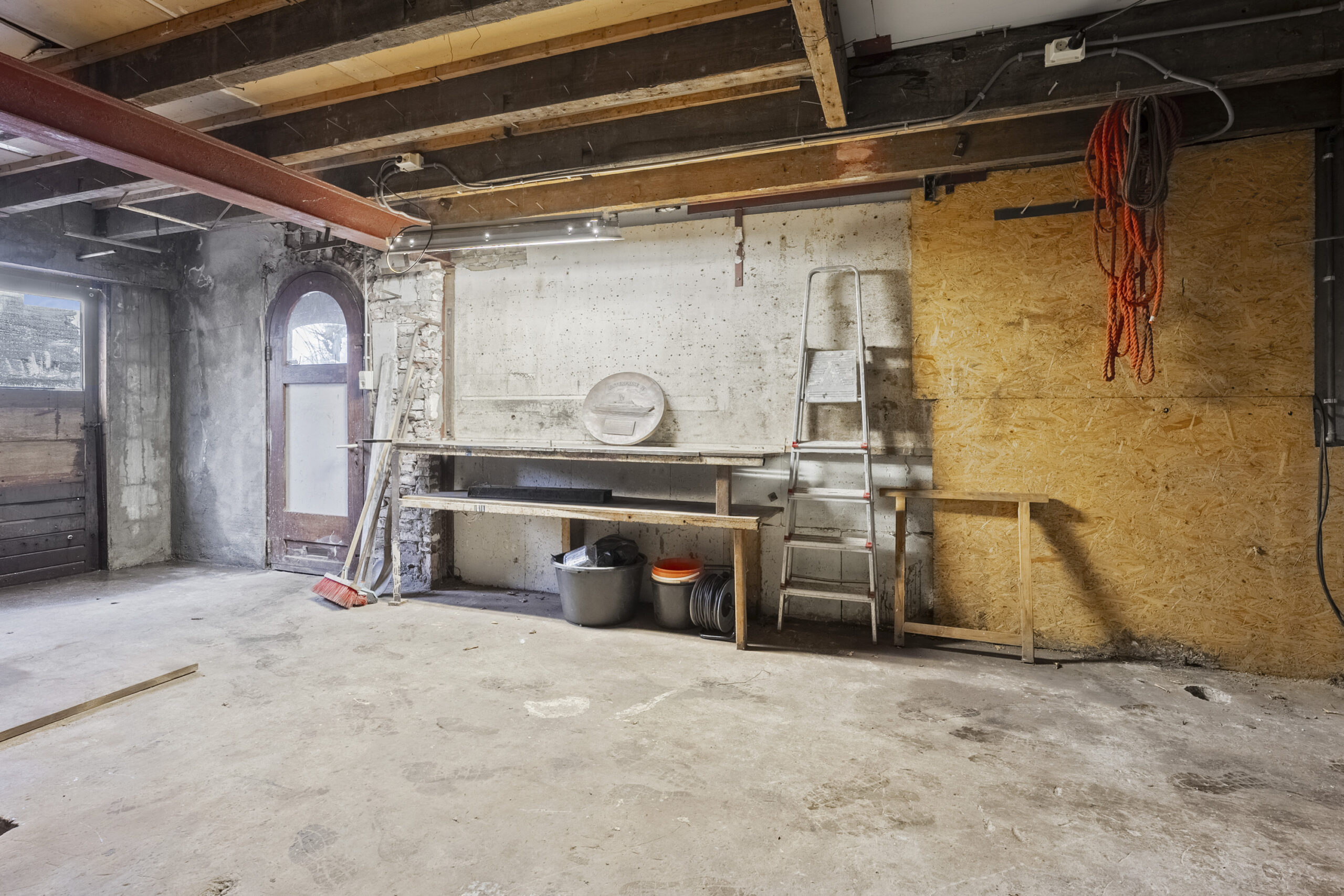 De begane grond heeft een open structuur. De woonkamer heeft een balkenplafond, de karakteristieke schouw en een sierlijke gietijzeren wenteltrap naar de eerste verdieping. Via een gotische boogdoorgang kom je in de multifunctionele ruimte van ca. 31 m². Deze ruimte heeft openslaande deuren naar de overdekte veranda aan de voorzijde, een deur naar de achtertuin en een wenteltrap naar de kelder. De kelder is een volwaardige ruimte van ca. 28 m² met stahoogte. In de huidige staat functioneel, maar met potentie voor iets bijzonders. De grote boogpoort aan de voorzijde geeft toegang tot een ruimte die nu leeg staat. Dit kan garage worden, atelier, werkplaats of een overdekte buitenruimte die aansluit op de veranda.