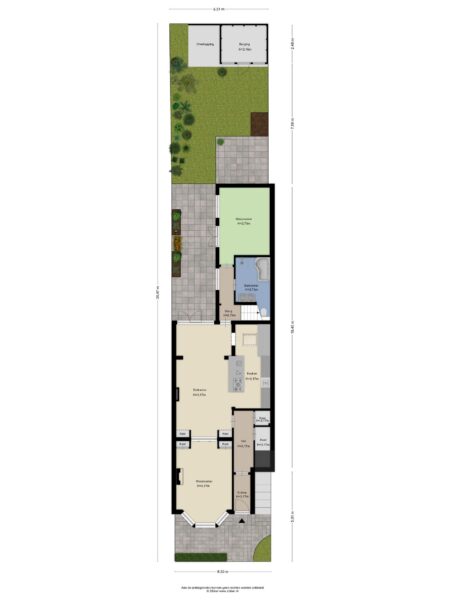 Ground floor: spacious front garden, entrance, hallway, corridor with staircase cupboard and access to the basement, toilet with sink. En suite living room with built-in cupboards, high ceilings, bay window at the front, fireplace, dining room with open kitchen equipped with various built-in appliances, cooking island, and French doors to the deep, sunny garden with a spacious shed. At the rear is the master bedroom with a luxurious bathroom (bathtub, toilet, double sink, and walk-in rain shower).