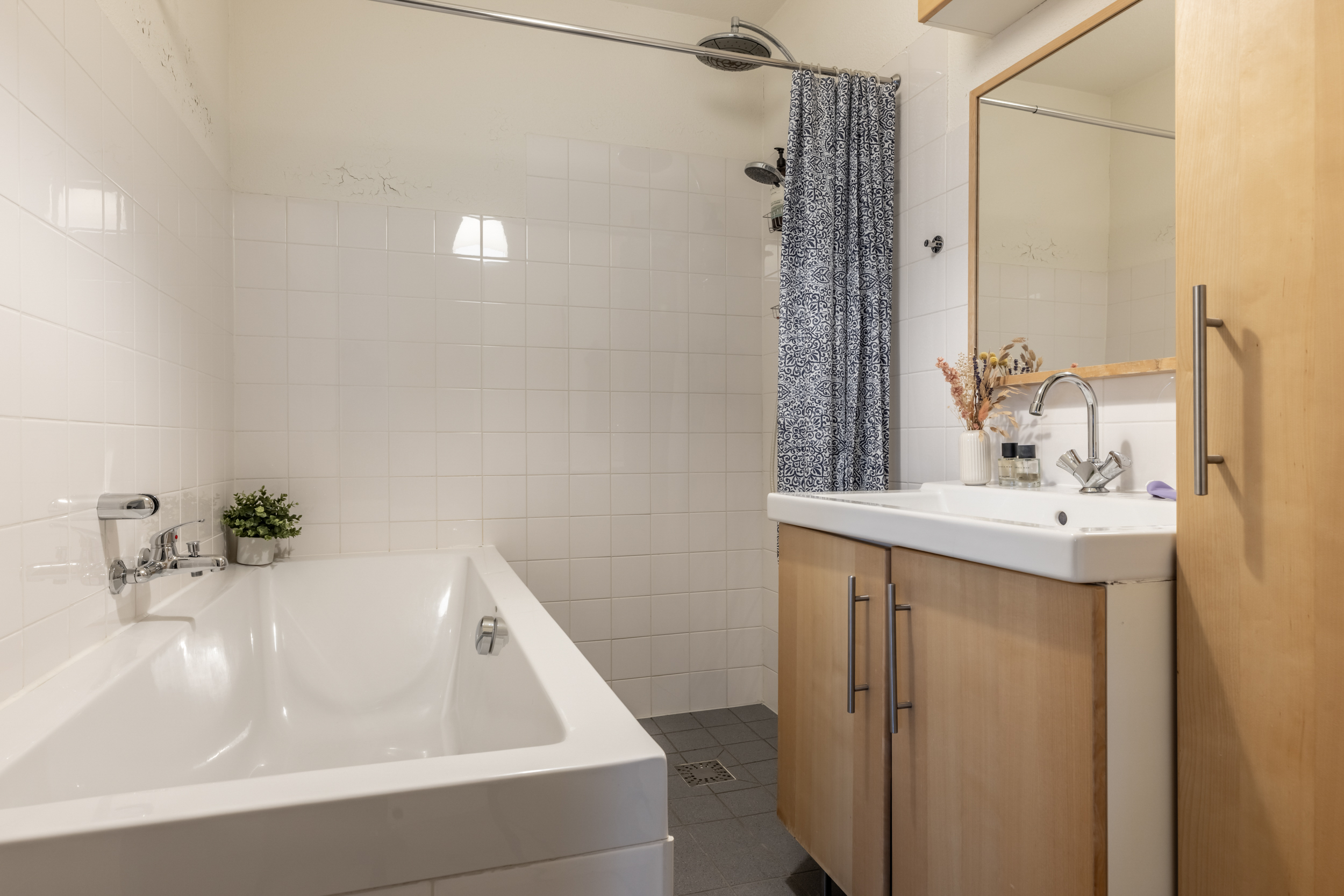 Op de tweede verdieping komt u binnen in de hal van het appartement. De hal geeft toegang tot alle ruimtes en biedt een nette garderobeplek. De woonkamer is gelegen aan de voorzijde en geniet door de grote ramen een prettig, licht en vrij uitzicht over het Slachthuisdistrict. Via de woonkamer bereikt u de open keuken, voorzien van een praktische indeling met voldoende werk- en kastruimte. De twee slaapkamers zijn gesitueerd aan de rustige achterzijde van de woning, waardoor u een vredige slaapomgeving heeft. De badkamer, via de hal bereikbaar, is uitgerust met een bad, separate douche en wastafel. De lichte laminaatvloer loopt door de meeste ruimtes en versterkt de frisse, tijdloze sfeer van het appartement. Vanuit de centrale hal is tevens toegang tot het gezamenlijk gebruikte dakterras, waar u heerlijk kunt vertoeven in de buitenlucht.