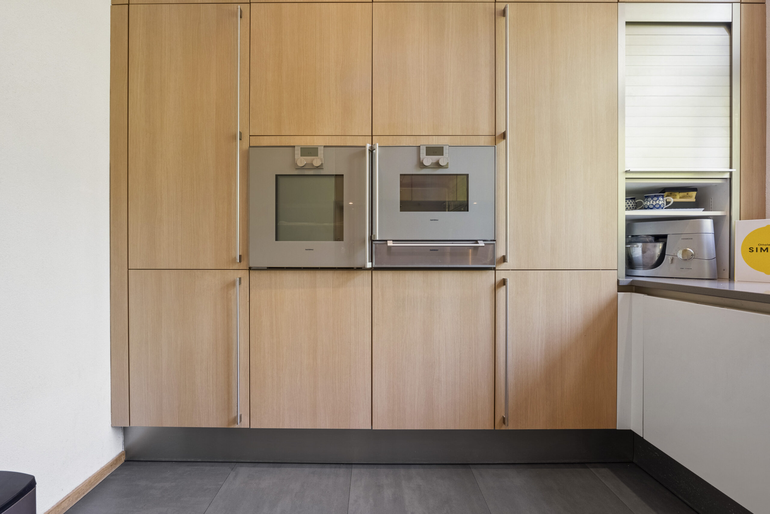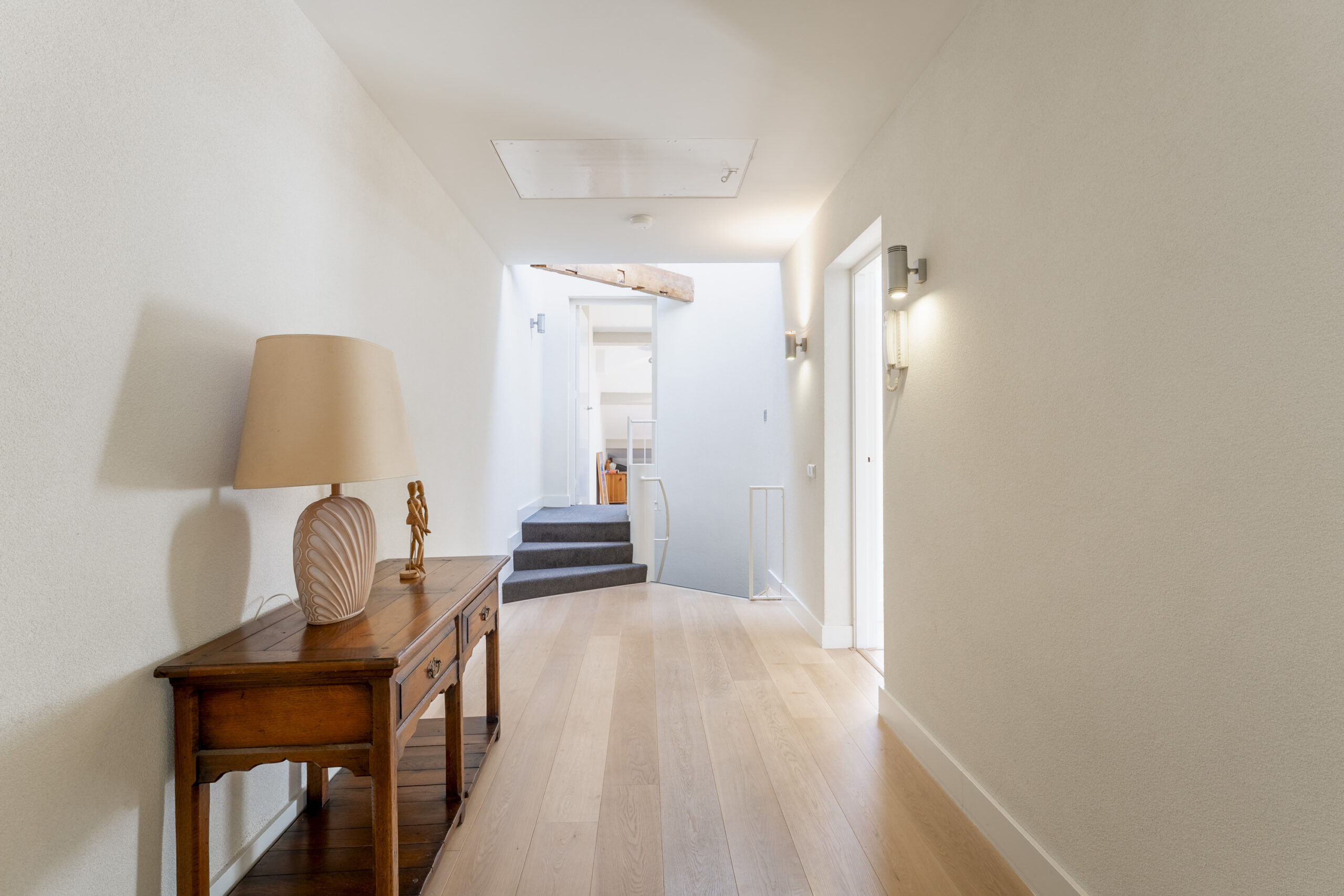 Parterre: entree, hal met garderobekast en modern zwevend toilet met fontein, woonkamer voorzien van gashaard en openslaande deuren naar tuin, moderne luxe keuken met diverse Gaggenau inbouwapparatuur en vloerverwarming, eetkamer met openslaande deuren naar terras/tuin en toegang naar inpandige berging, via hal trap naar…