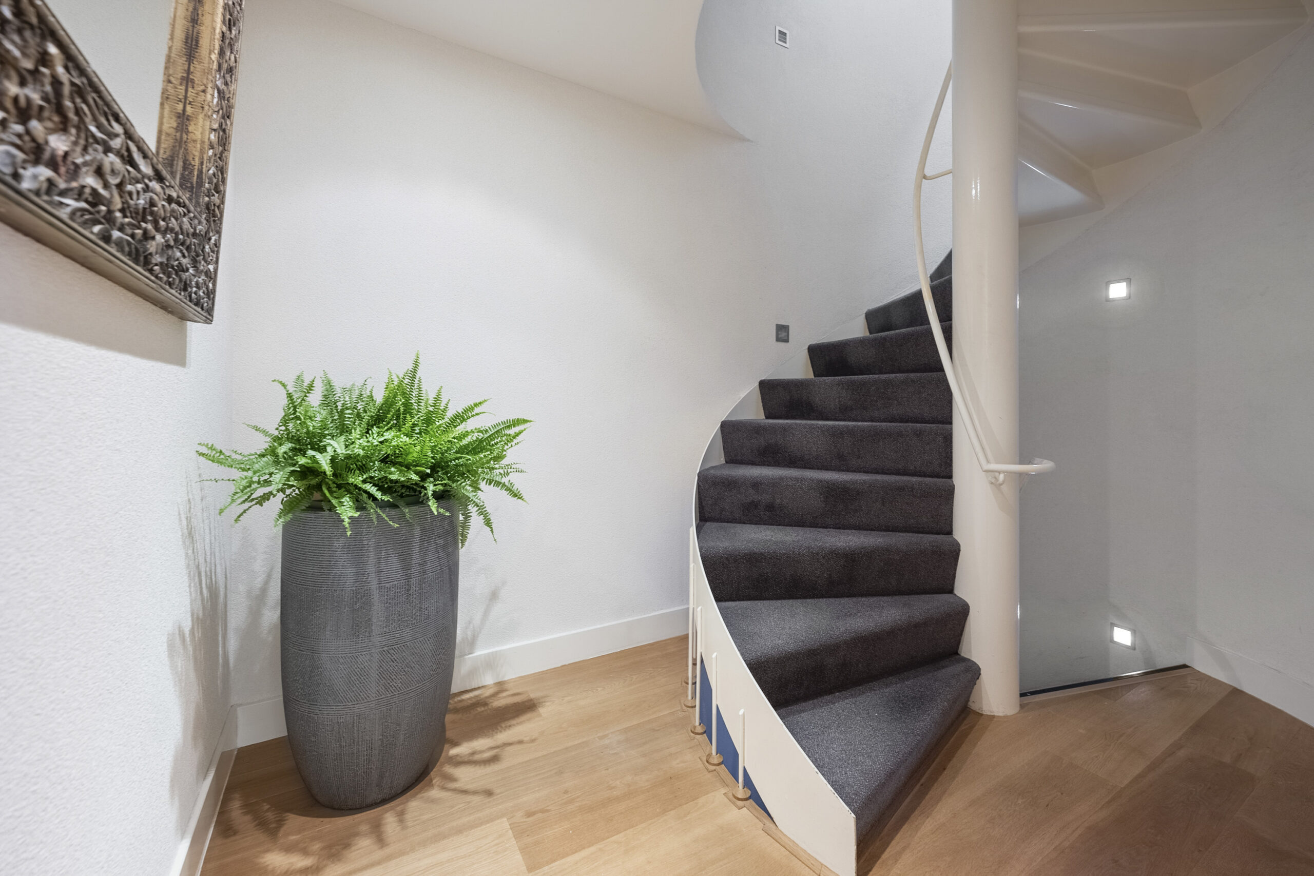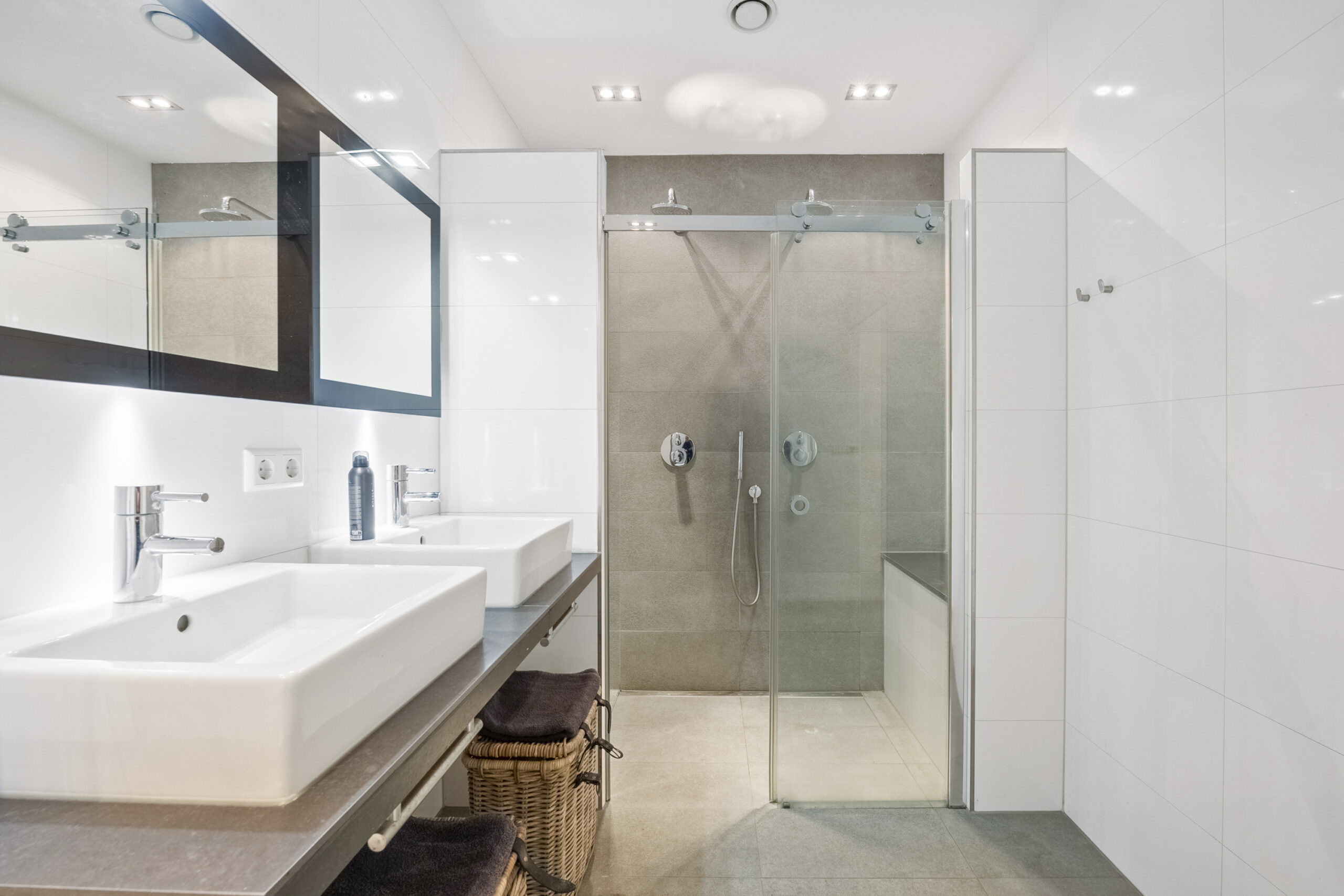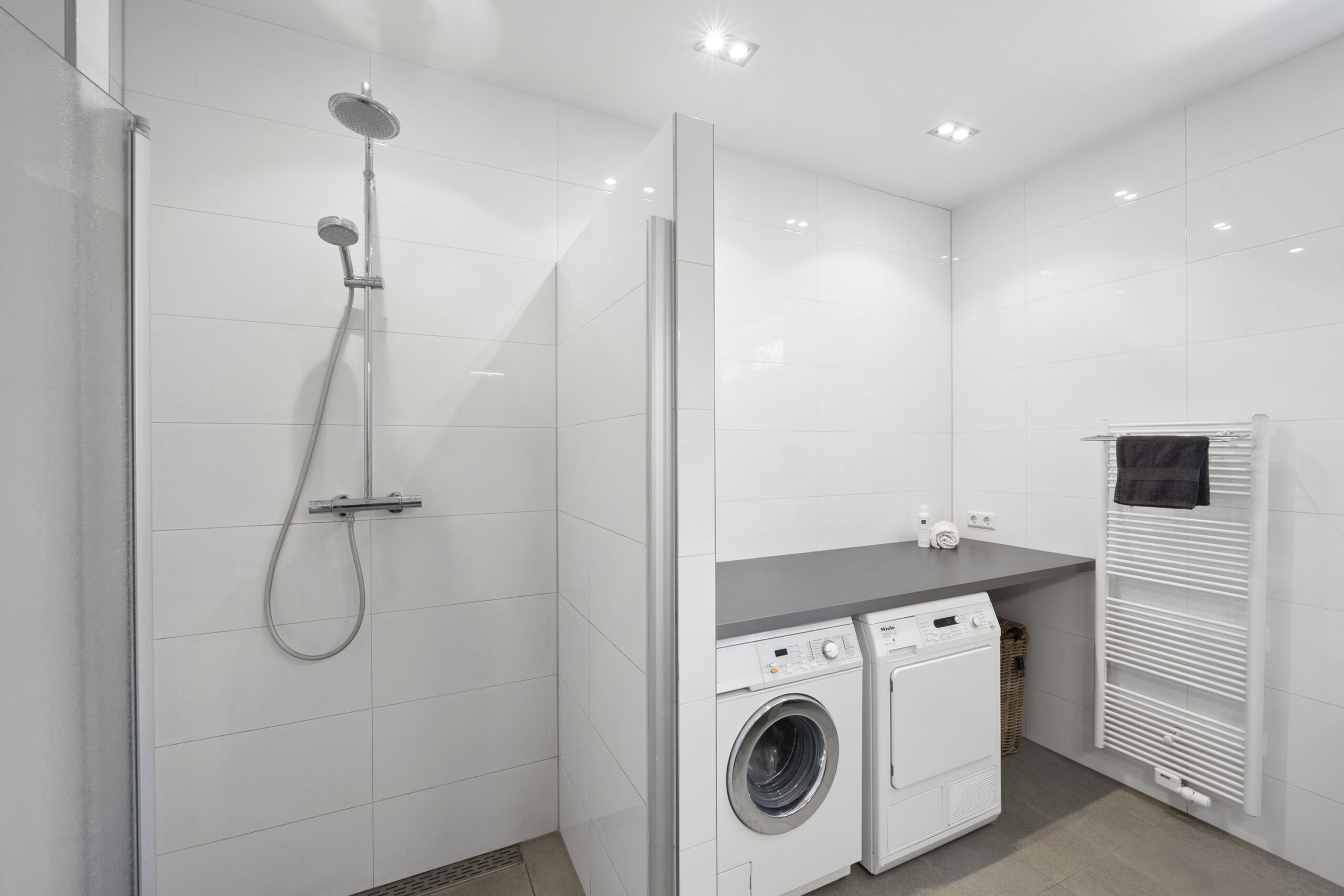 1e Verdieping: overloop, ouderslaapkamer met vaste kastenwand, deur naar loggia en eigen moderne badkamer voorzien van dubbele inloopdouche met handdouche en dubbele rainshower, dubbele wastafel, zwevend toilet, handdoekradiator en vloerverwarming, slaapkamer met deur naar balkon, zijkamer, 2e moderne badkamer voorzien van inloopdouche met handdouche en rainshower, meubel met dubbele wastafel, zwevend toilet en wasmachine/droger aansluiting, via overloop trap naar…