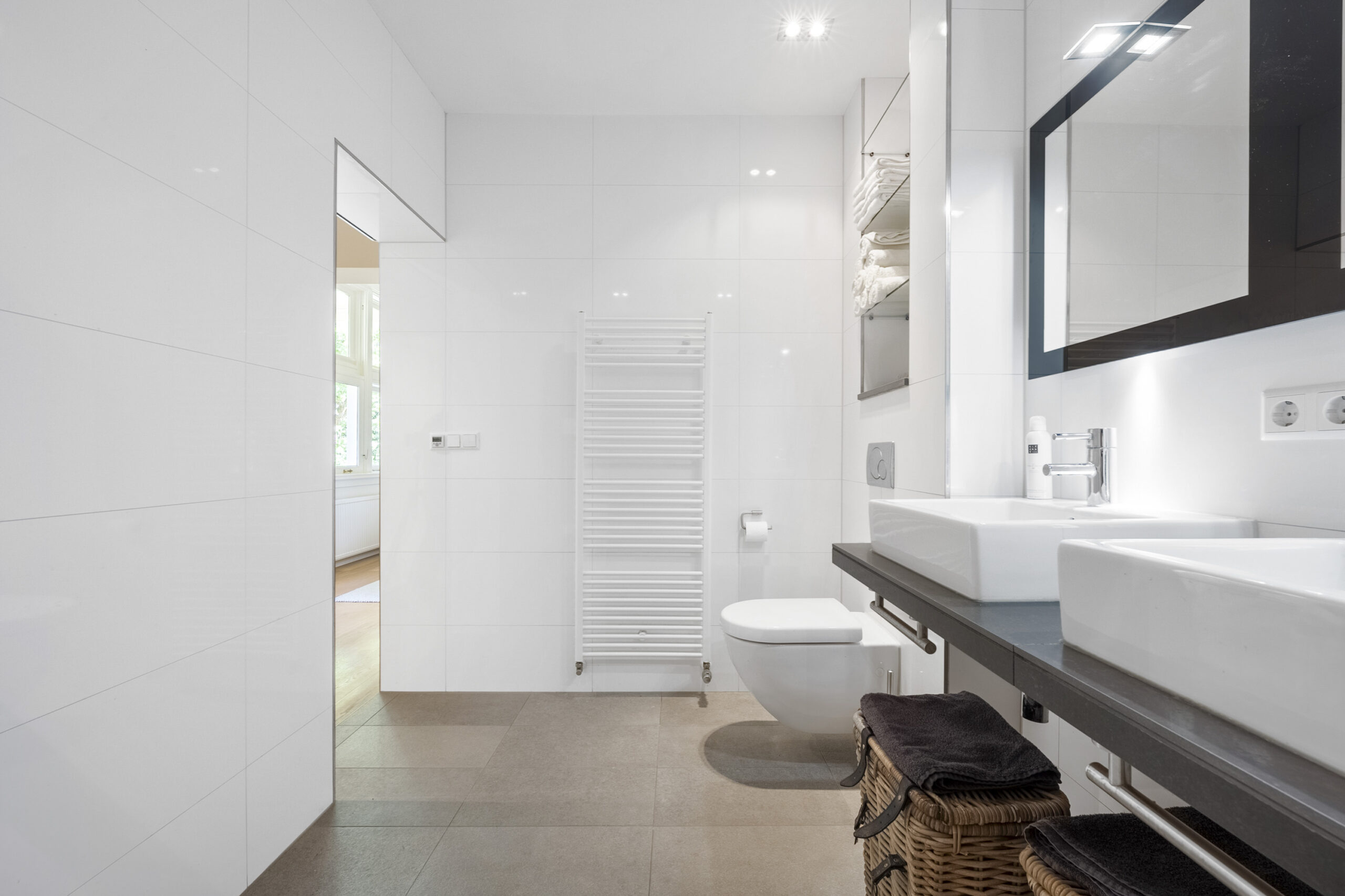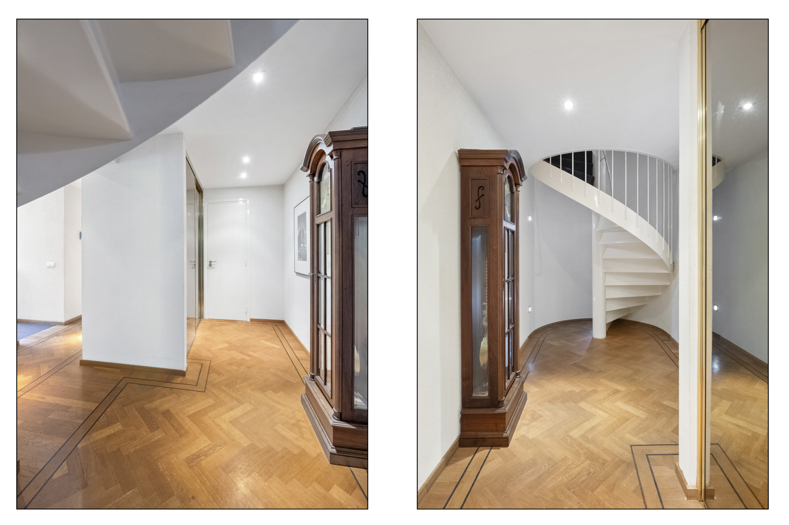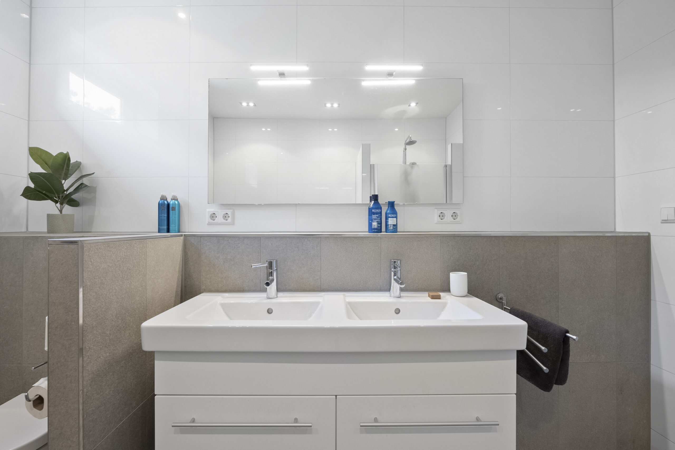 1e Verdieping: overloop, ouderslaapkamer met vaste kastenwand, deur naar loggia en eigen moderne badkamer voorzien van dubbele inloopdouche met handdouche en dubbele rainshower, dubbele wastafel, zwevend toilet, handdoekradiator en vloerverwarming, slaapkamer met deur naar balkon, zijkamer, 2e moderne badkamer voorzien van inloopdouche met handdouche en rainshower, meubel met dubbele wastafel, zwevend toilet en wasmachine/droger aansluiting, via overloop trap naar…