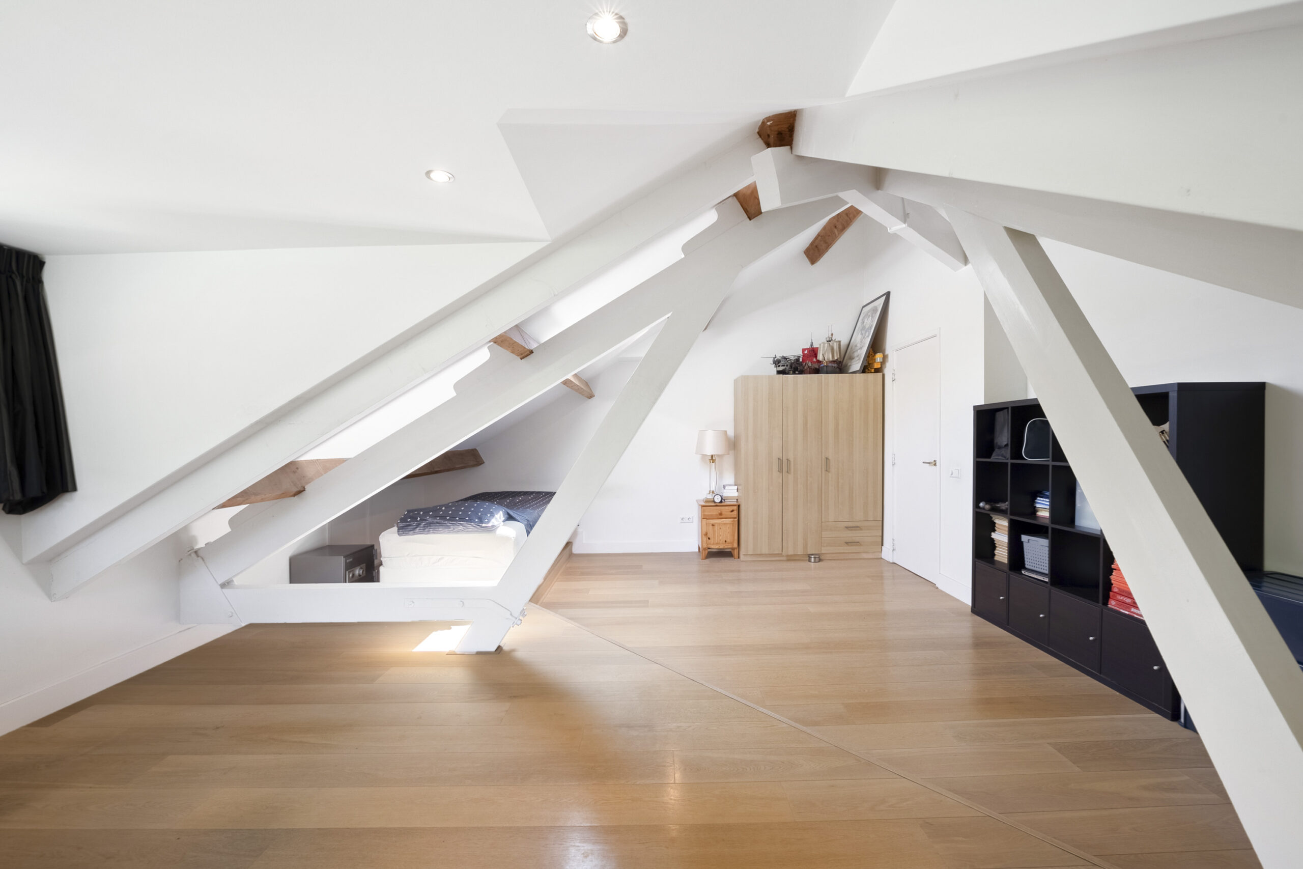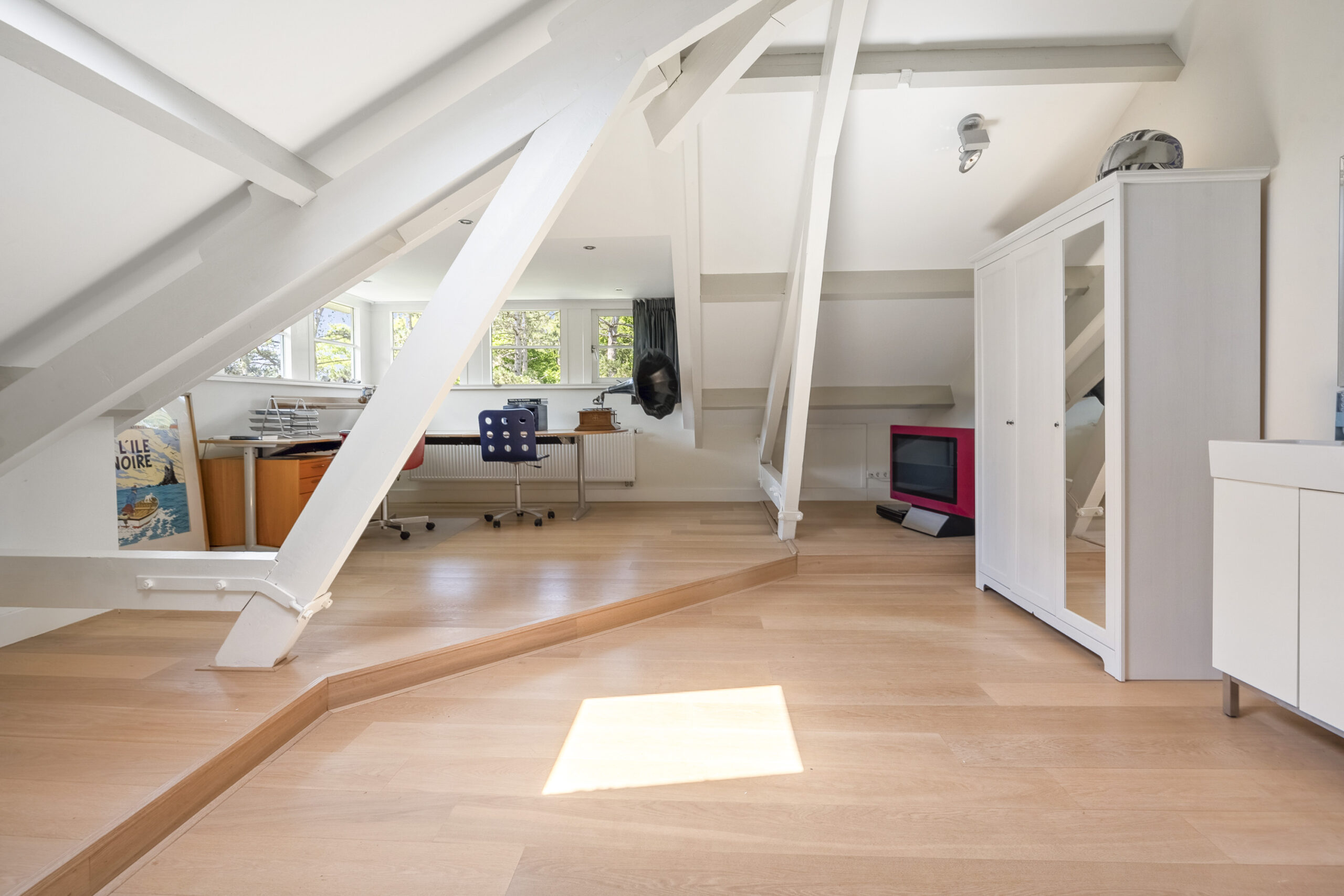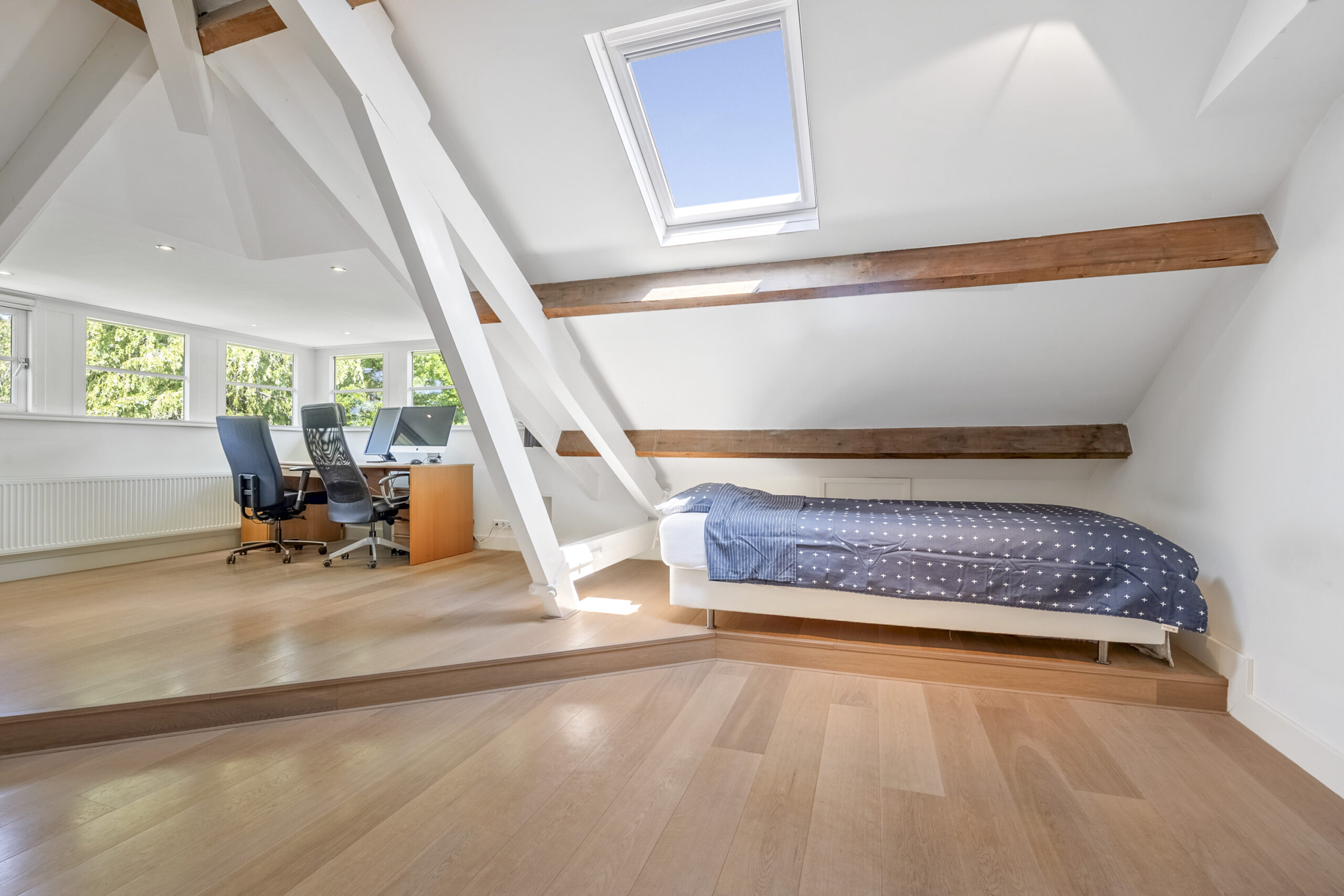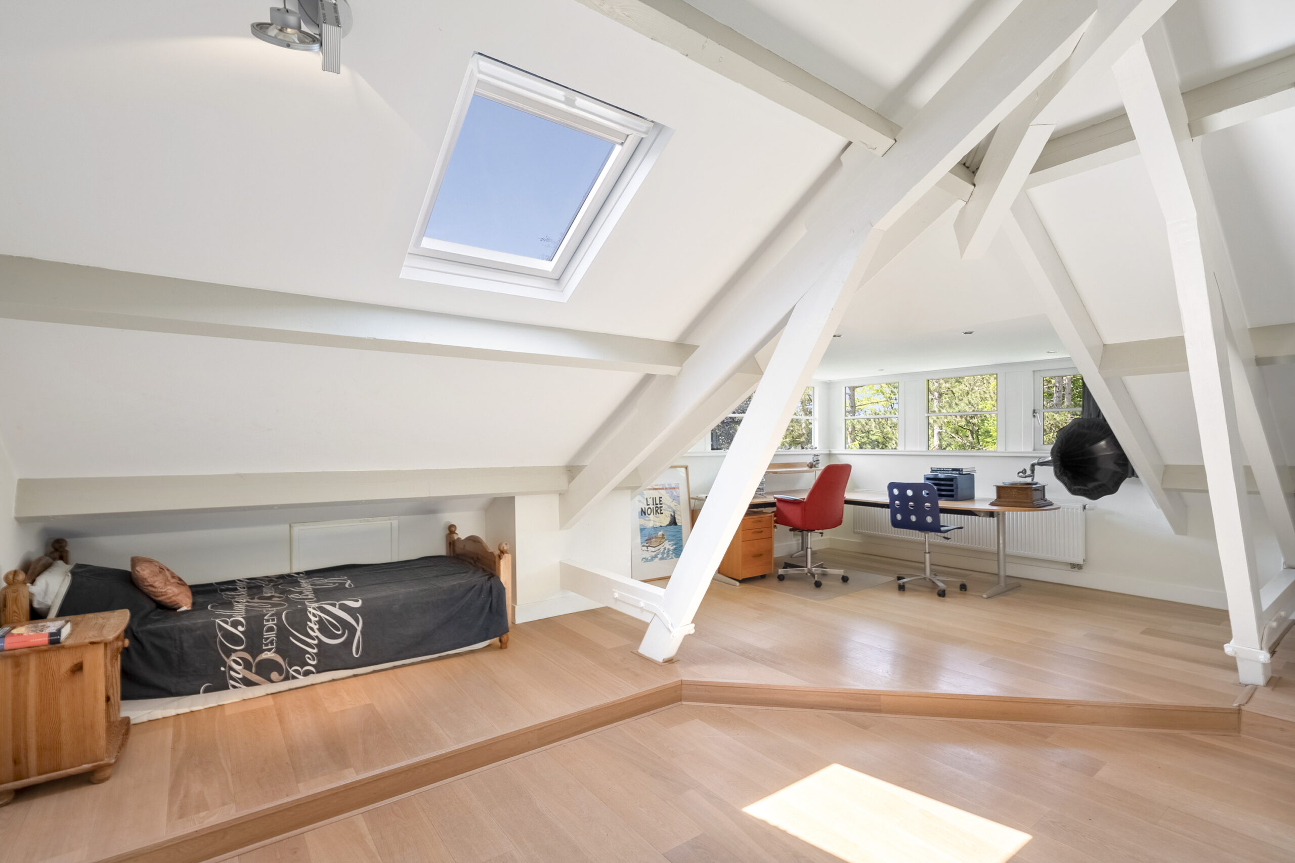 2e Verdieping: overloop met dakraam en vlizotrap naar bergvliering voorzien van cv-ketel en warmtepomp, slaapkamer met extra dakraam, zijkamer voorzien van extra diepe vaste kasten, 2 extra dakramen en wastafel, slaapkamer met extra dakraam en wastafelmeubel
