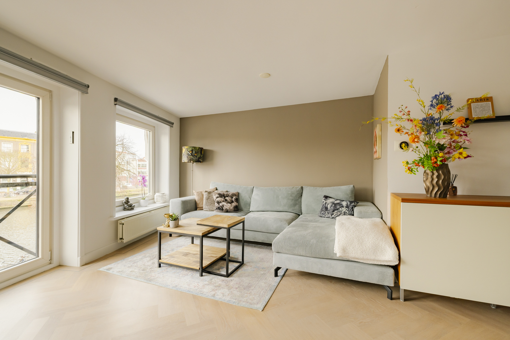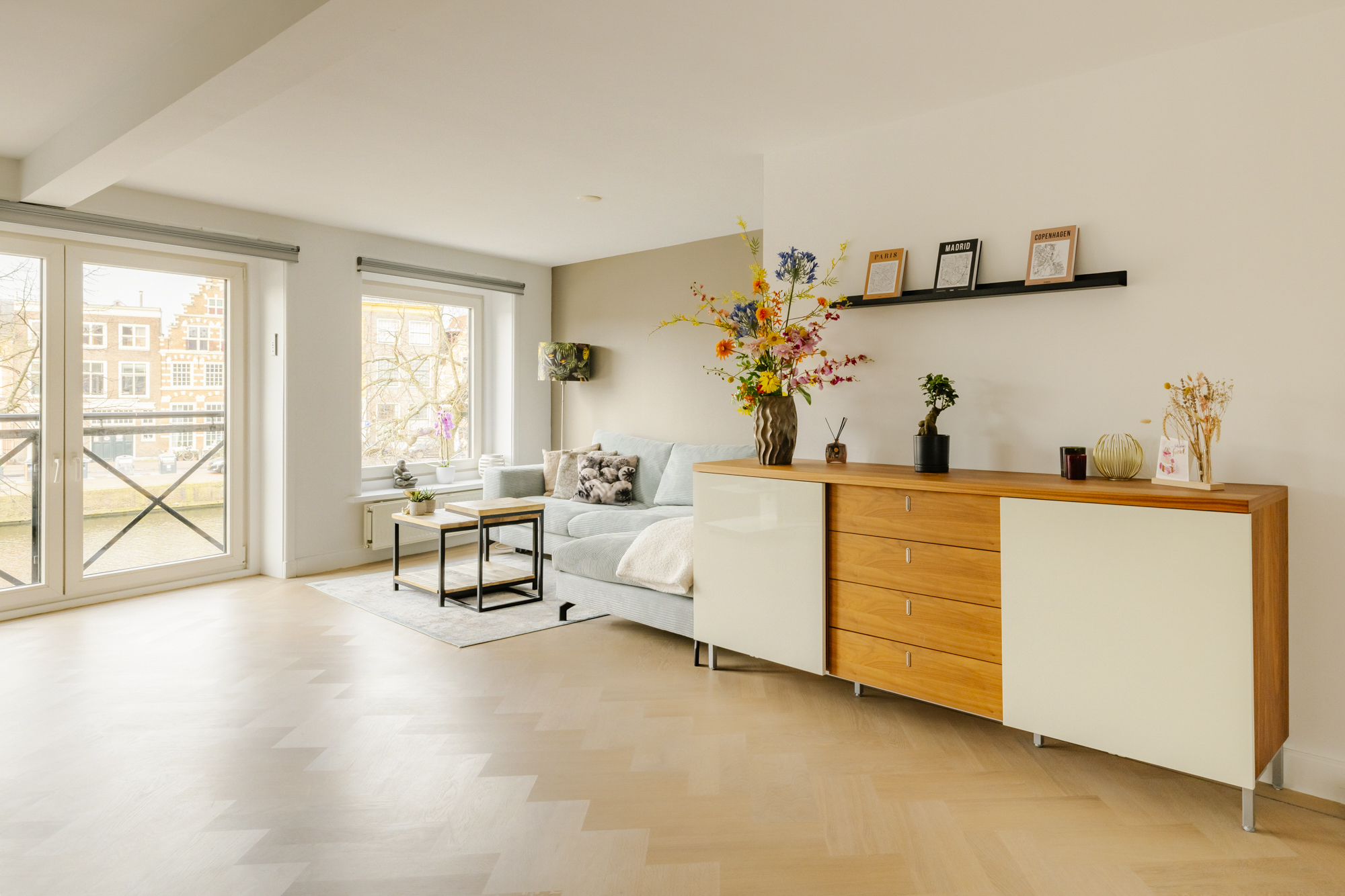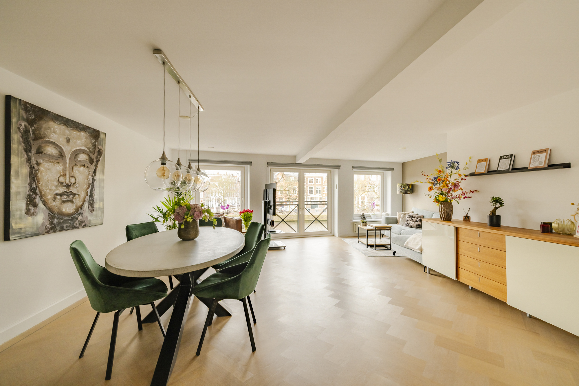 De eikenhouten vloerdelen, openslaande deuren en het Franse balkon versterken het lichte en stijlvolle karakter van de ruimte.