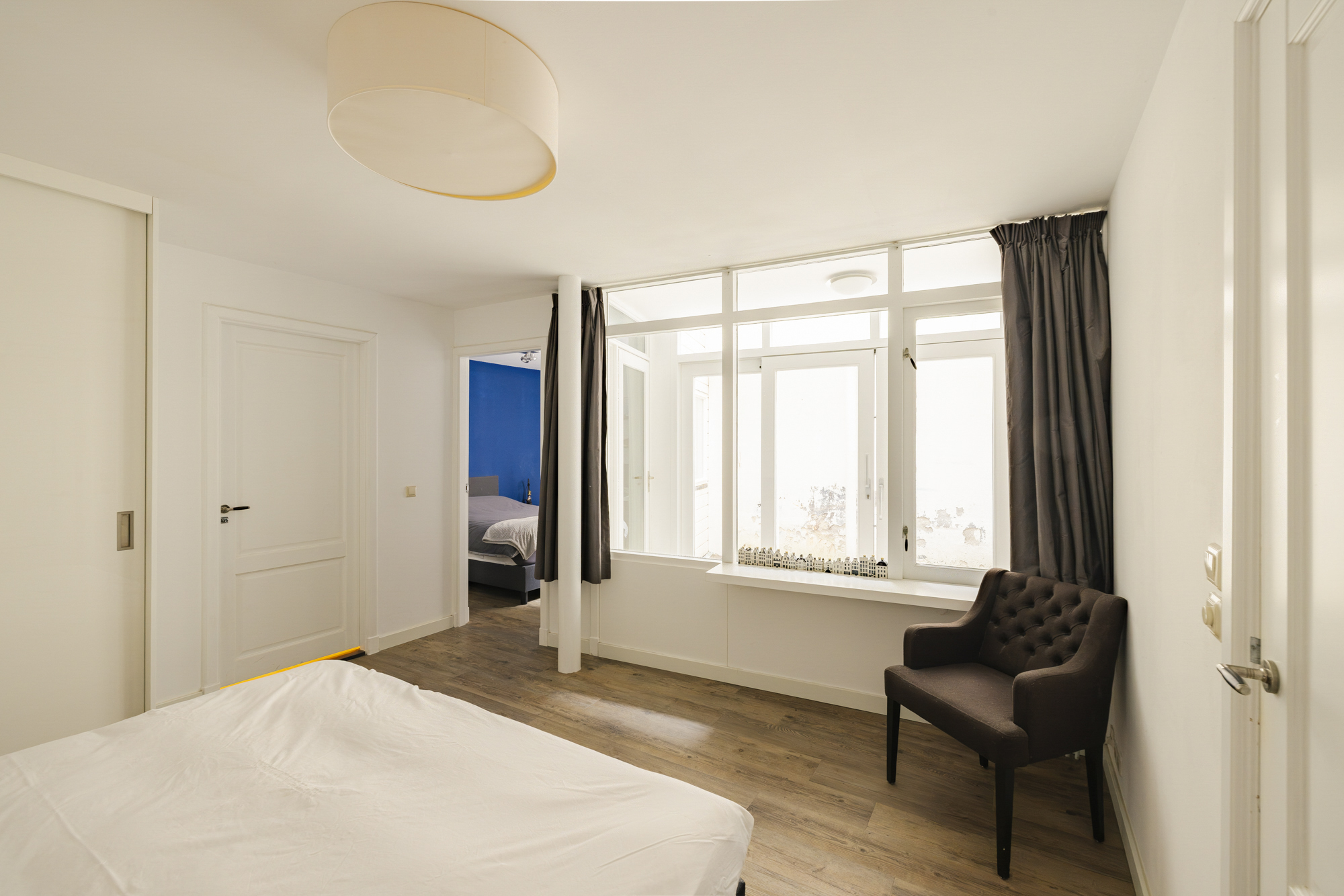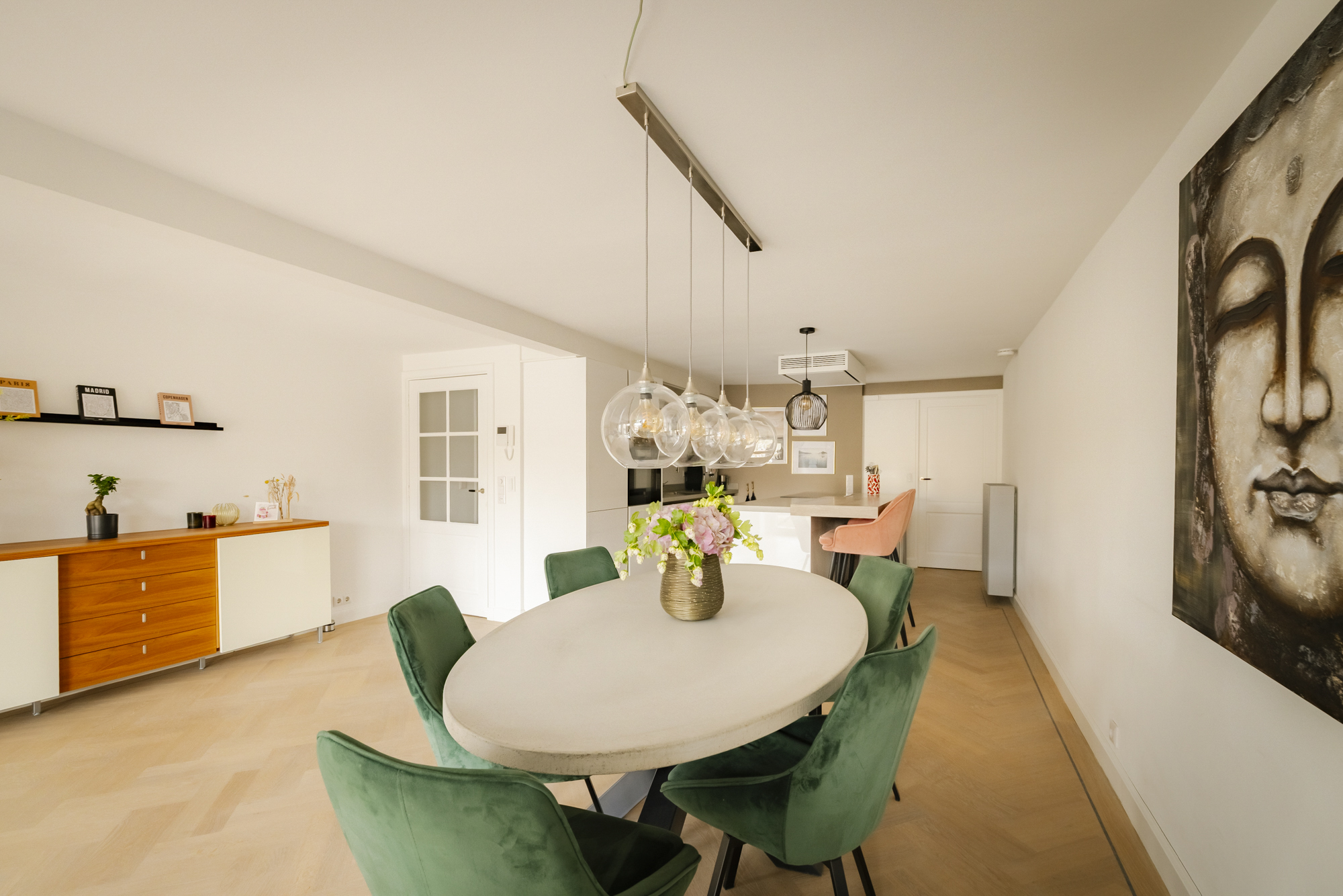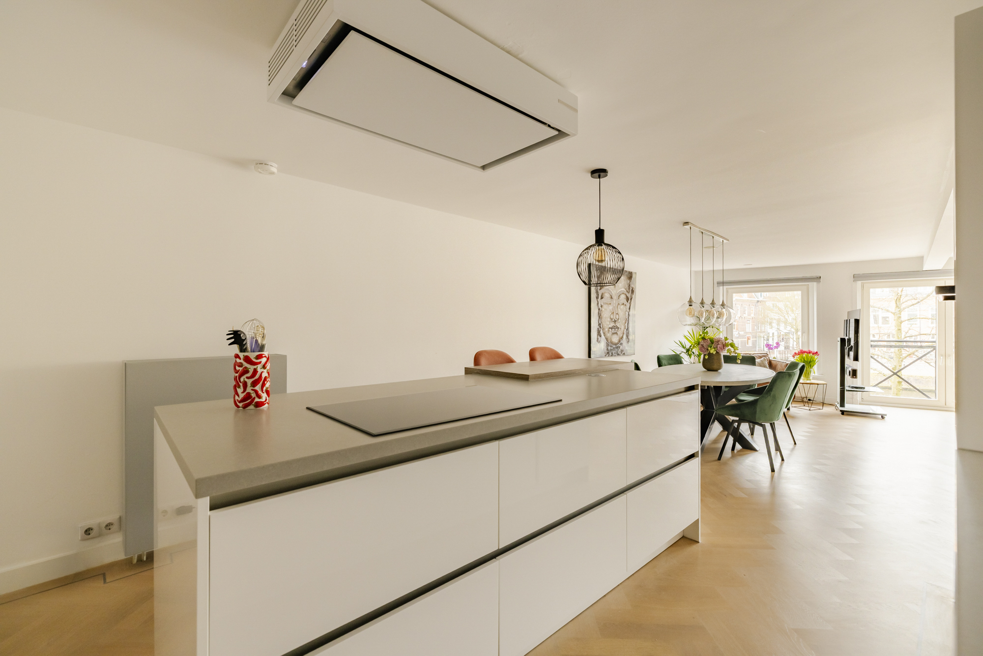 De eikenhouten vloerdelen, openslaande deuren en het Franse balkon versterken het lichte en stijlvolle karakter van de ruimte.