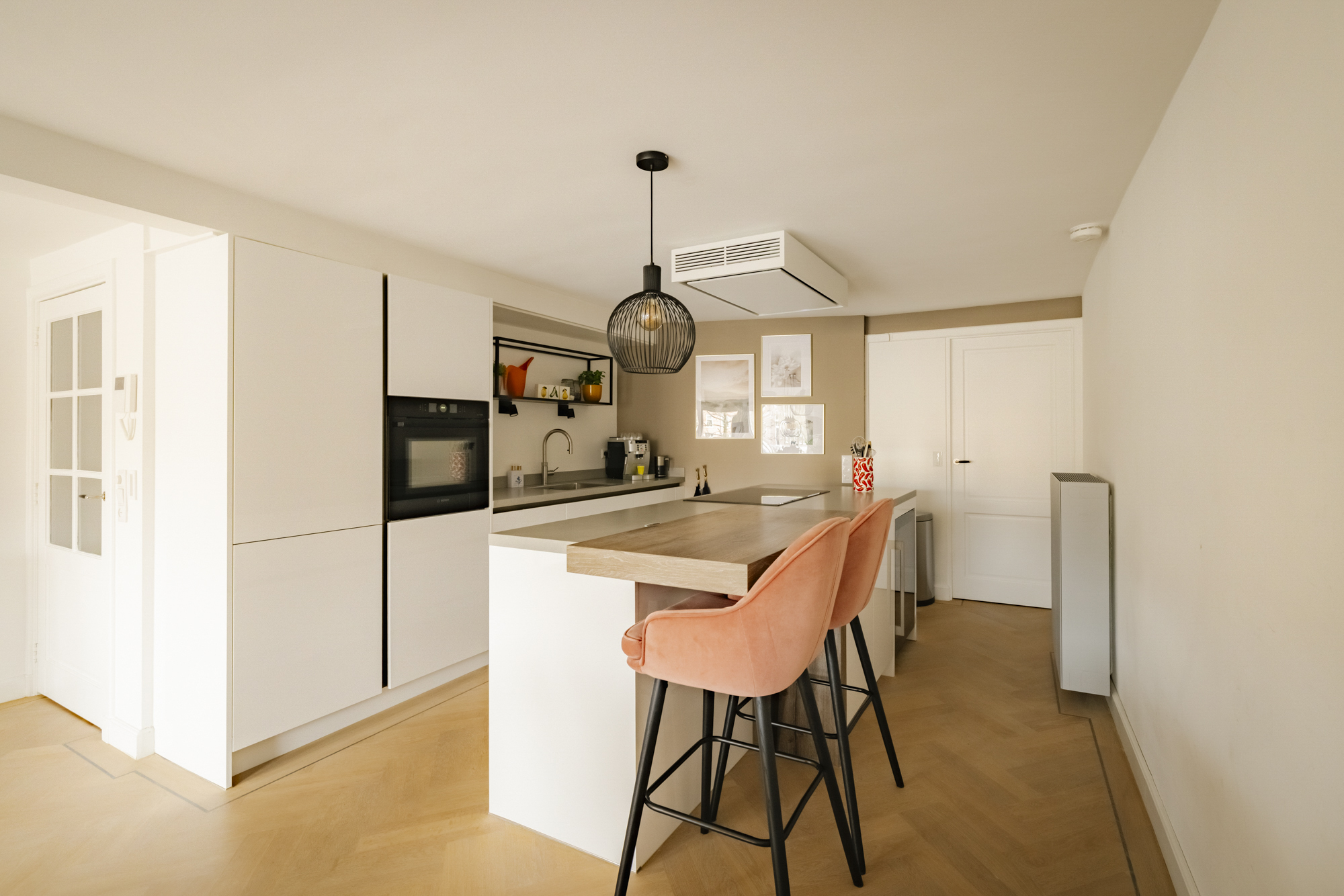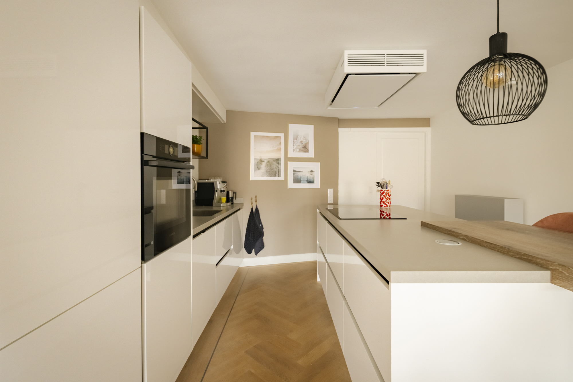 Aan de achterzijde bevindt zich de moderne open woonkeuken met een heerlijk kookeiland (2021), voorzien van uiterst hoogwaardige en slimme inbouwapparatuur van Bosch. Een fijne plek om te koken en te tafelen.