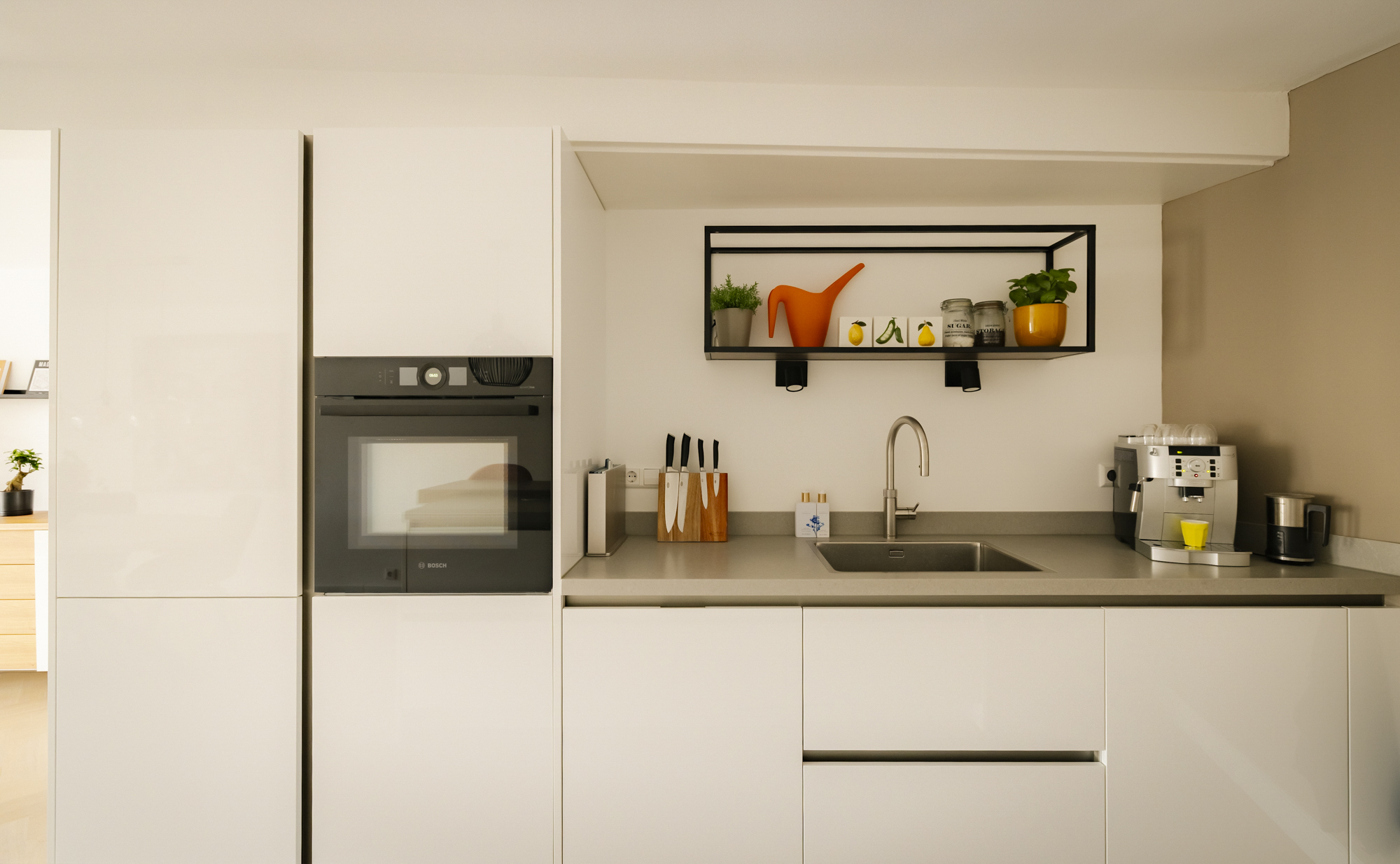 At the rear is the modern open-plan kitchen with a delightful cooking island (2021), equipped with high-quality, smart built-in appliances from Bosch. A lovely place to cook and dine.