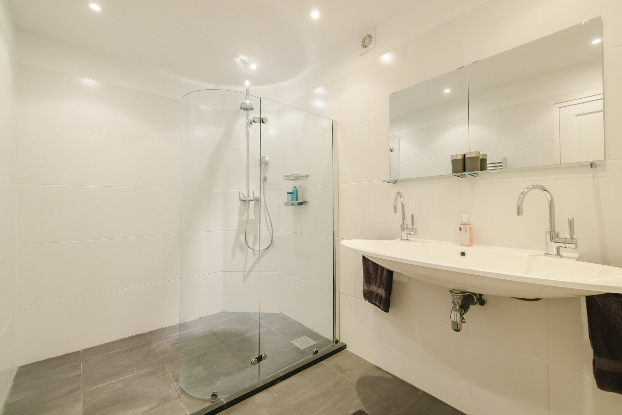 De ruime badkamer is uitgerust met een inloopdouche en dubbele wastafel. Daarnaast is er een aparte berging met vaste kast, cv-opstelling en extra ruimte voor was-/droog apparatuur.
