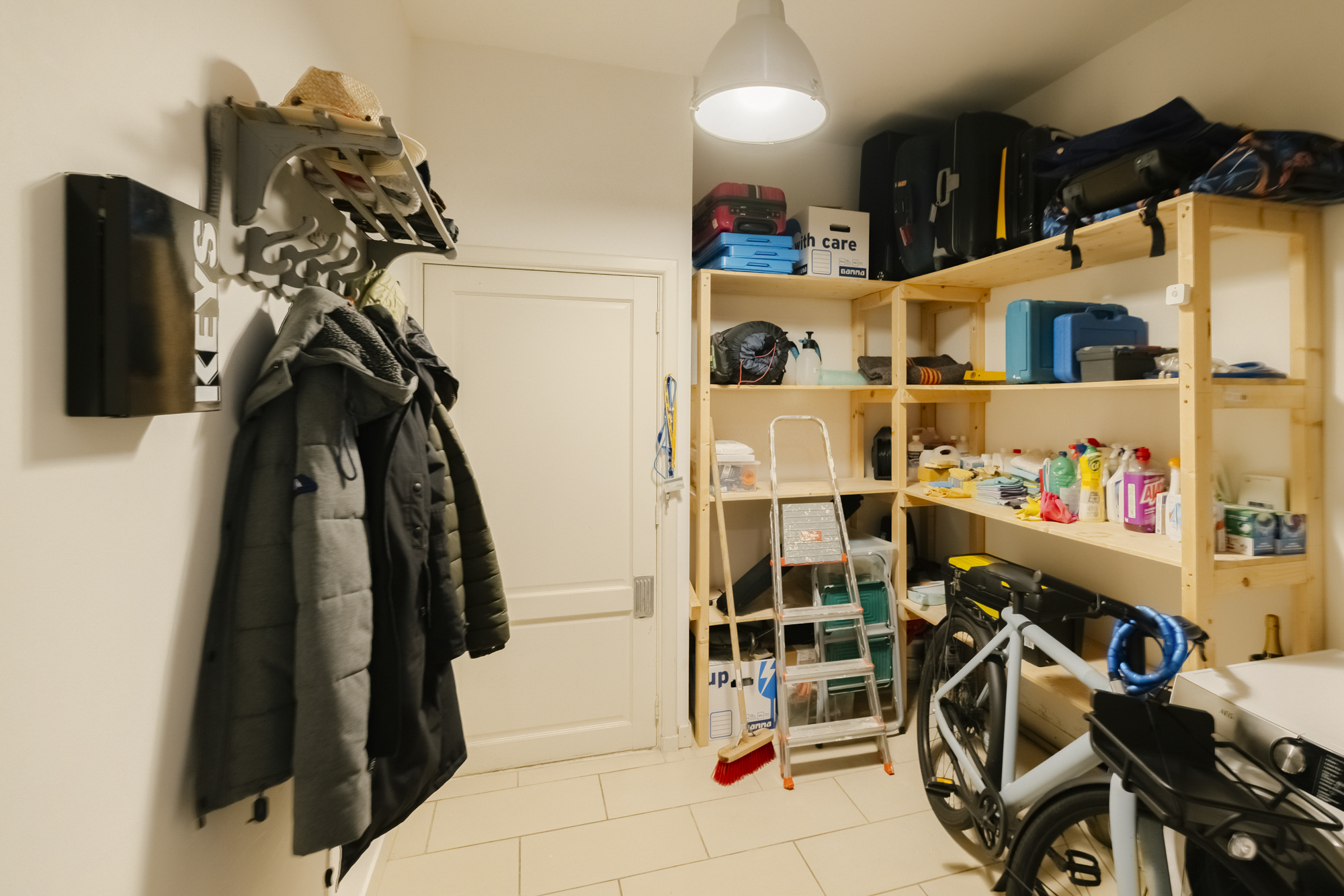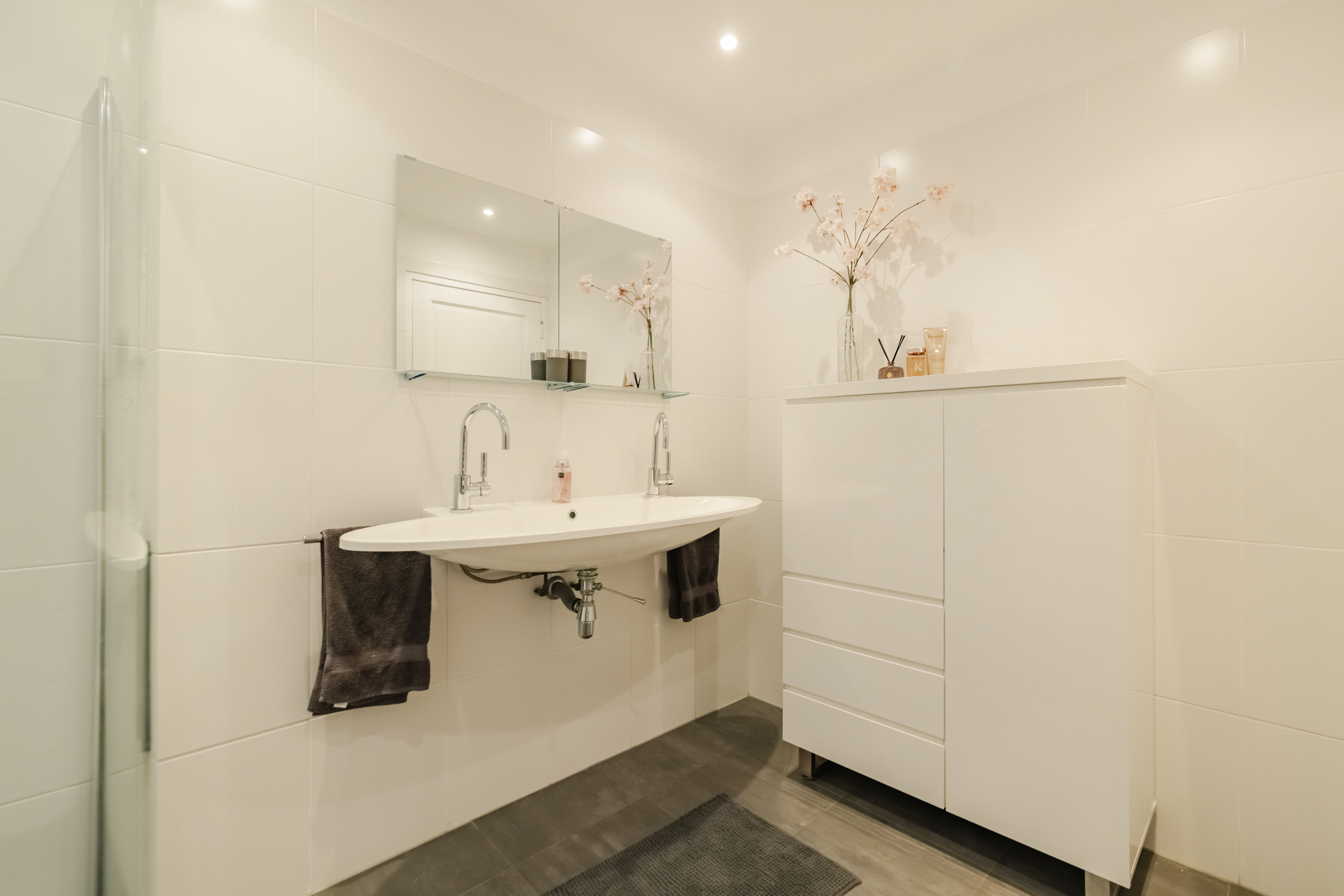 The spacious bathroom is equipped with a walk-in shower and double sink. There is also a separate storage room with a built-in cupboard, central heating system and extra space for washing/drying appliances.