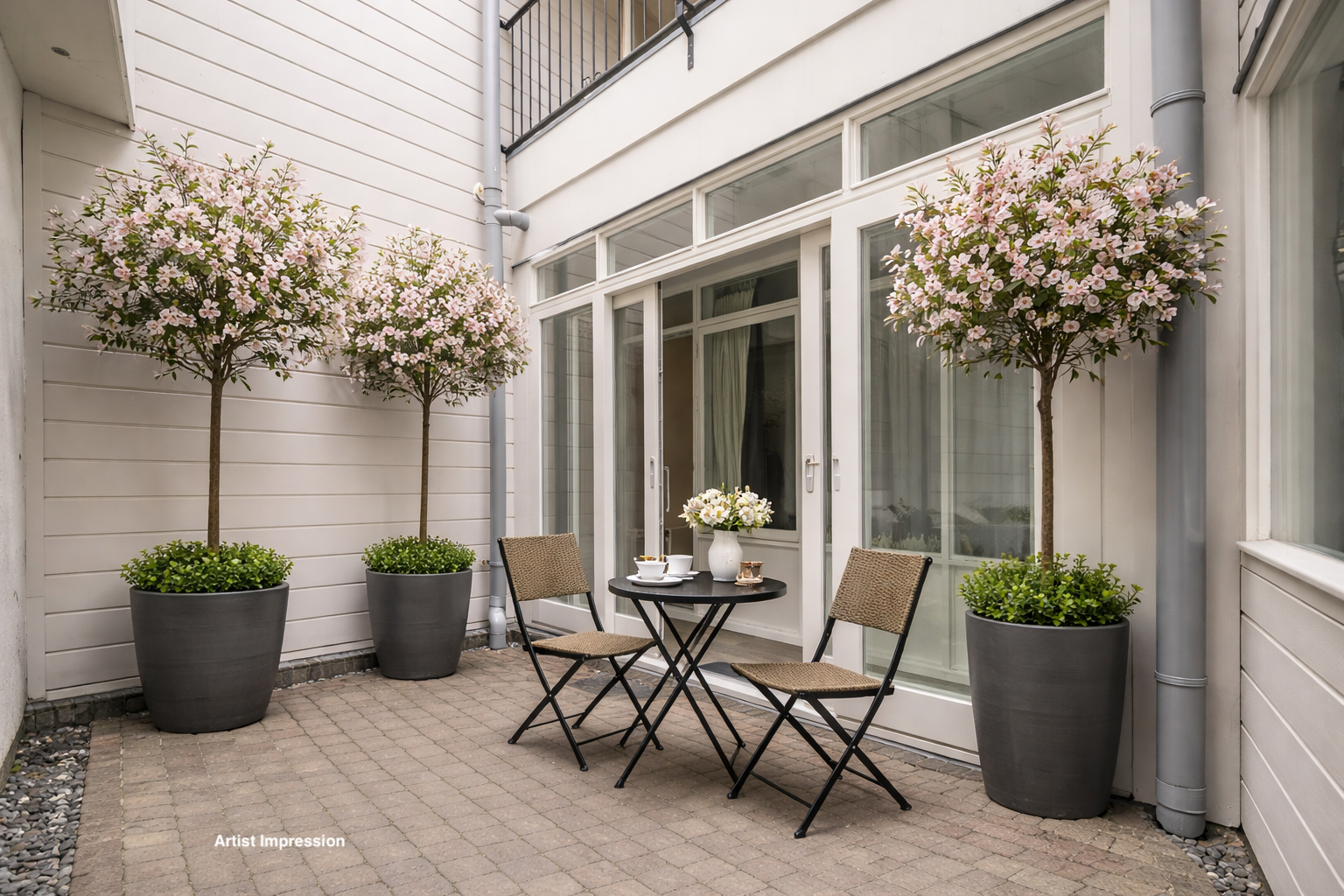 The spacious master bedroom provides access to the patio/atrium garden via a corridor — a quiet and sheltered outdoor space. The second bedroom can be used as a multifunctional space, such as a study, guest room or dressing room. Both rooms have built-in wardrobes and are separately accessible via the hall. The many windows allow plenty of natural light into both bedrooms.
