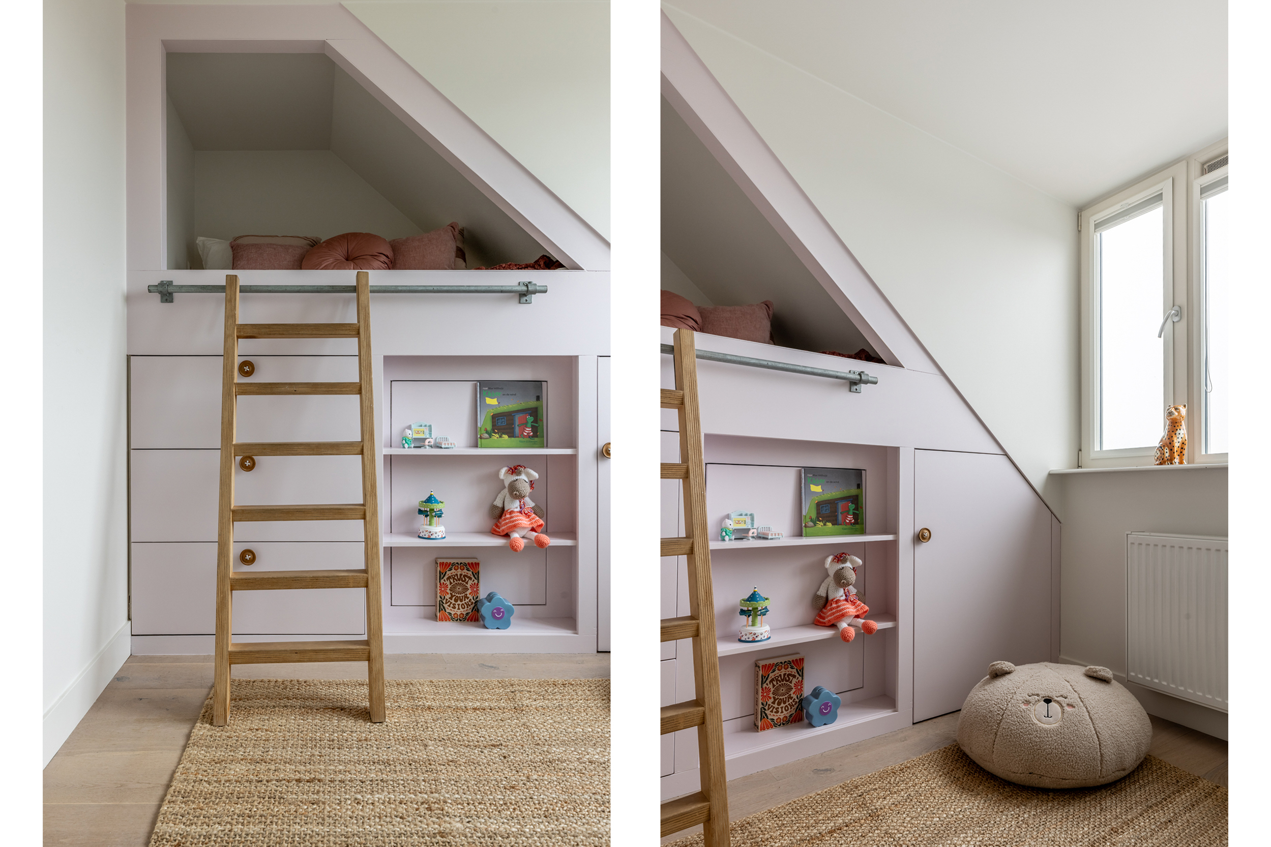 2nd floor: spacious landing with cupboards for washing machine/dryer and central heating boiler, bathroom at the rear with toilet, shower, and sink, two large bedrooms with fixed raised beds with play/cupboard space incorporated for optimal use of space.