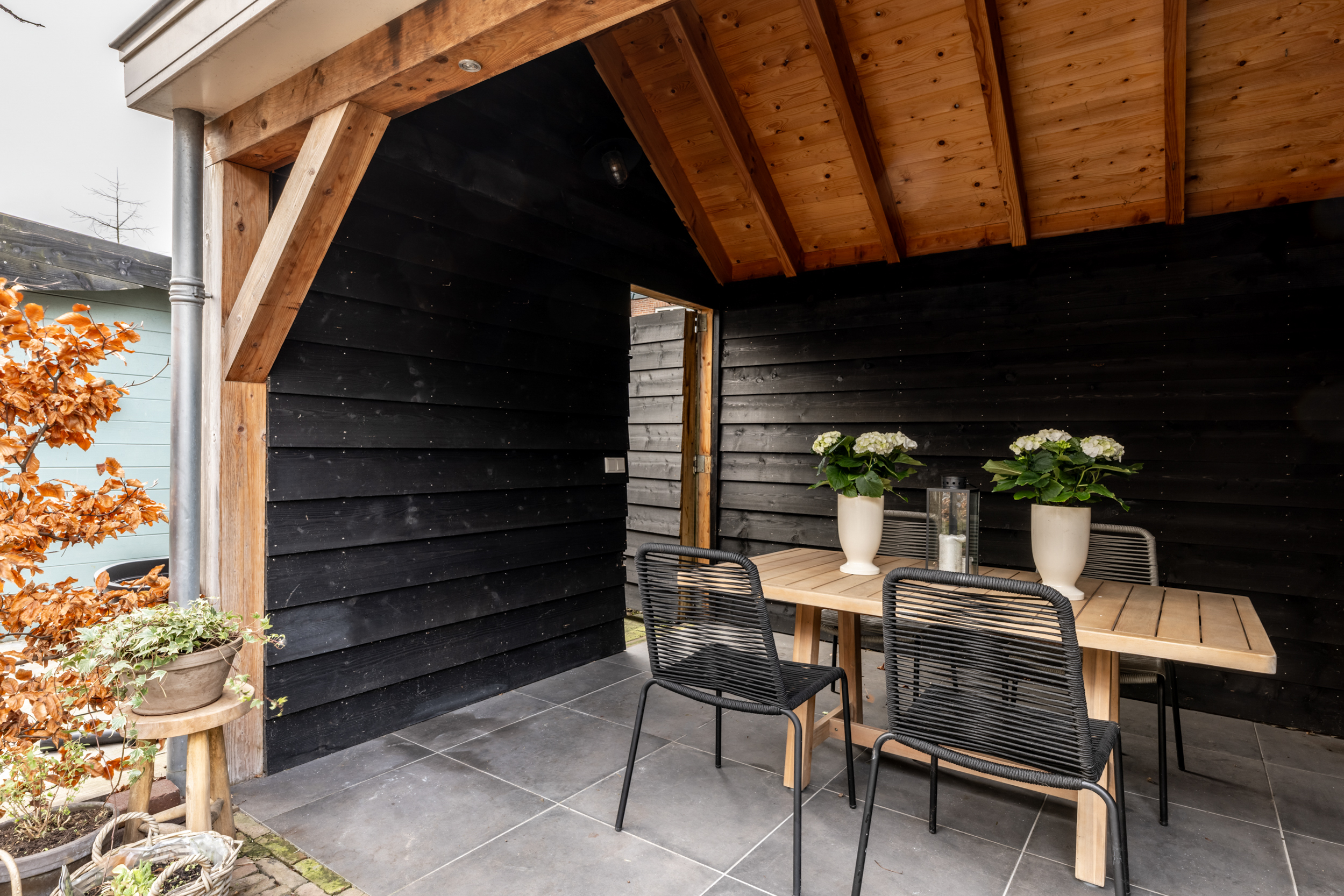 Ground floor: entrance hall with meter cupboard and toilet, dining room in the bay window, luxury kitchen (including Quooker) centrally located in the living area, spacious storage cupboard/pantry, at the rear of the house a spacious living room across the entire width with a built-in wood-burning stove and wide doors with lots of glass to the garden. Sunny backyard with beautiful storage shed/veranda and back entrance.