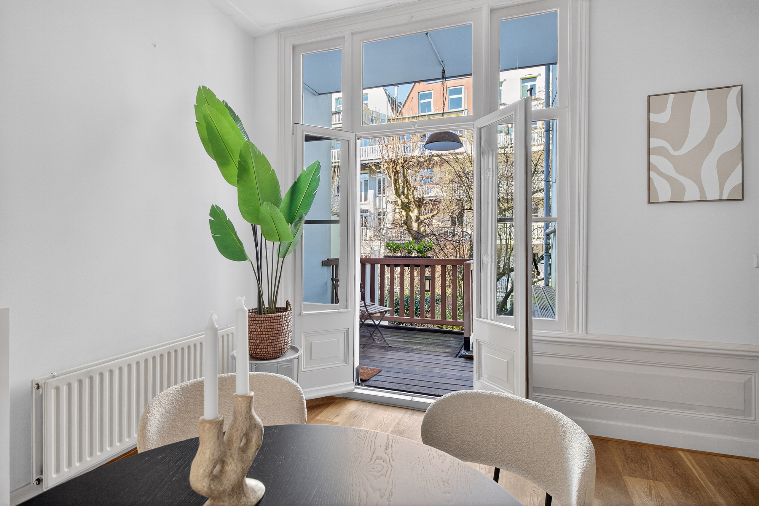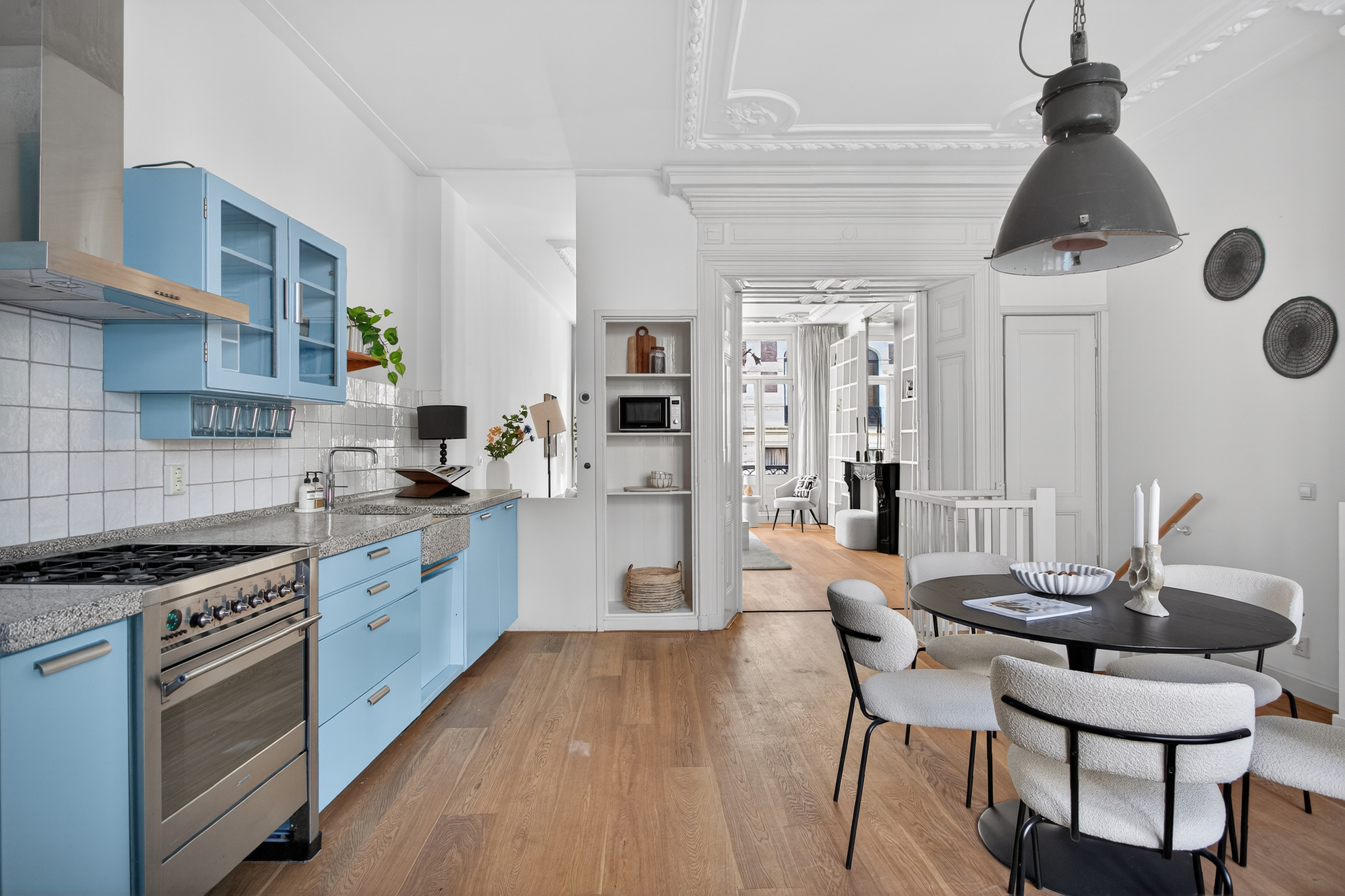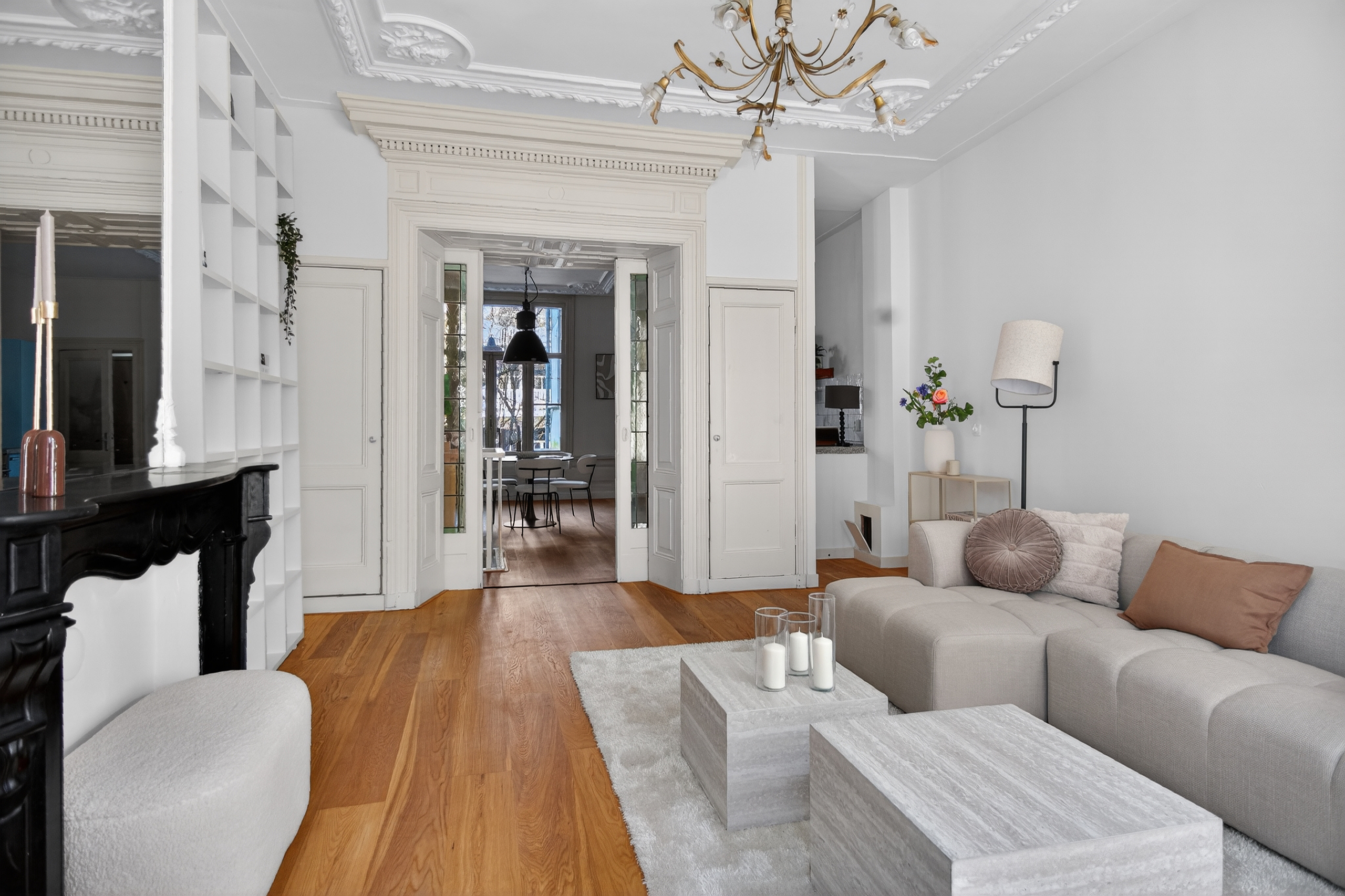 With a beautiful wooden floor throughout the entire home, custom-made curtains, stylish built-in cabinets, and many original details, the character of this apartment truly stands out. The combination of a bright living room at the front with two French balconies and a dining room with an open kitchen at the rear creates an ideal layout and a pleasant connection to the outdoor space.
