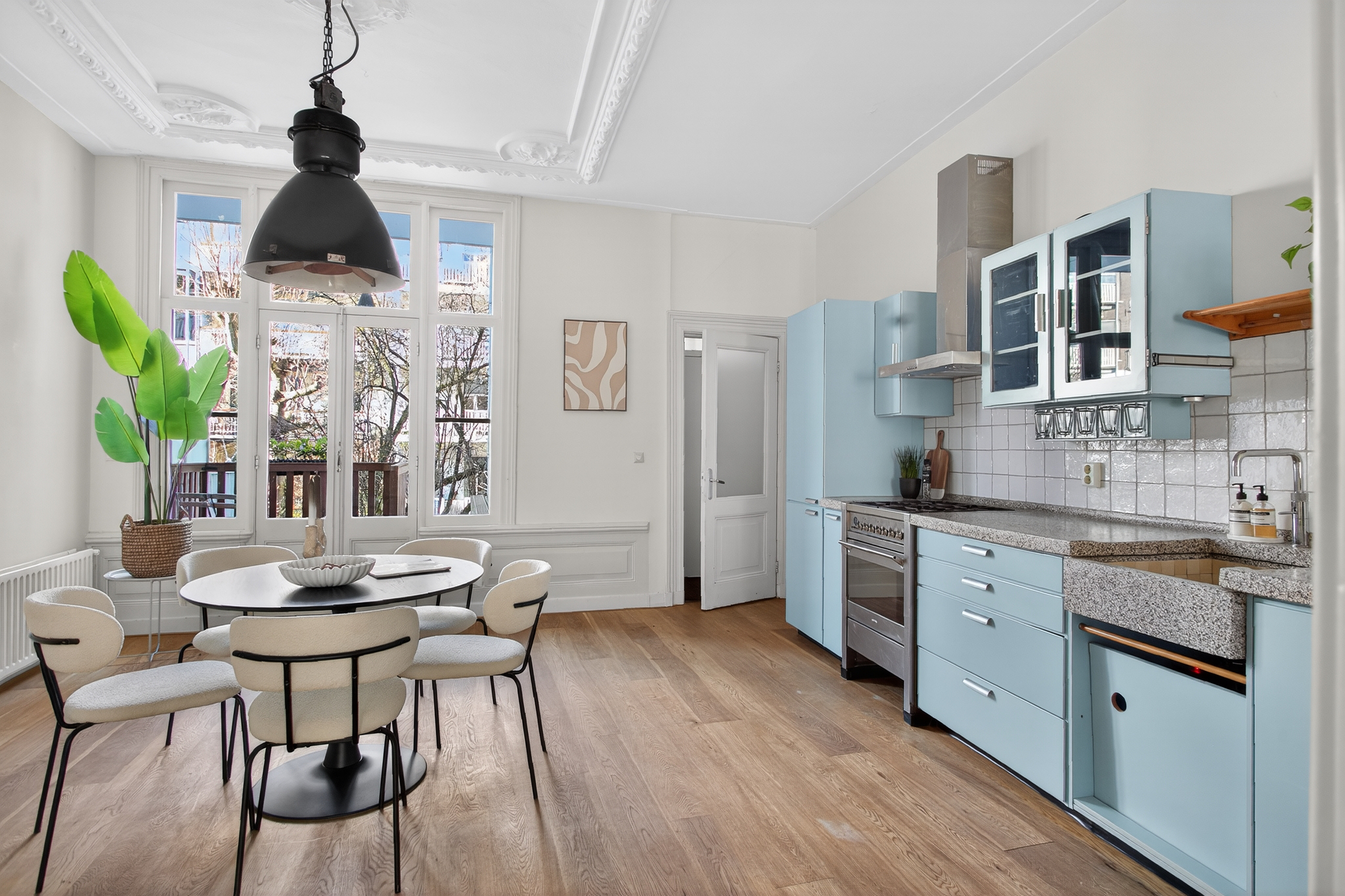 The first floor, with ceilings over 3 meters high, creates a very spacious feel. Here you will find the open kitchen, finished in a charming blue color with a granito countertop. The kitchen is equipped with a SMEG gas stove with oven. Through the double-glazed French doors you have access from the dining room/kitchen to the terrace. From the terrace, a staircase leads down to the garden, beautifully connecting indoor and outdoor living.